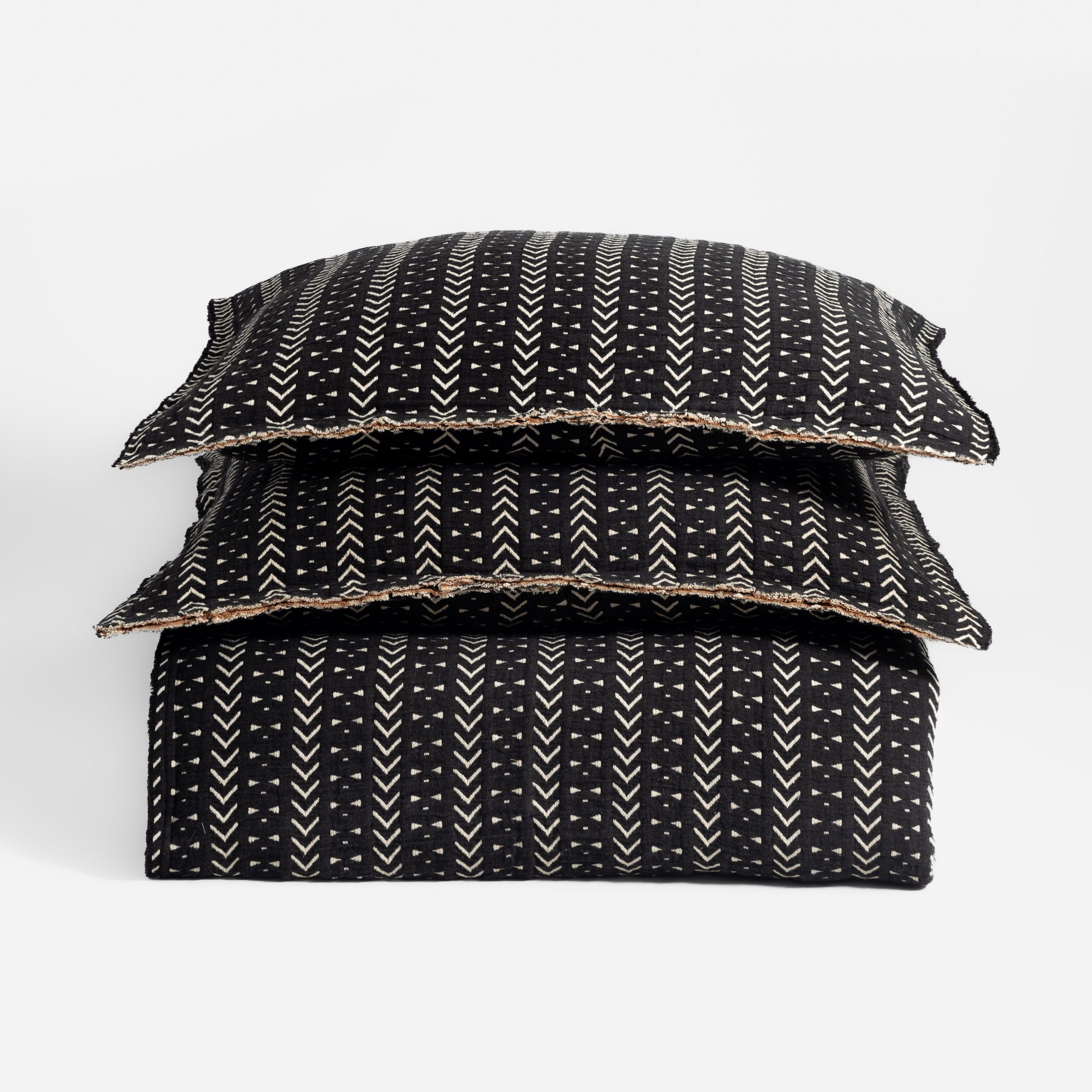 Inspired by traditional African mud cloth motifs, and constructed of soft cotton this coverlet reverses from rich black to weathered bronze. All four edges are finished with a hand frayed eyelash edge for a rugged, collected feel.