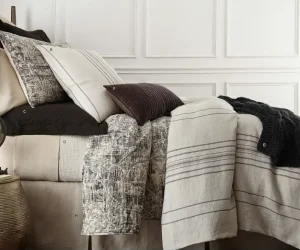 This ensemble exudes casual simplicity without compromising on style. The Gibbons coverlet is a soft cotton double cloth that reverses from one geometric pattern in natural and ivory to another unique pattern in a grey green tone that blends with so many popular green hues. Here the Gibbons is tossed casually across the foot of the bed to add texture and interest, or it can be used as the first layer on either side as a light weight sleeping layer. The Dalton quilt with its lofty fill adds a cuddly soft component. Adding solid accents of cotton velvet (Sloan) and a slubby linen (Preston) add depth in tone and texture.
