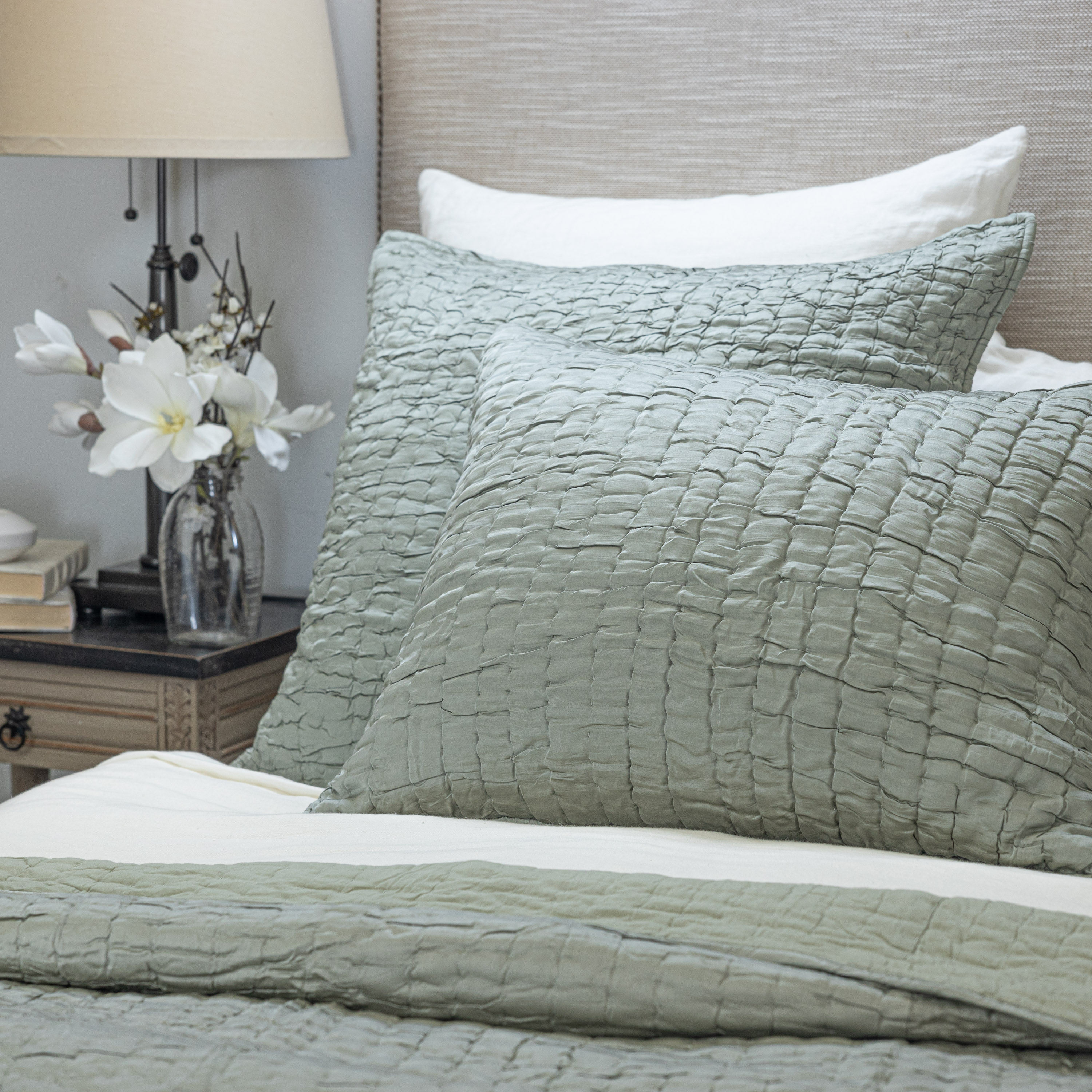 The lustrous Hadon Sea Glass Quilt complements the sleek satin weave elements of the Dawson Duvet, creating a more formal ensemble. Dress down the look by selecting a linen quilt such as Dale in Sea Glass.