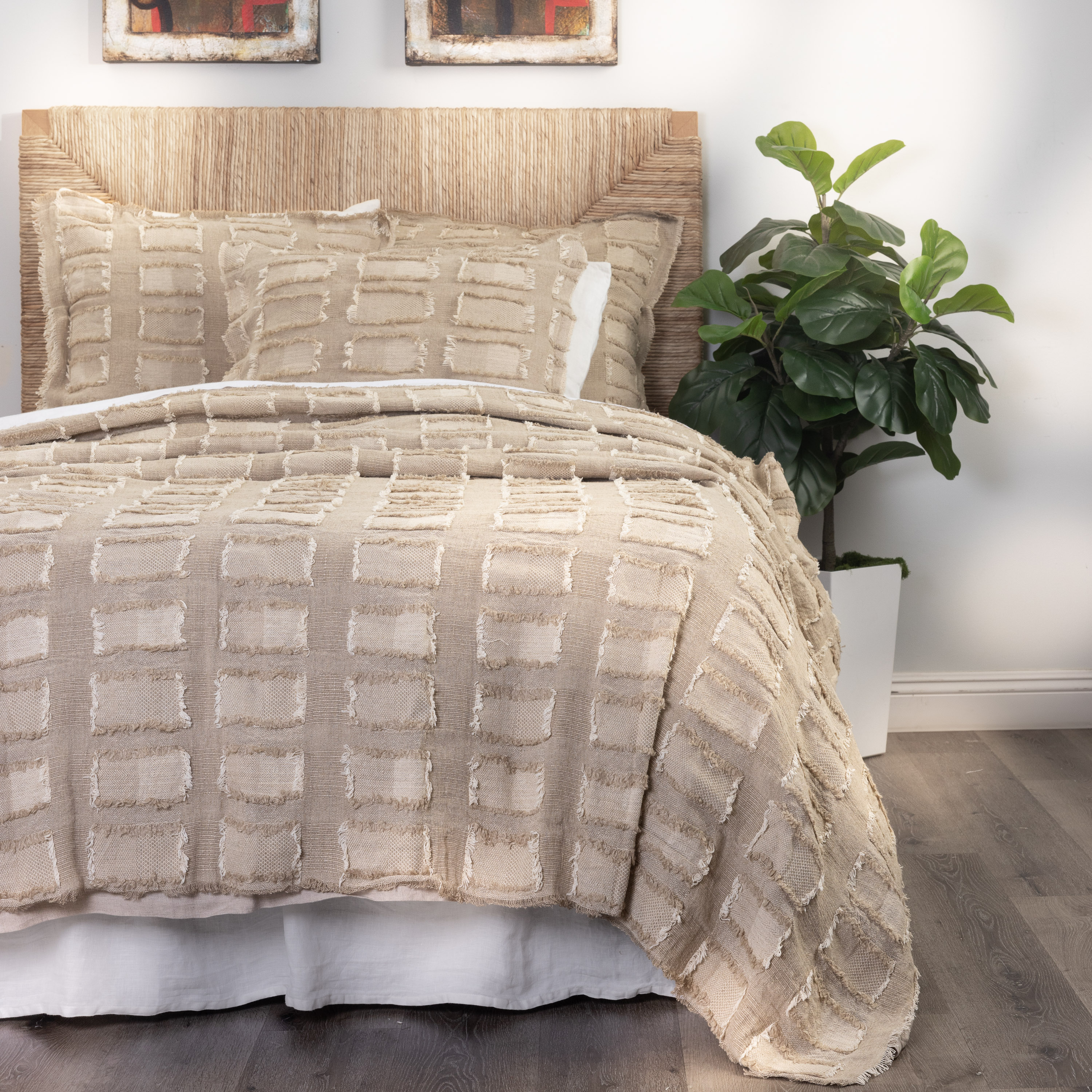 | Hamilton Natural adds tonal pattern and ample texture to the multi color Rockwell stripe Duvet Cover. Highlighting the fil-coupé is a nice contrast to the softness of the Slade Quilt in Kale. |