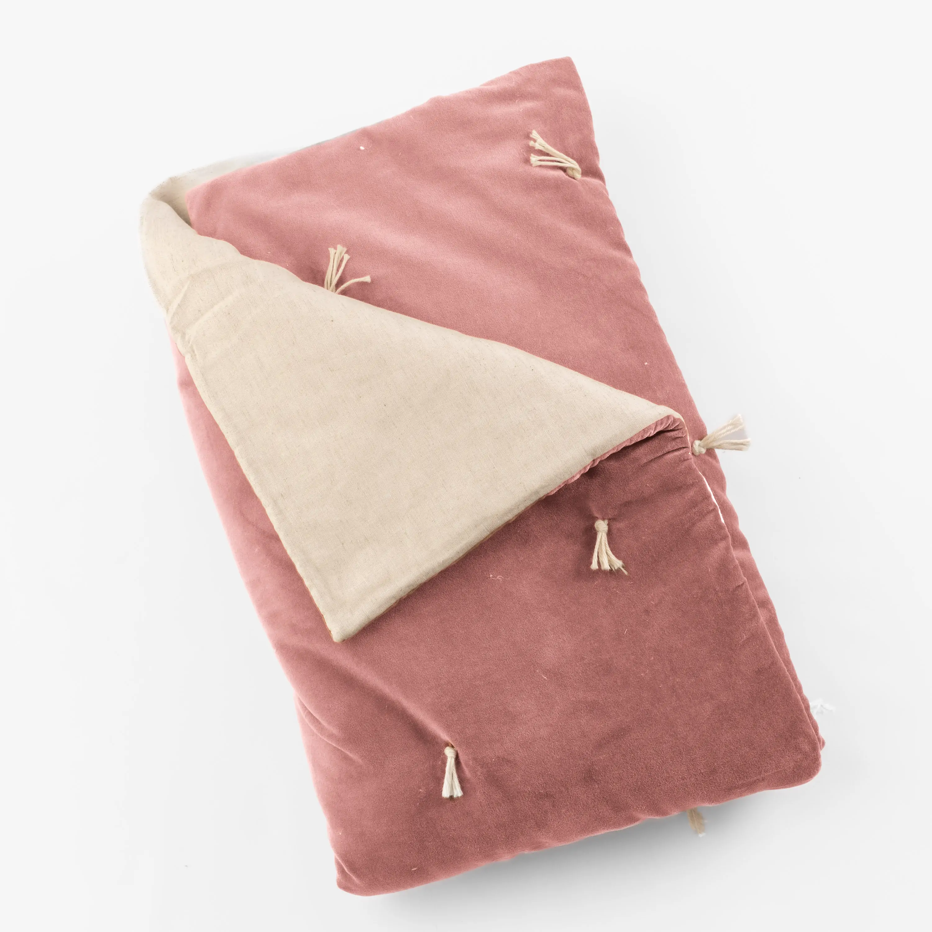 Hawke is cotton velvet on one side, tacked with natural cotton ties, and reverses to natural a cotton/flax back, with a lofty filling. This quilt is inspired by traditions that cross oceans when quilts were quickly tie tacked to be prepared for winter weather. We see the tie tacks as more than swift function of days gone by, but as a beautiful tradition we honor in the luxurious materials in Hawke.