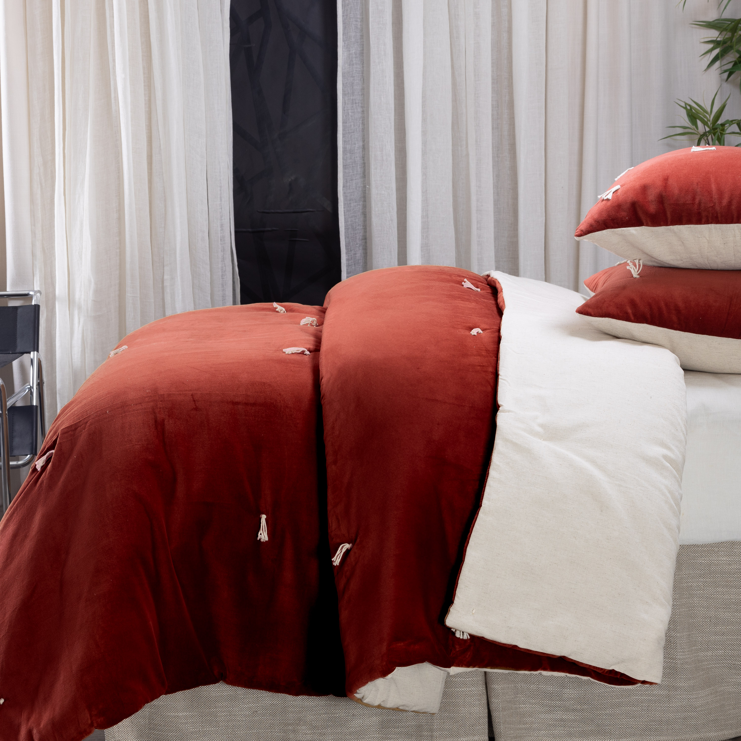 Hawke is cotton velvet on one side, tacked with natural cotton ties, and reverses to natural a cotton/flax back, with a lofty filling. This quilt is inspired by traditions that cross oceans when quilts were quickly tie tacked to be prepared for winter weather. We see the tie tacks as more than swift function of days gone by, but as a beautiful tradition we honor in the luxurious materials in Hawke. The Hawke quilt is available in: