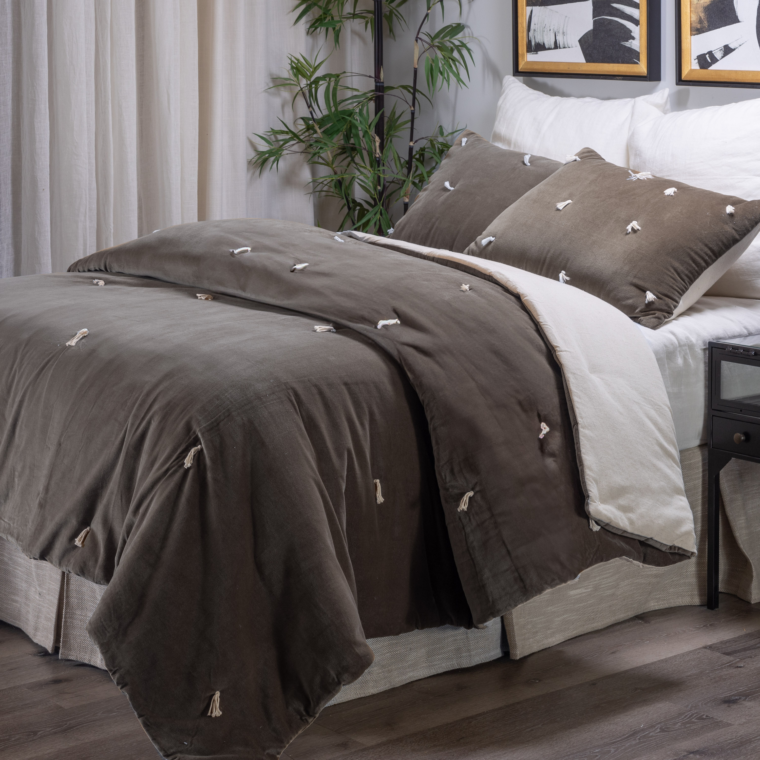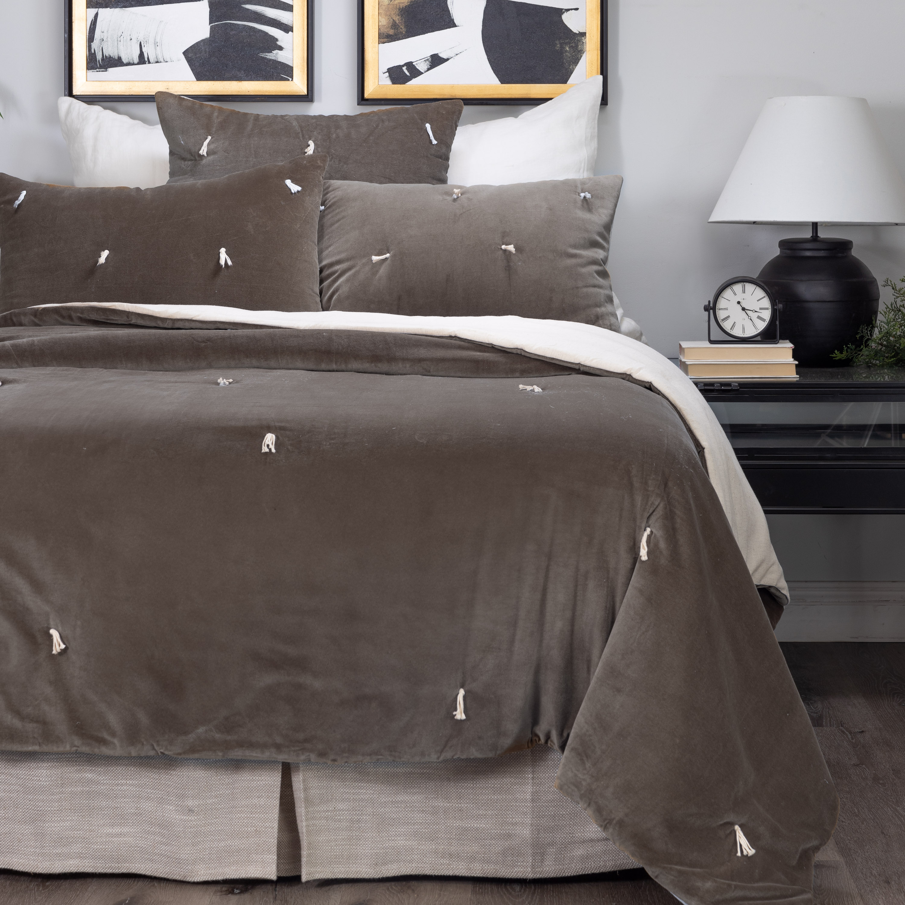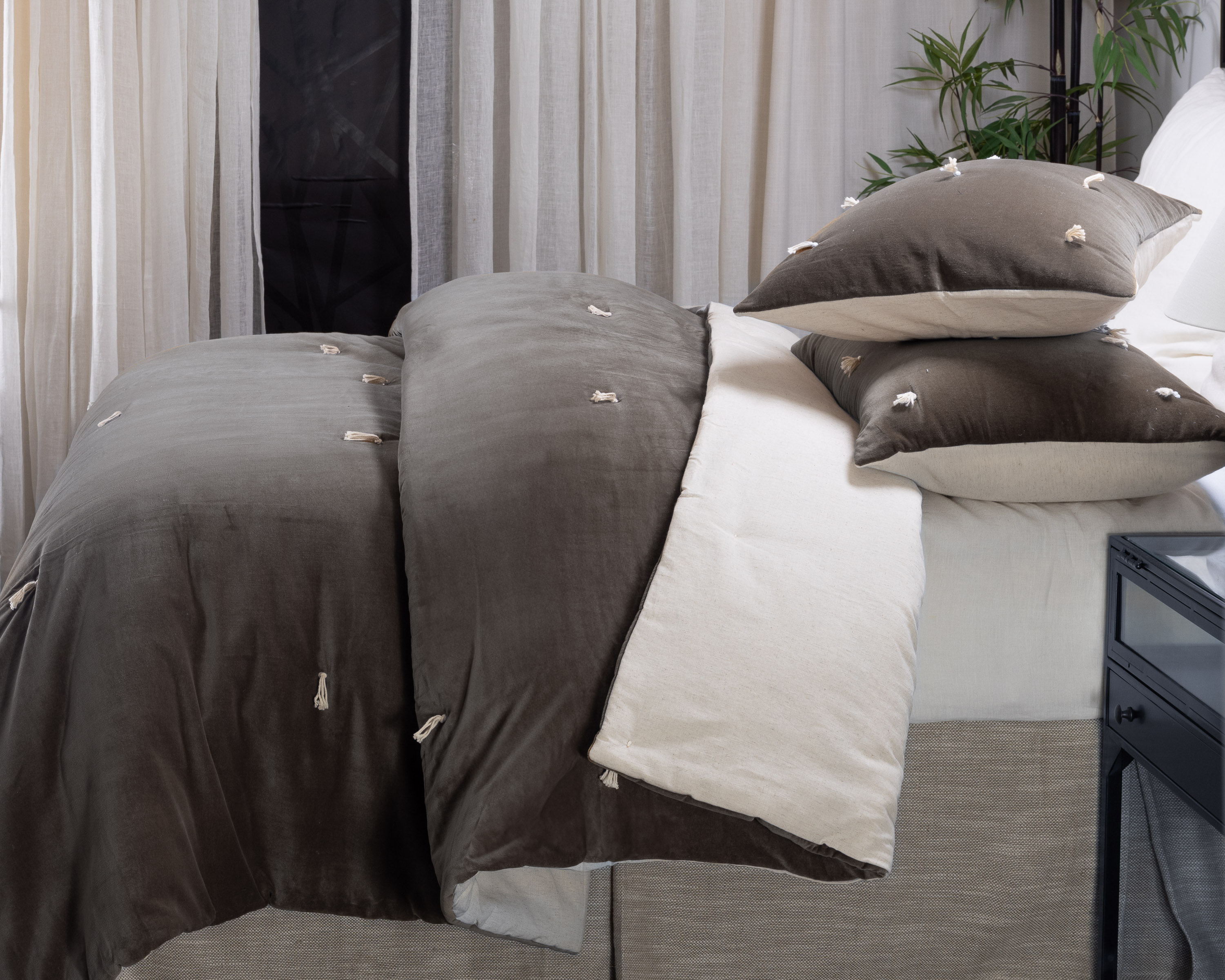 Hawke is cotton velvet on one side, tacked with natural cotton ties, and reverses to natural a cotton/flax back, with a lofty filling. This quilt is inspired by traditions that cross oceans when quilts were quickly tie tacked to be prepared for winter weather. We see the tie tacks as more than swift function of days gone by, but as a beautiful tradition we honor in the luxurious materials in Hawke.