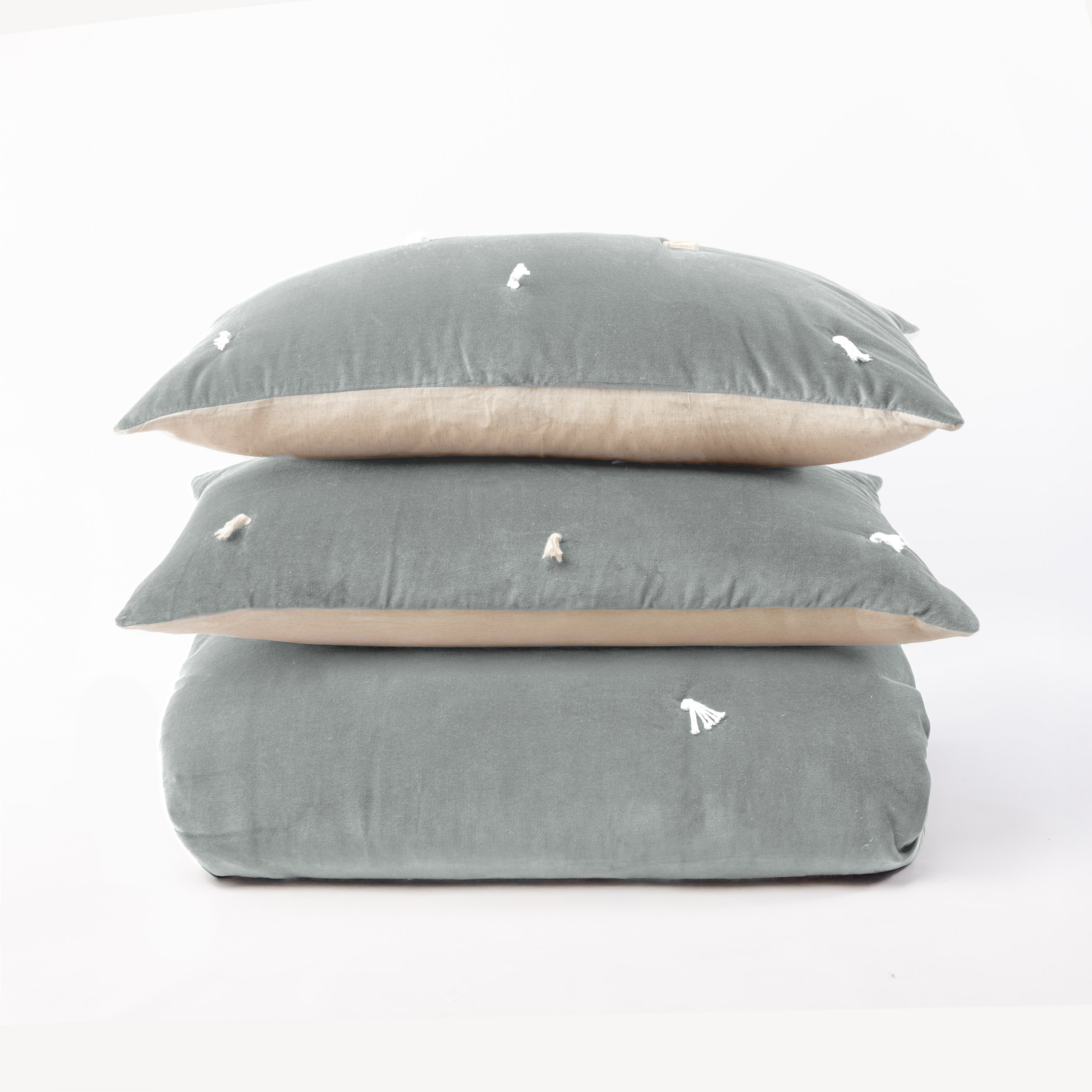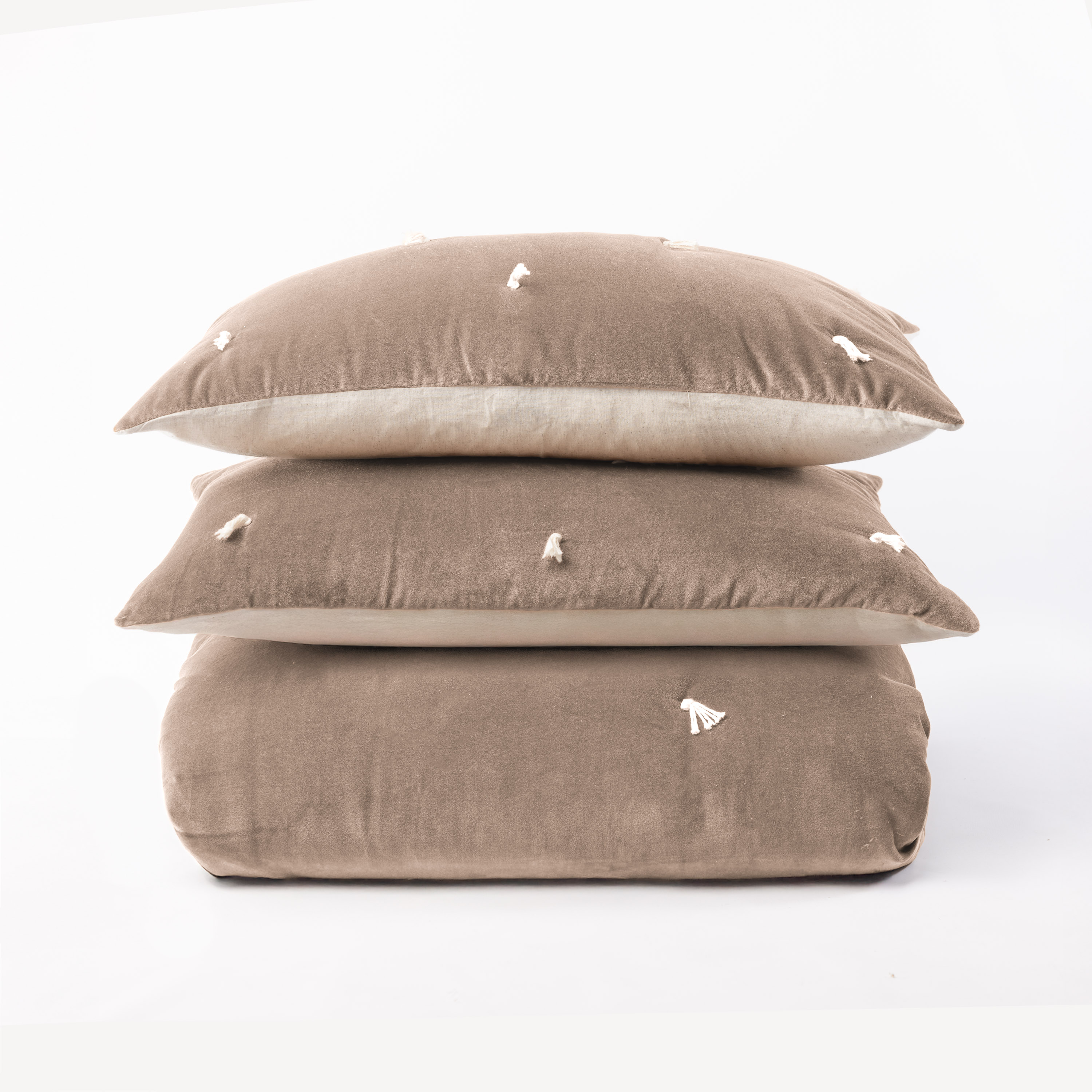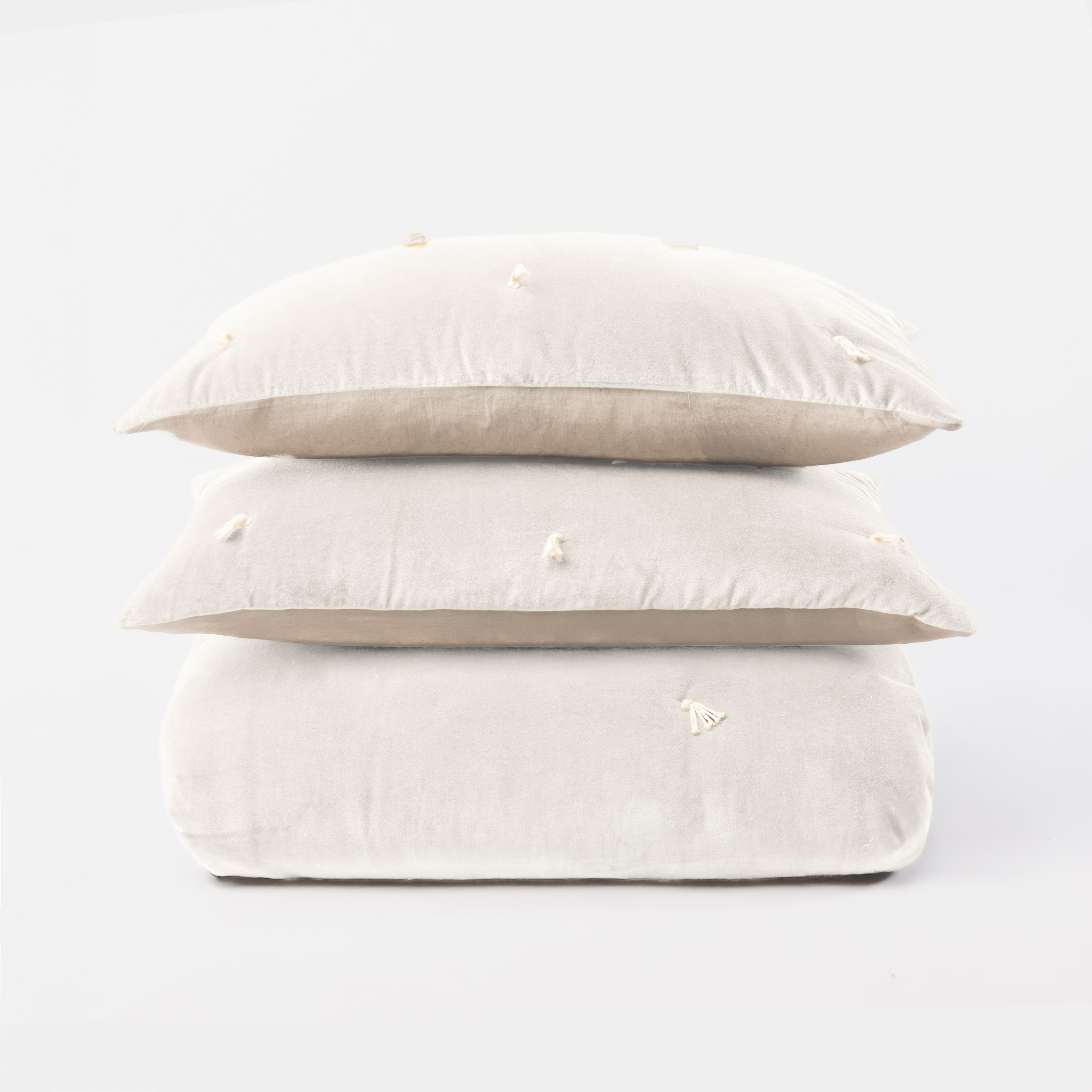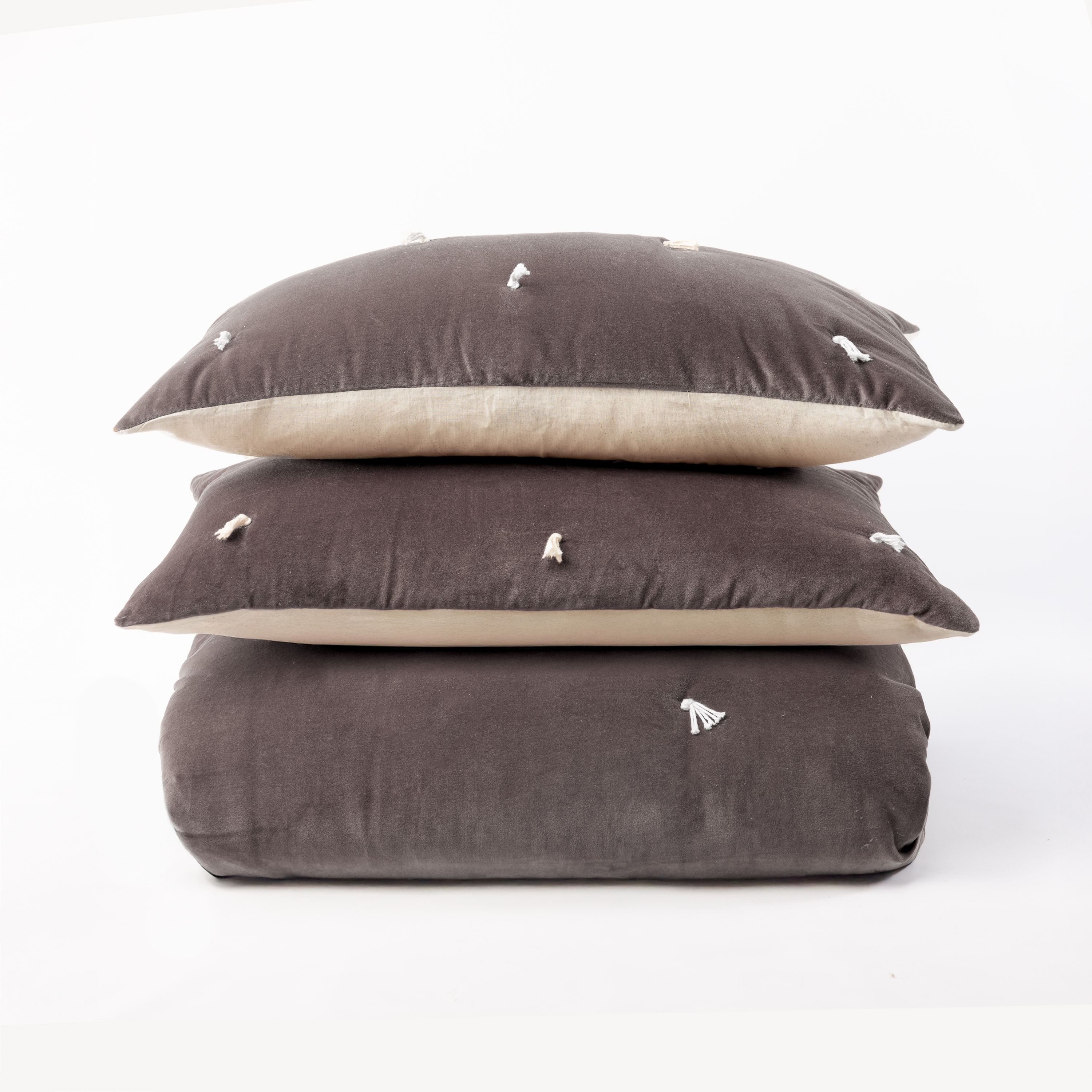 Hawke is cotton velvet on one side, tacked with natural cotton ties, and reverses to natural a cotton/flax back, with a lofty filling. This quilt is inspired by traditions that cross oceans when quilts were quickly tie tacked to be prepared for winter weather. We see the tie tacks as more than swift function of days gone by, but as a beautiful tradition we honor in the luxurious materials in Hawke.