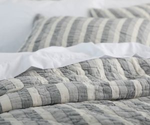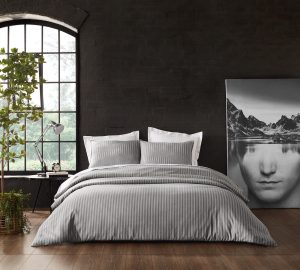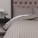 The duvet cover in the image showcases a timeless striped pattern in neutral tones, adding an elegant and versatile touch to any bedroom décor. The design features thin, evenly spaced stripes that create a subtle yet sophisticated aesthetic.