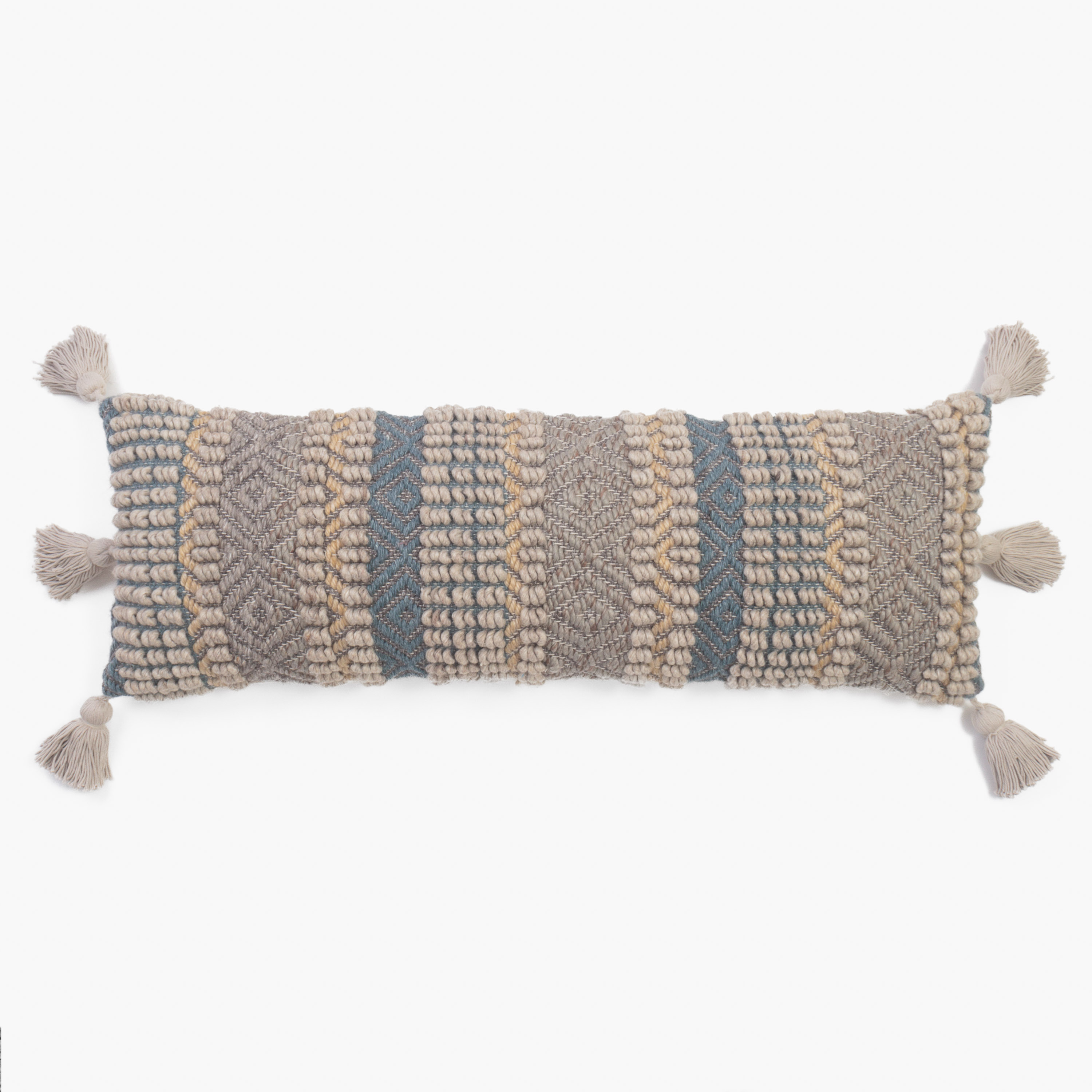 Woven with dimensional texture and artisanal charm, this bolster pillow features alternating bands of chunky loops and intricate patterns in soft beige and dusty blue. The mix of tones and weaves creates a cozy, elevated look perfect for layering. Finished with tassels on each corner, it brings a relaxed, handcrafted feel to any space.