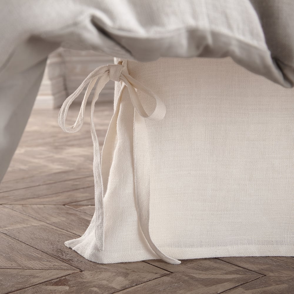 Our Henly linen bed skirt is tailored with pleats, and has ties on each corner. Bed Skirt comes as 3 Panels, in drop length + 3 inch deck, and may require pins ( Pins are not included) Sizes
