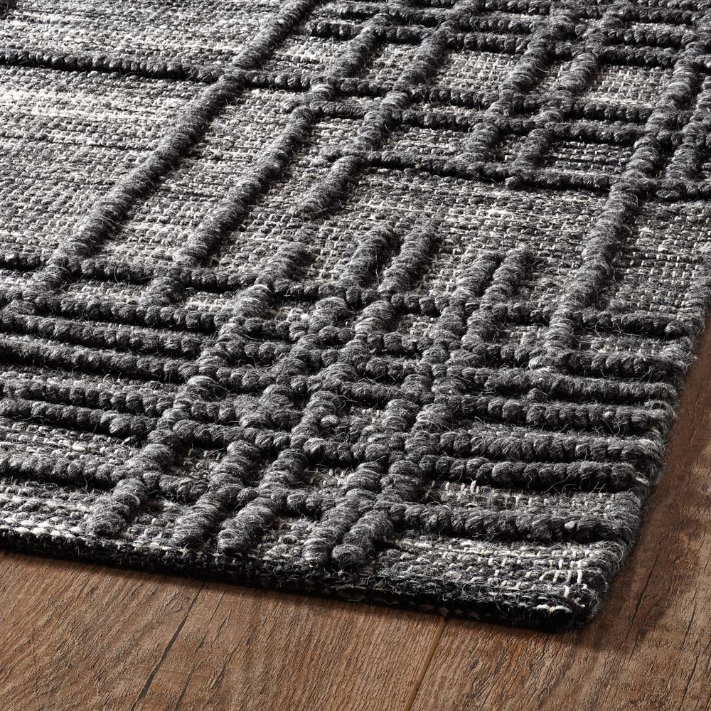 This beautifully textured hand loomed loop pile rug blends the durability of wool with the softness of viscose. A mélange of charcoal and natural tones creates subtle movement within the intermittent hatch mark motif.