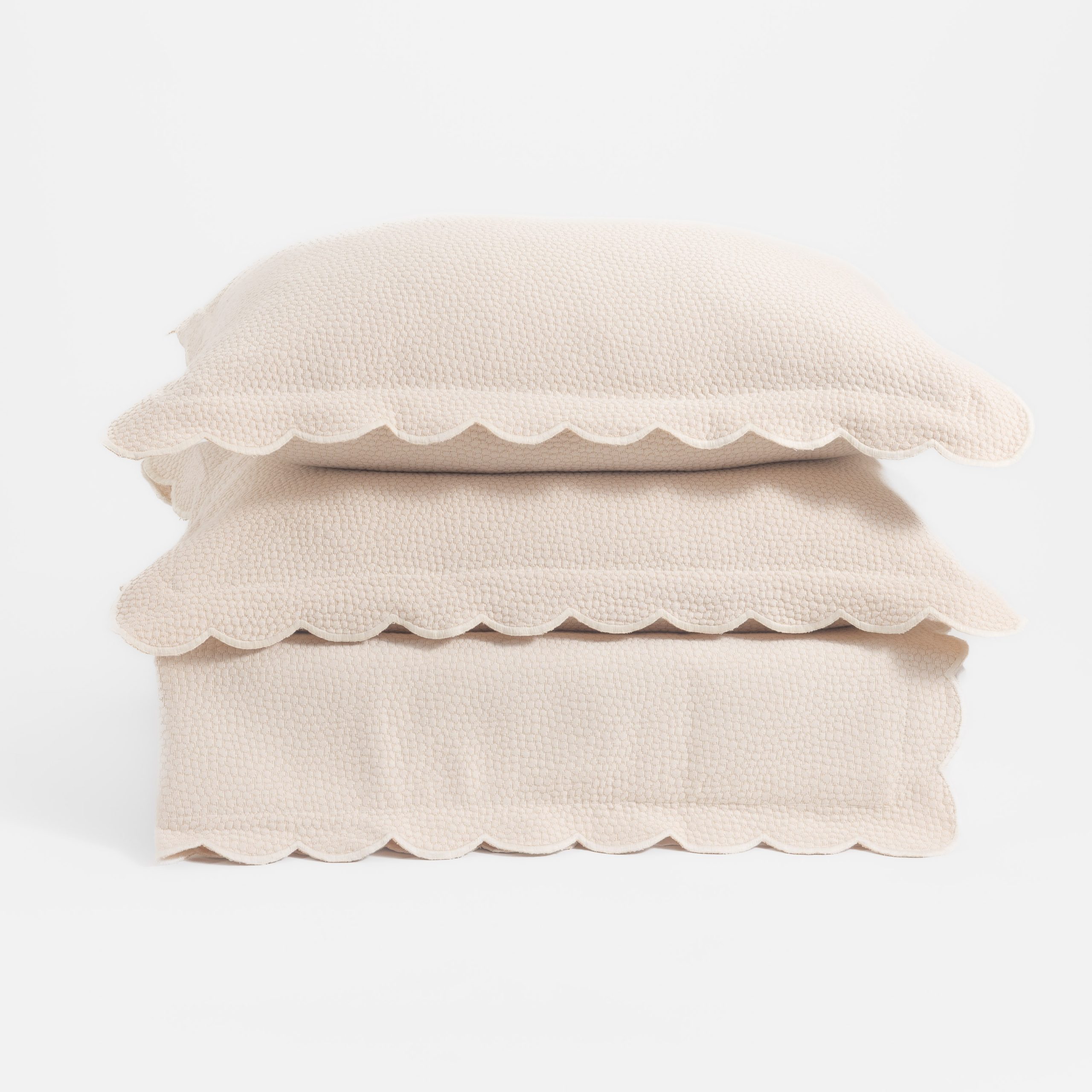 Hugo is a classic matelassé constructed of mercerized cotton for a sleek appearance and hand feel. The all-over stippling design provides subtle interest, and the coverlet is finished with a scalloped edge rounded front corners.