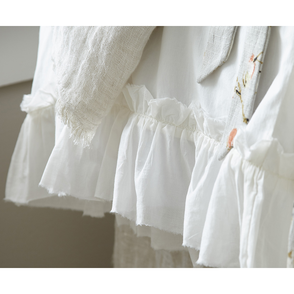 Soft cotton percale sheeting finished with an ethereal raw edge ruffle.