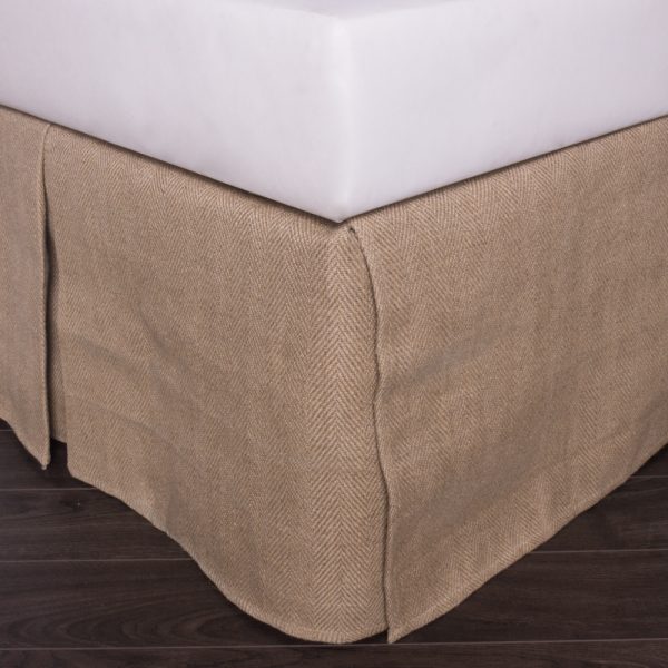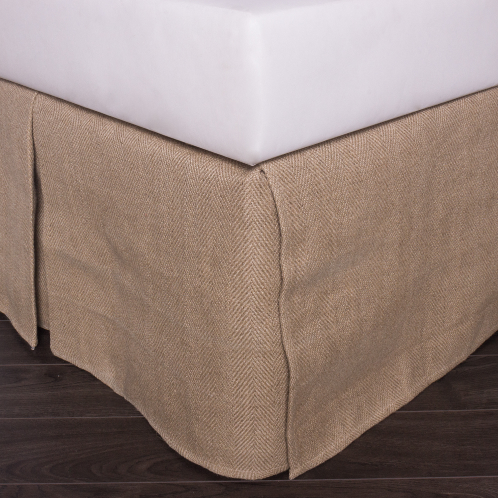 Our Jackson natural linen bed skirt is tailored with pleats. The herringbone pattern fabric has the weight of burlap with the softness of pure linen. Bed Skirt comes as 3 Panels, in drop length + 3 inch deck, and may require pins ( Pins are not included)