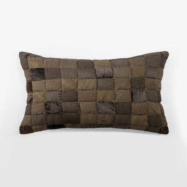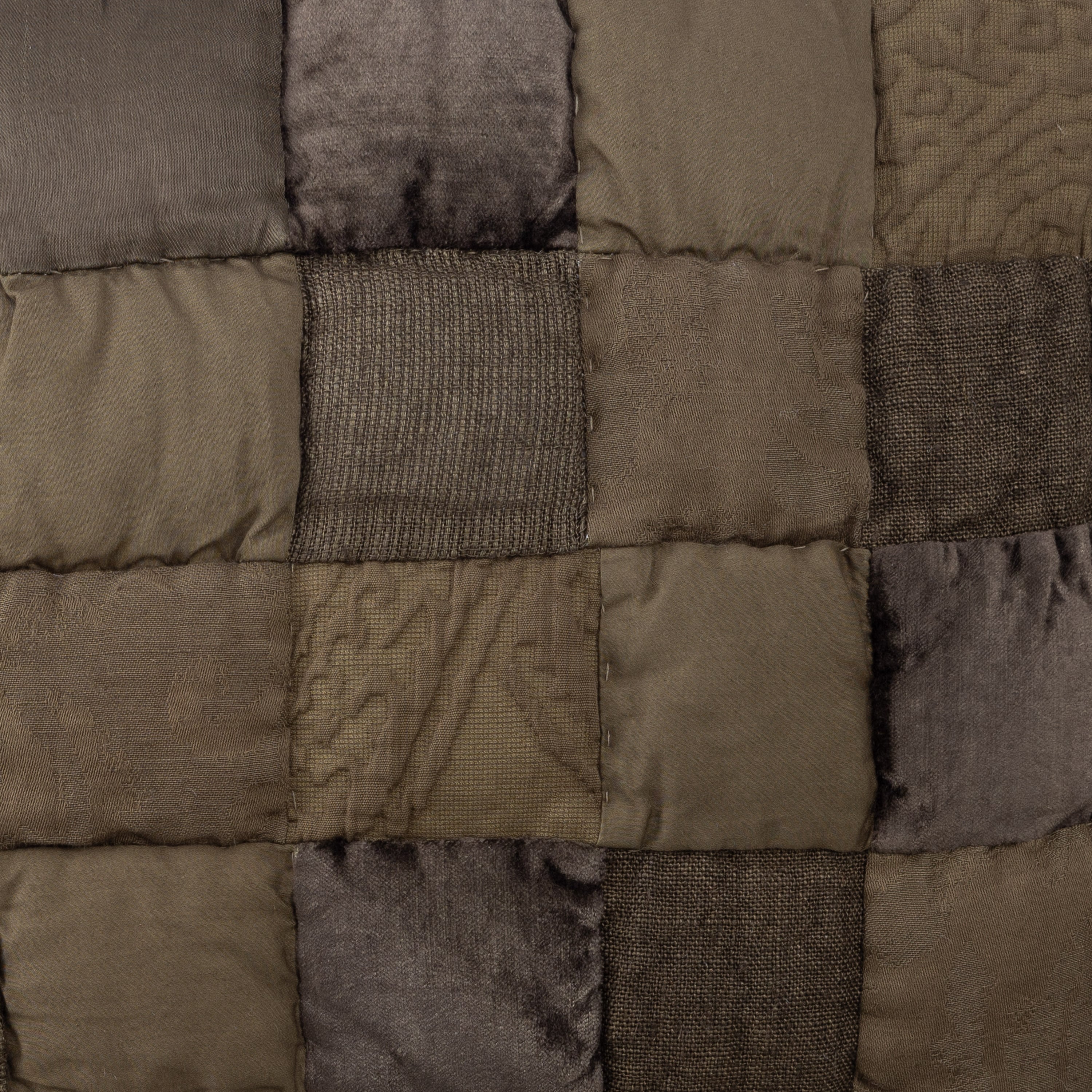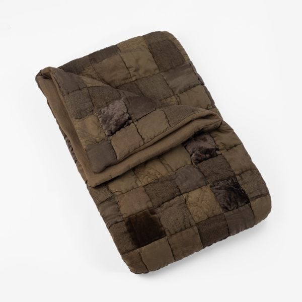 The Kai quilt features an overdyed patchwork that combines a range of textures, including cotton velvet, linen, and rayon velvet. Inspired by handcrafted Moroccan tiles, this quilt showcases various materials and textiles. Once the exquisite fabrics are pieced together, they are over-dyed to create a harmonious yet dynamic tonal palette, resulting in a rich and vibrant finished product.