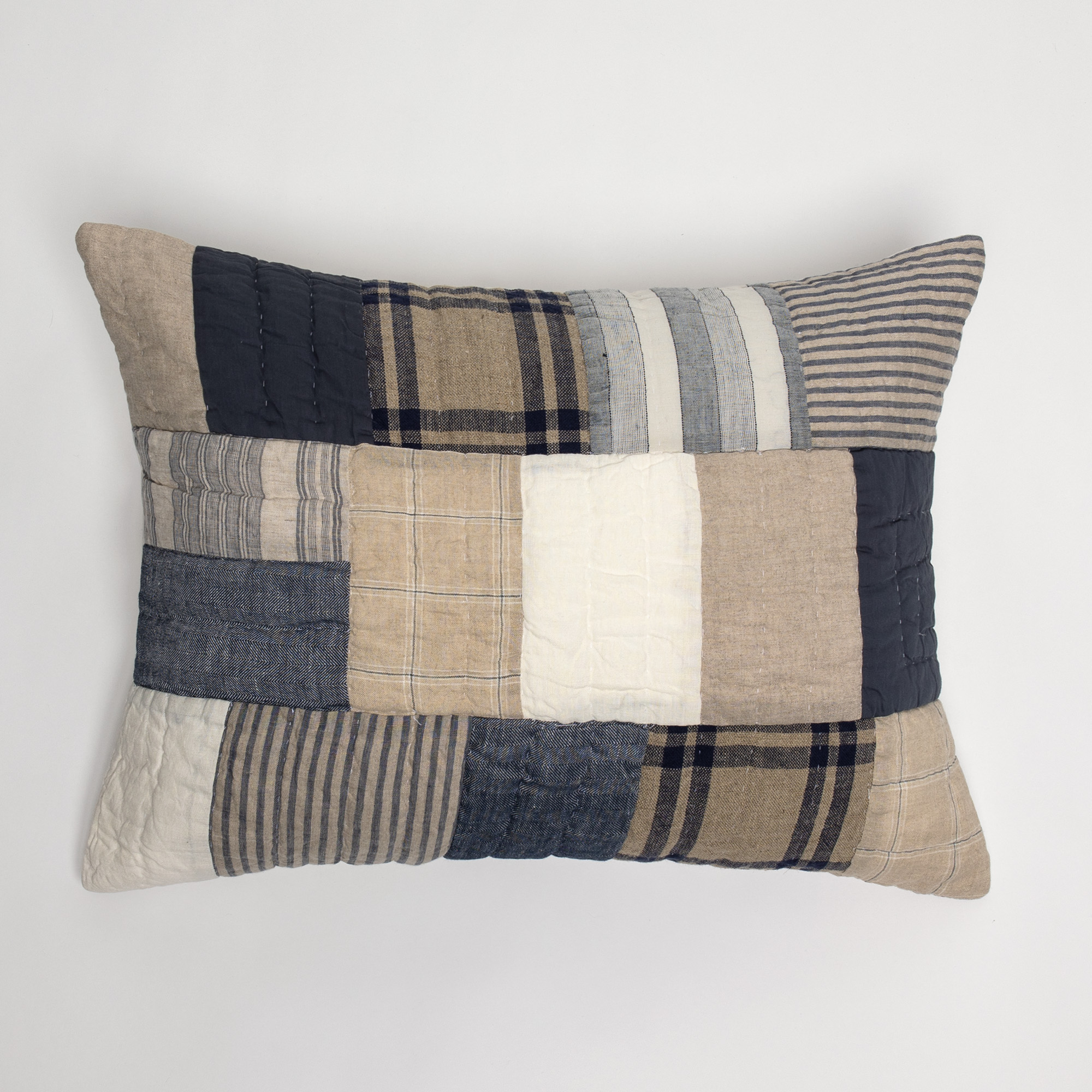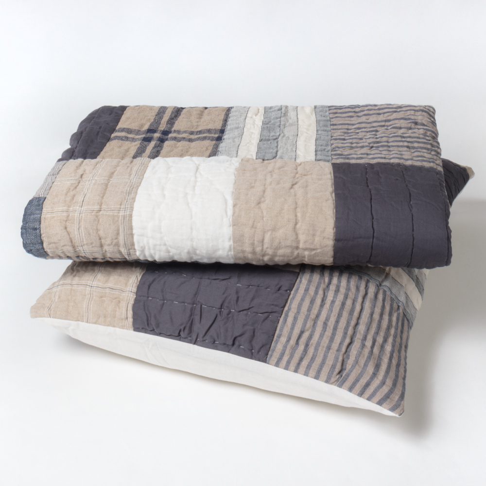 Constructed of cotton and linen in solids textures and stripes, Kendall is inspired by traditional patchwork quilts that utilize work and dress clothes scraps. Large blocks and the use of natural linen add to the refinement of the overall aesthetic.