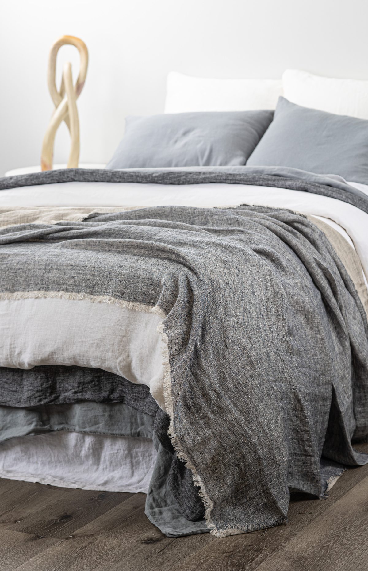 Inspired by the more relaxed European lifestyle, Kent brings home the casual elegance the continent is known for. Oversize linen gauze double cloth, that is designed with a European causal sensibility so that it completely covers the bed, nearly skirting the floor (depending on mattress height)and extra long shams (one sided open like a pillowcase) is a textbook European style- Classy yet Casual. Taking note new colors of the year, we have taken a softer more subtle approach with this introduction in 11 colors. The eyelash edge bedspread reverses to natural linen on the back side, so that Kent offers the newness of Asphalt grounded with the always appropriate Natural Linen on the reverse.