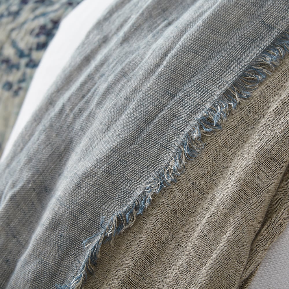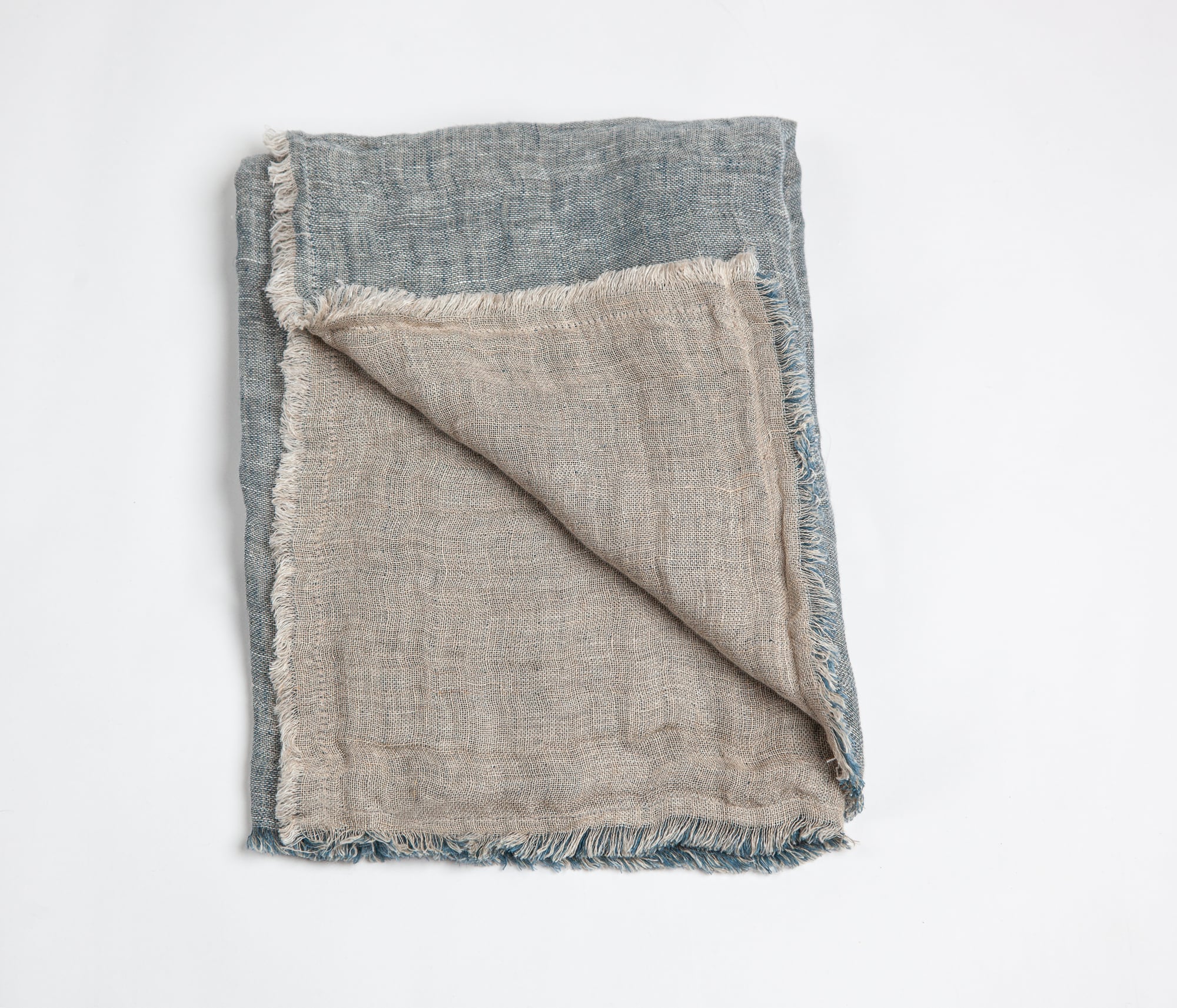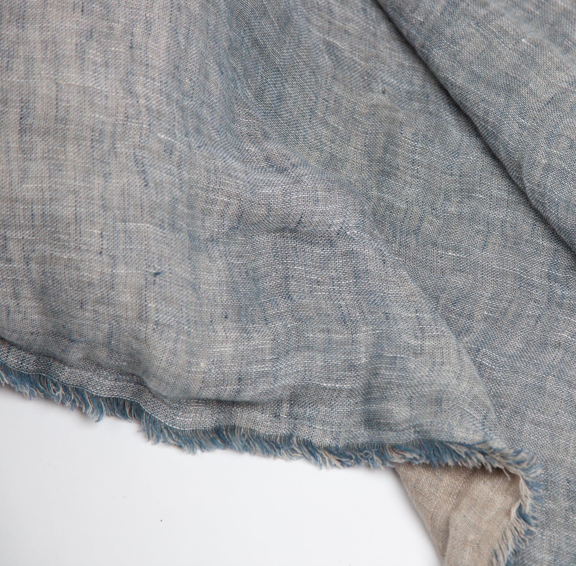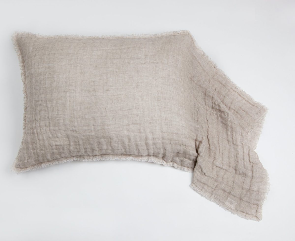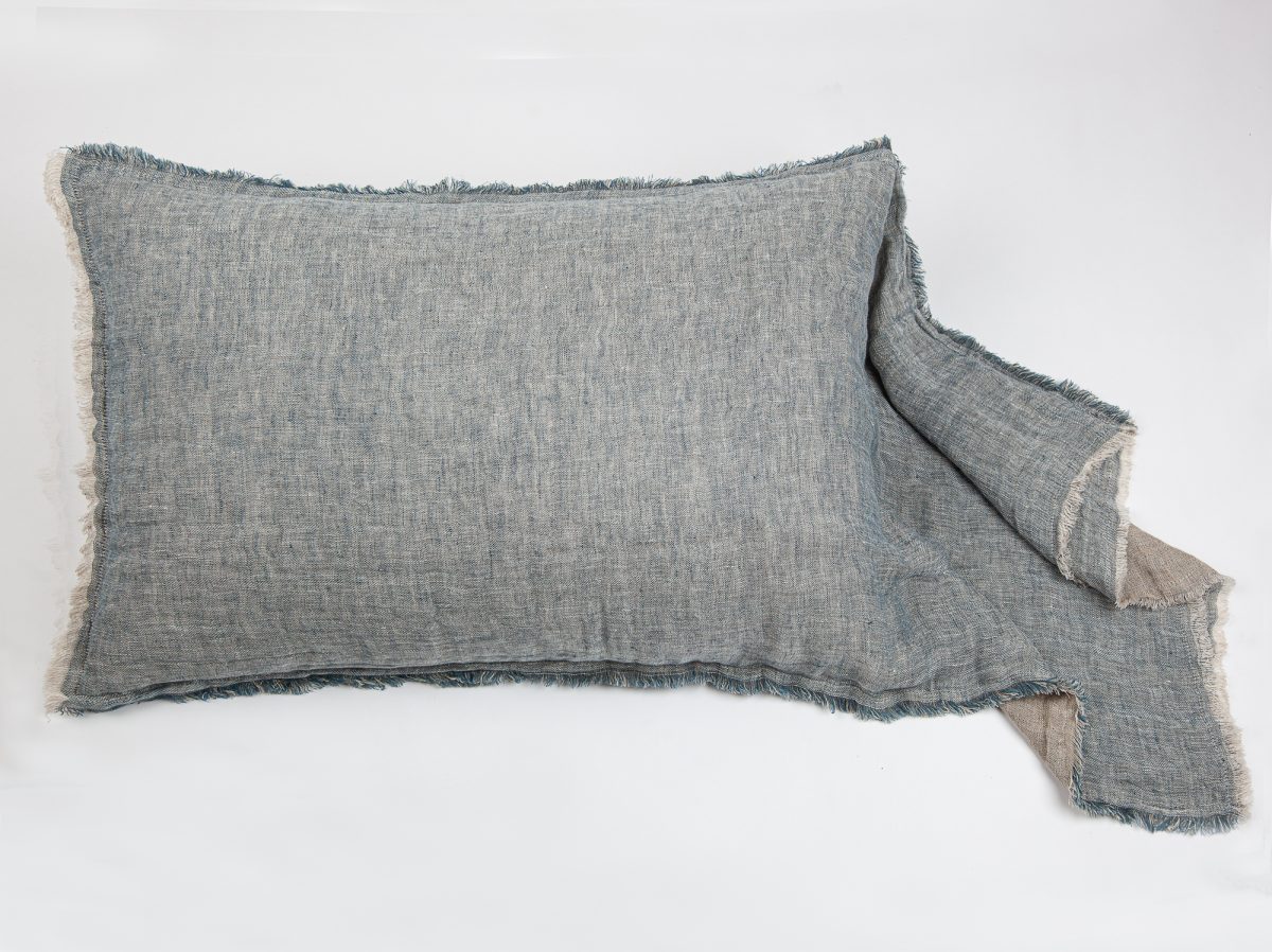 The shams are designed as a pillowcase style with an exaggerated drape. All colors reverse to natural linen and are finished with a hand frayed eyelash edge.