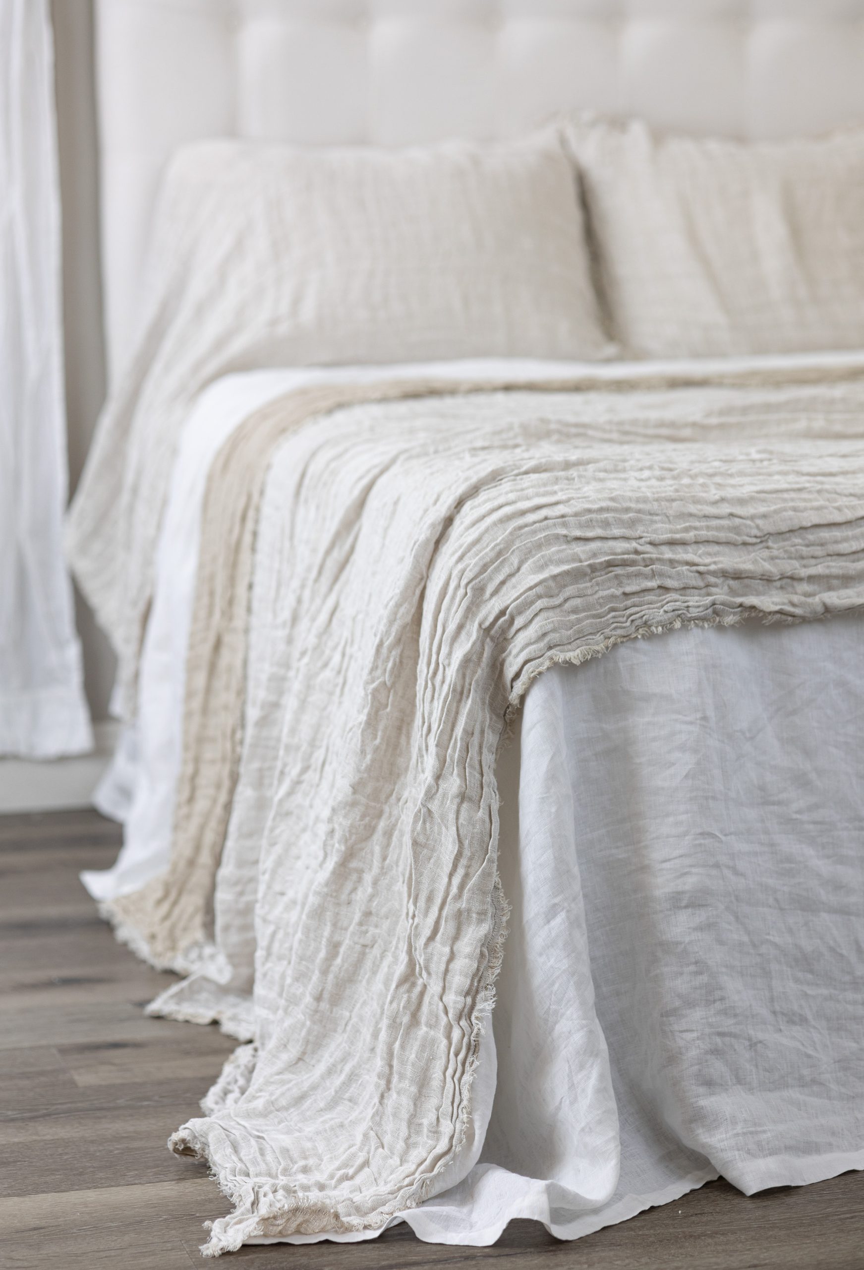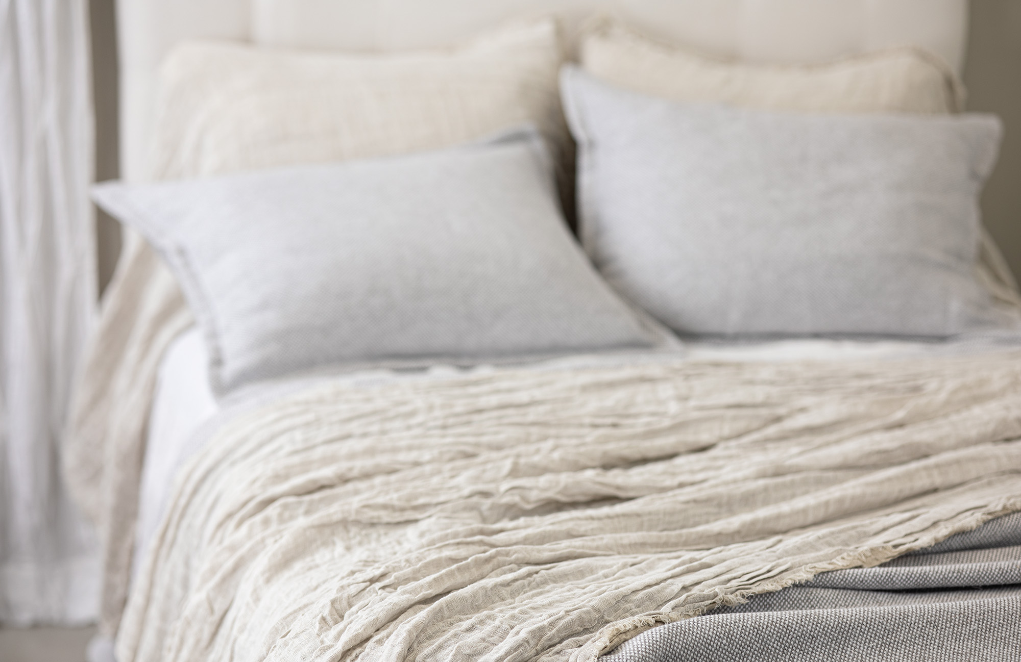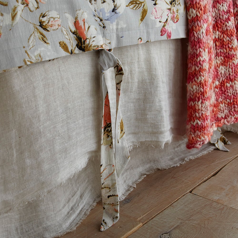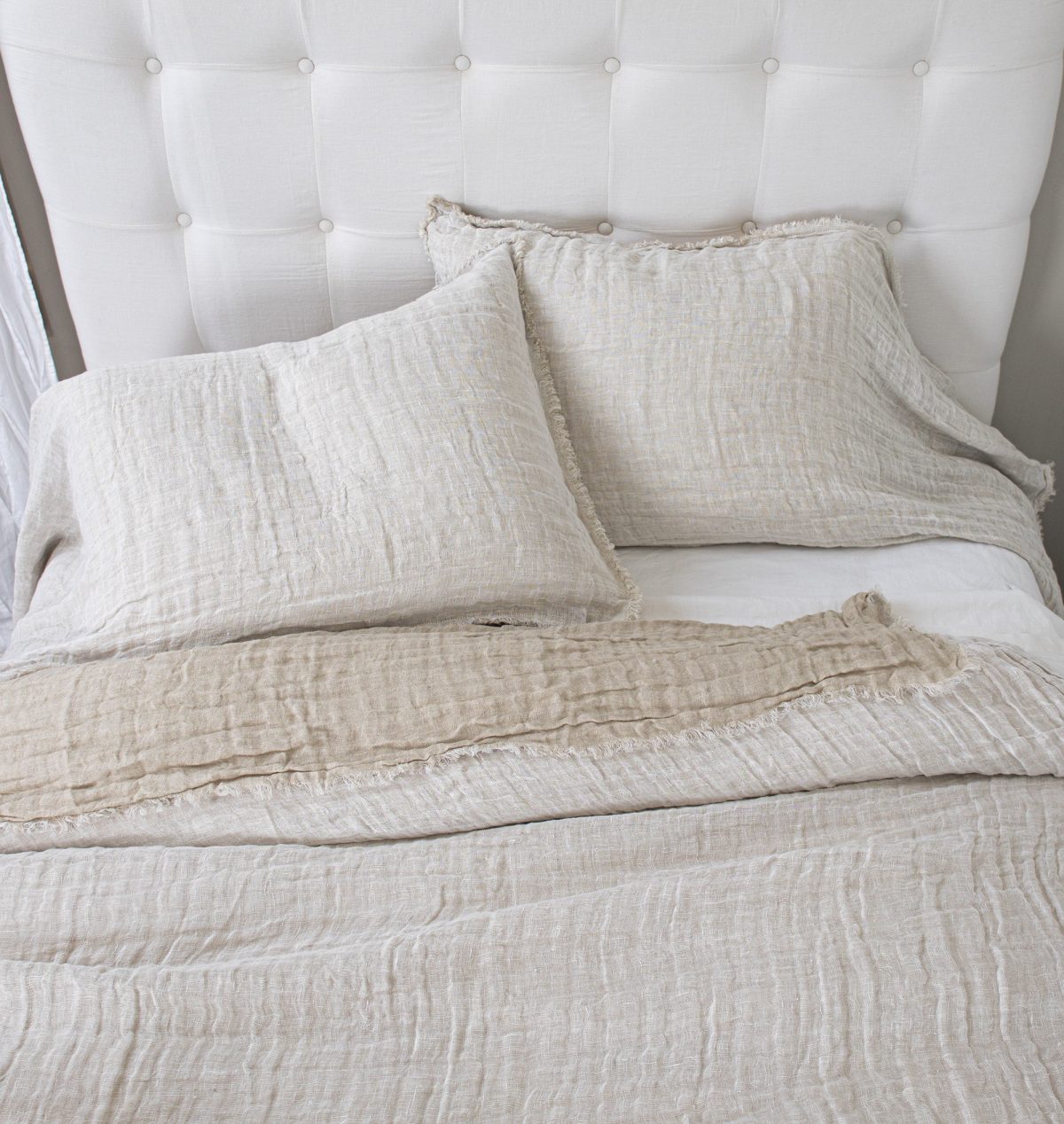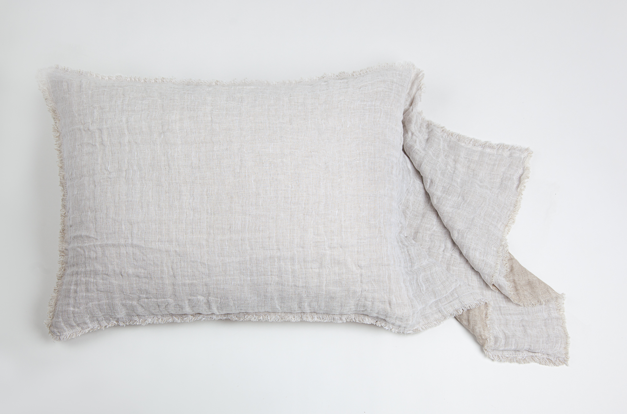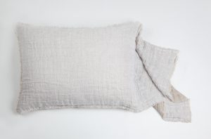 The shams are designed as a pillowcase style with an exaggerated drape. All colors reverse to natural linen and are finished with a hand frayed eyelash edge.