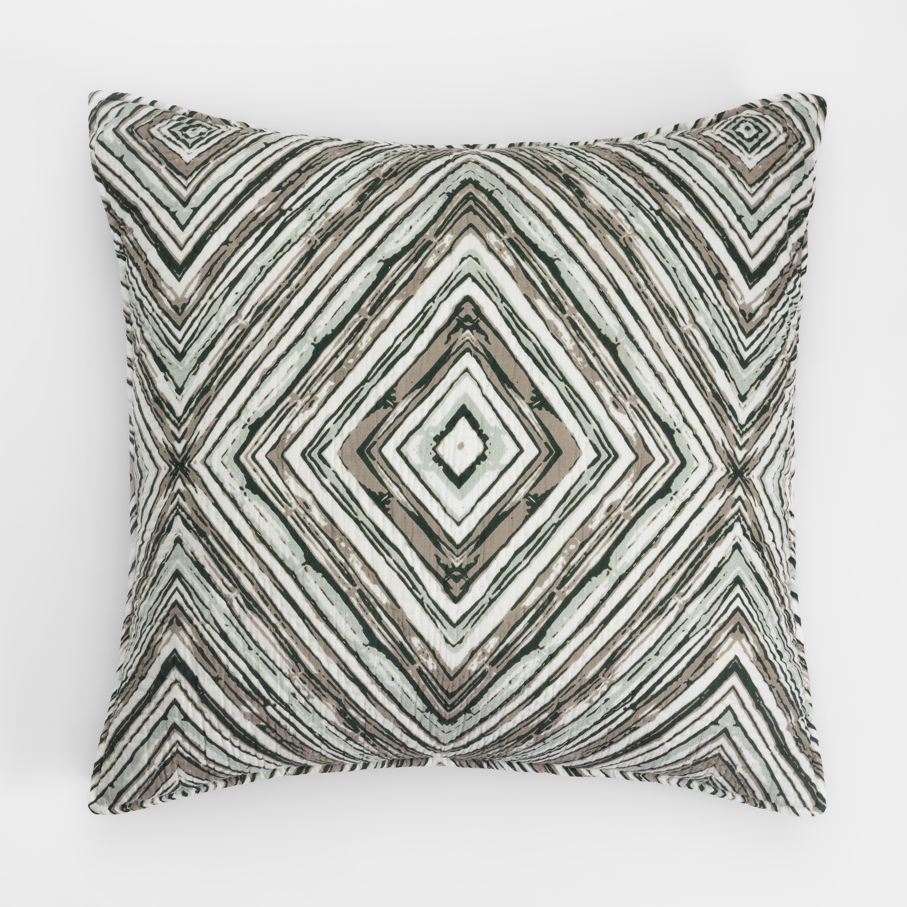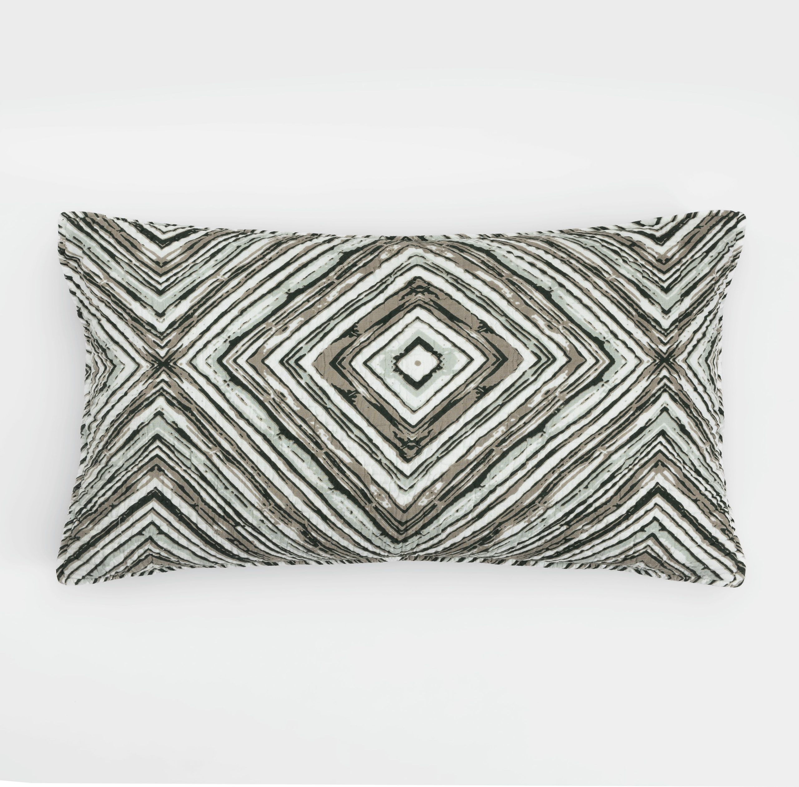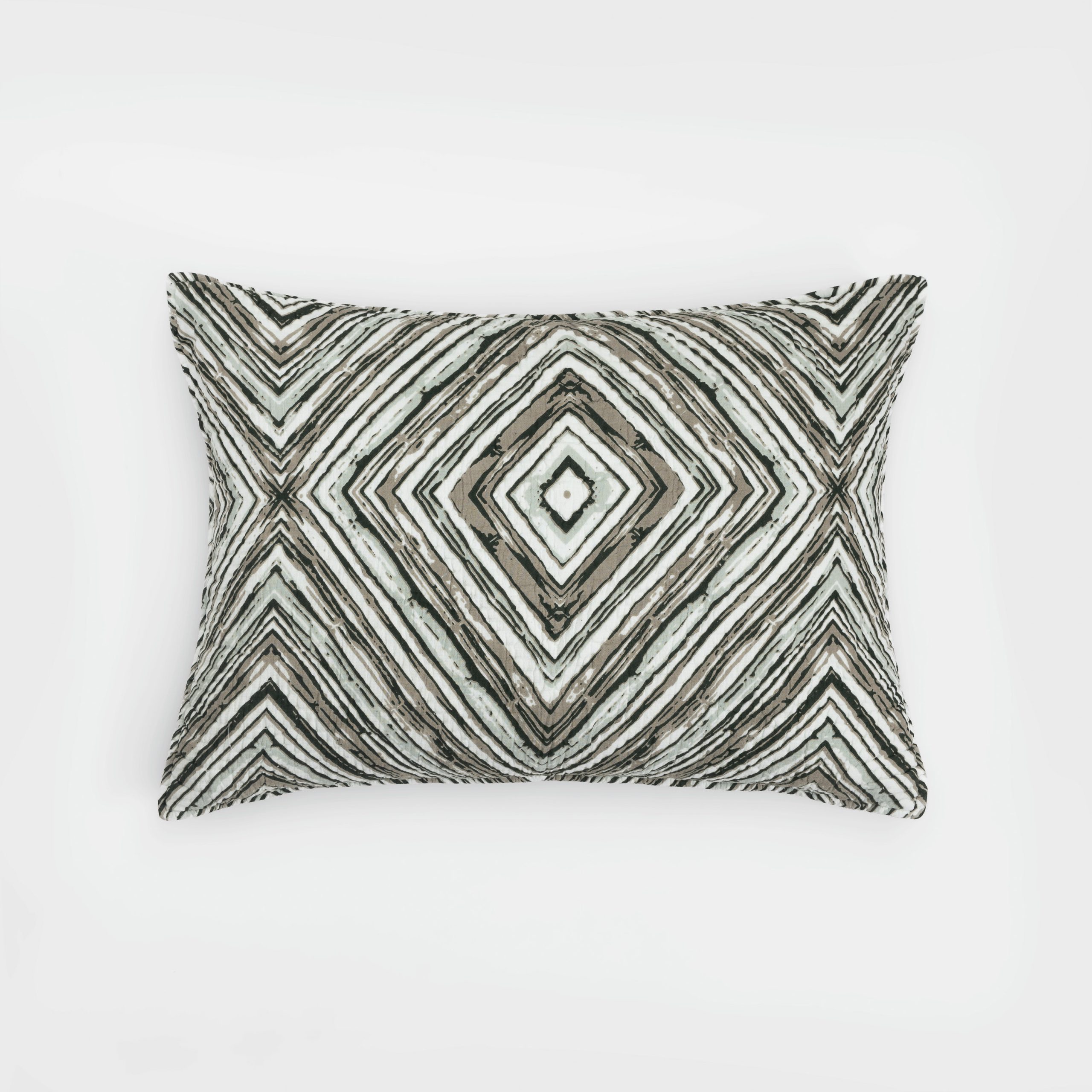 Printed on a supple cotton cloth and hand quilted the Kingston quilt adds coziness and drama. The bold pattern of concentric diamonds can easily bend stylistically between Mid-Century Modern, Tribal and Contemporary depending on the setting and companion pieces.