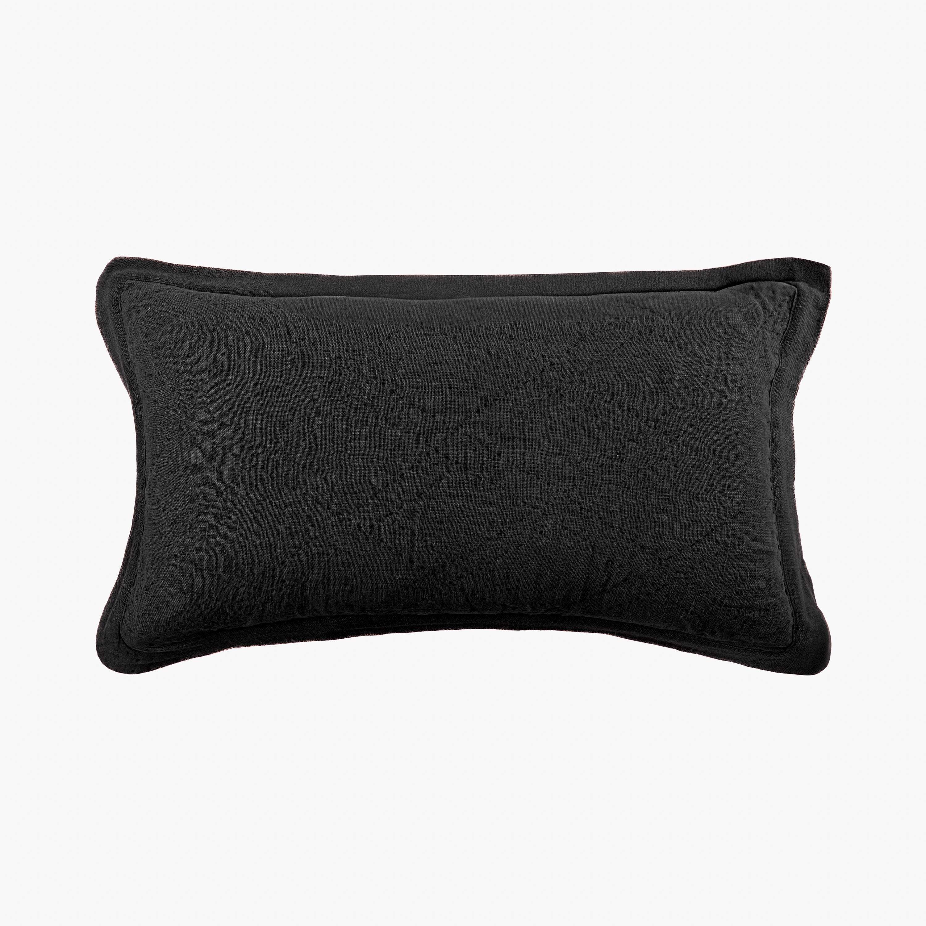 A slubby, washed linen cloth gives this quilt raw elegance that can transcend a multitude of style categories. Hand quilted in a classic double diamond pattern, with light-weight cotton batting afford superior drapability. A two-inch mitered flange binds the quilt and shams.
