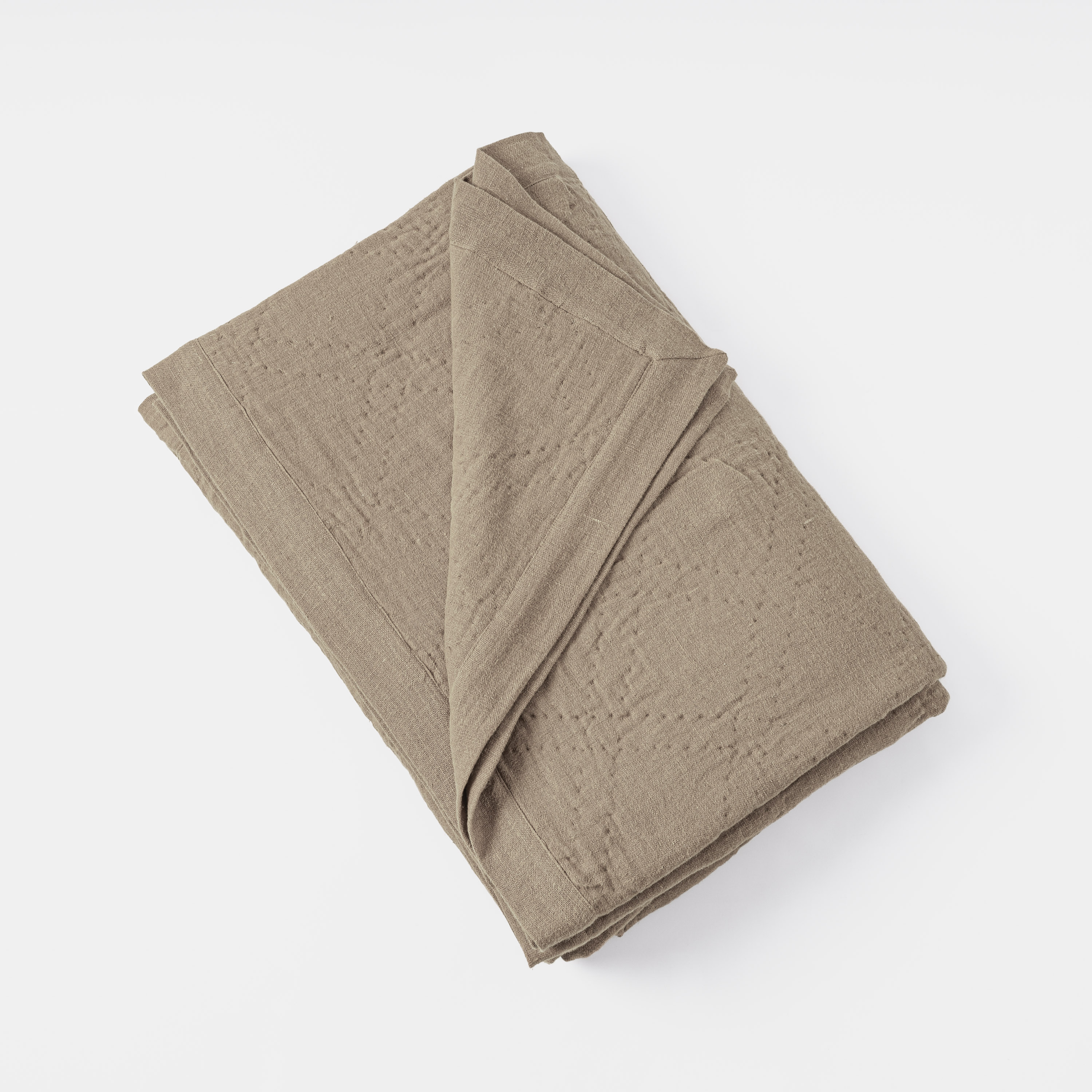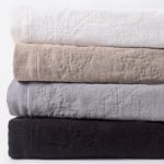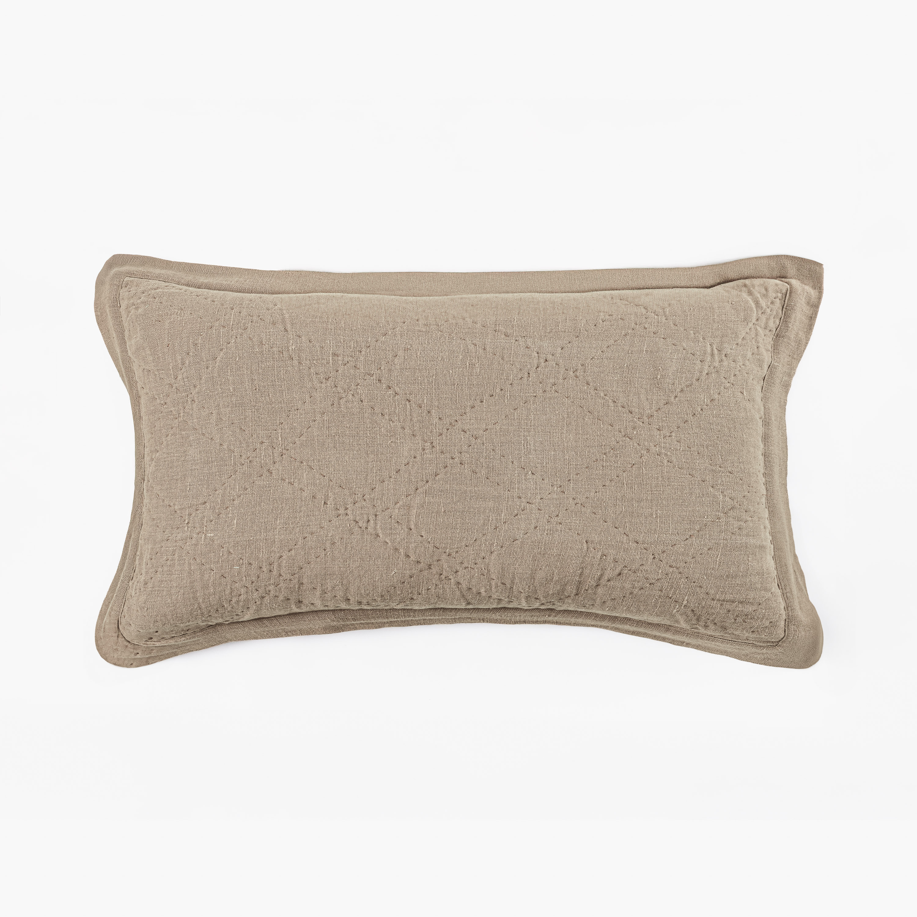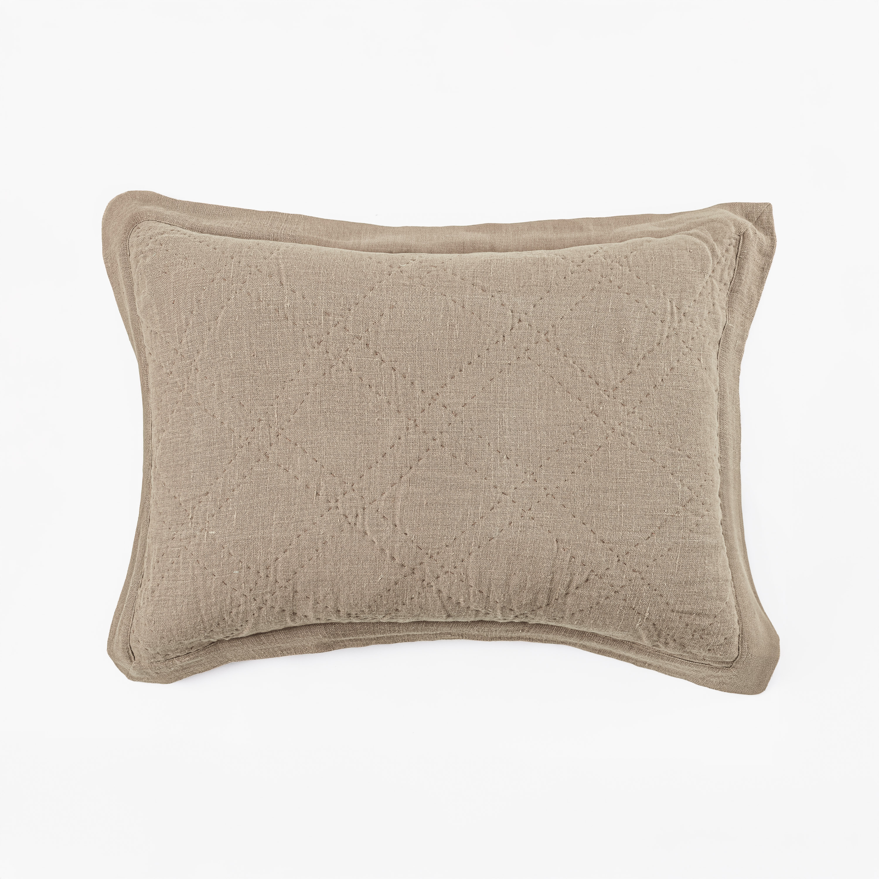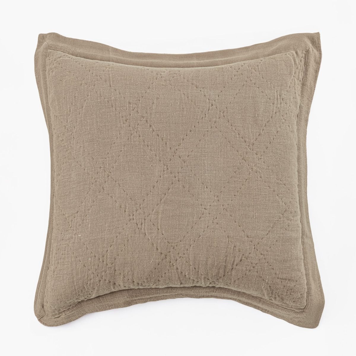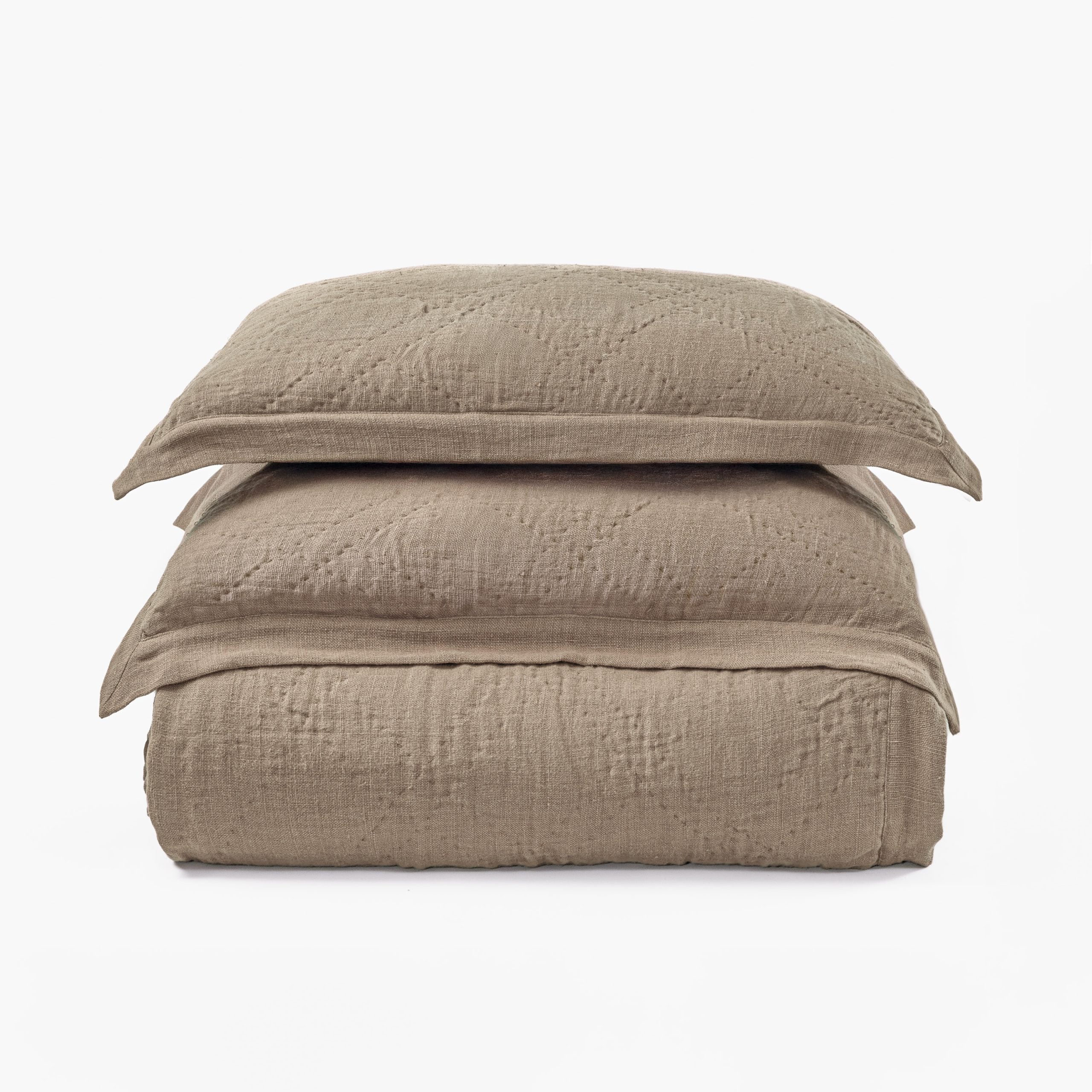 A slubby, washed linen cloth gives this quilt raw elegance that can transcend a multitude of style categories. Hand quilted in a classic double diamond pattern, with light-weight cotton batting afford superior drapability. A two-inch mitered flange binds the quilt and shams.