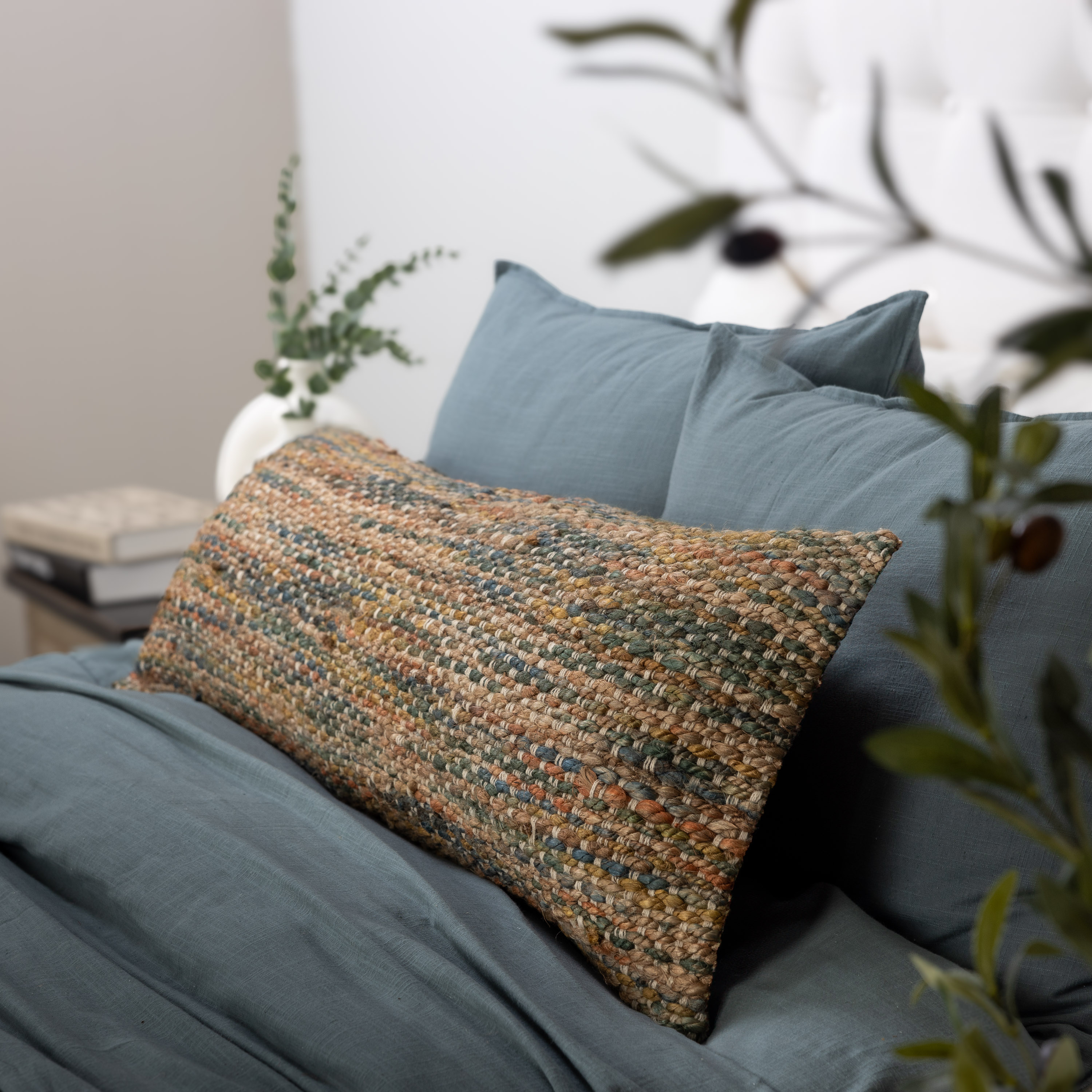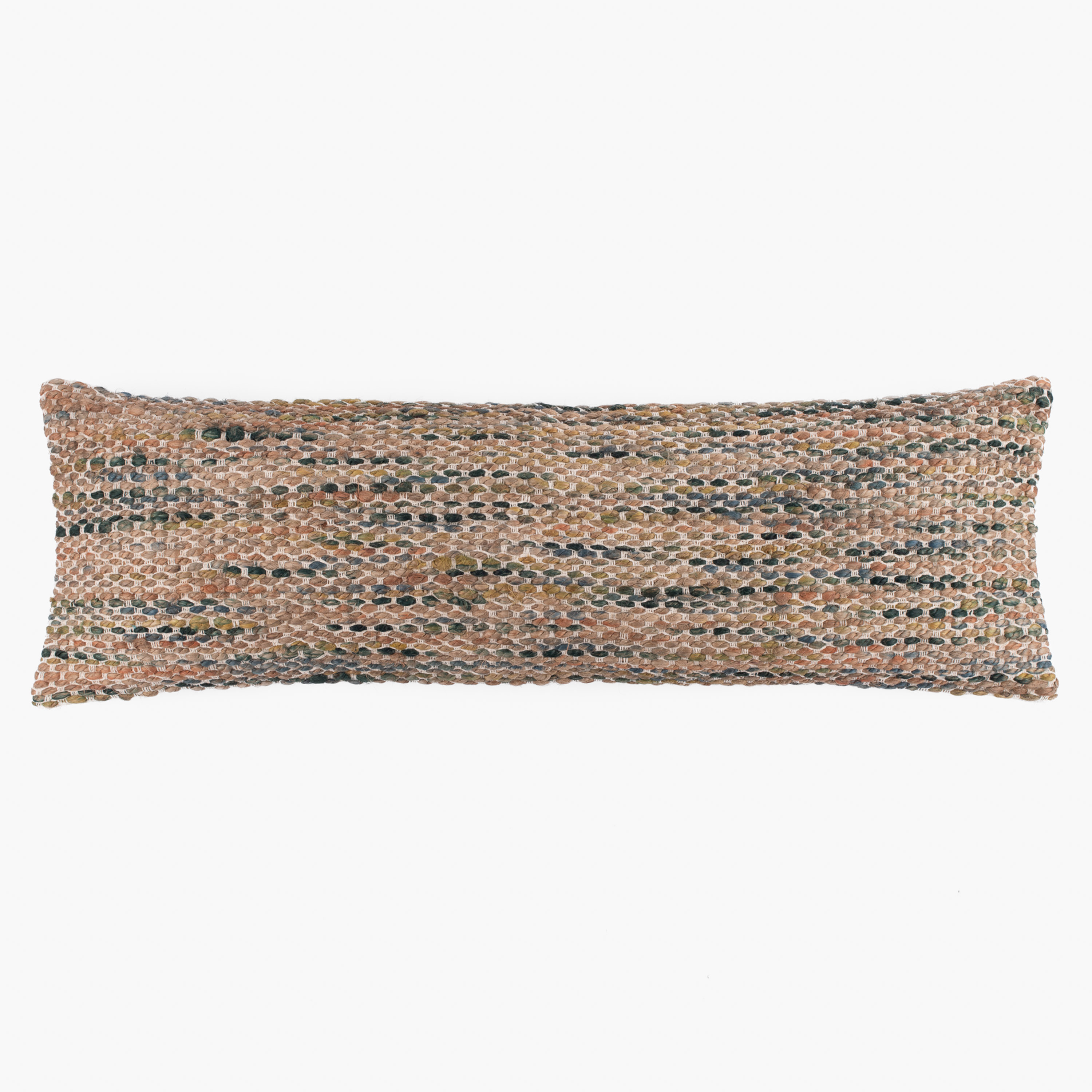 Artfully handwoven with a rich blend of earthy tones, this extra-long lumbar pillow adds warmth and dimension to any luxury bedding ensemble. Its intricate, textural weave evokes the charm of artisanal craftsmanship while offering a sophisticated palette of terracotta, olive, and deep charcoal. A versatile accent for refined interiors, it brings an elevated, organic touch to both rustic and modern spaces.