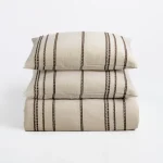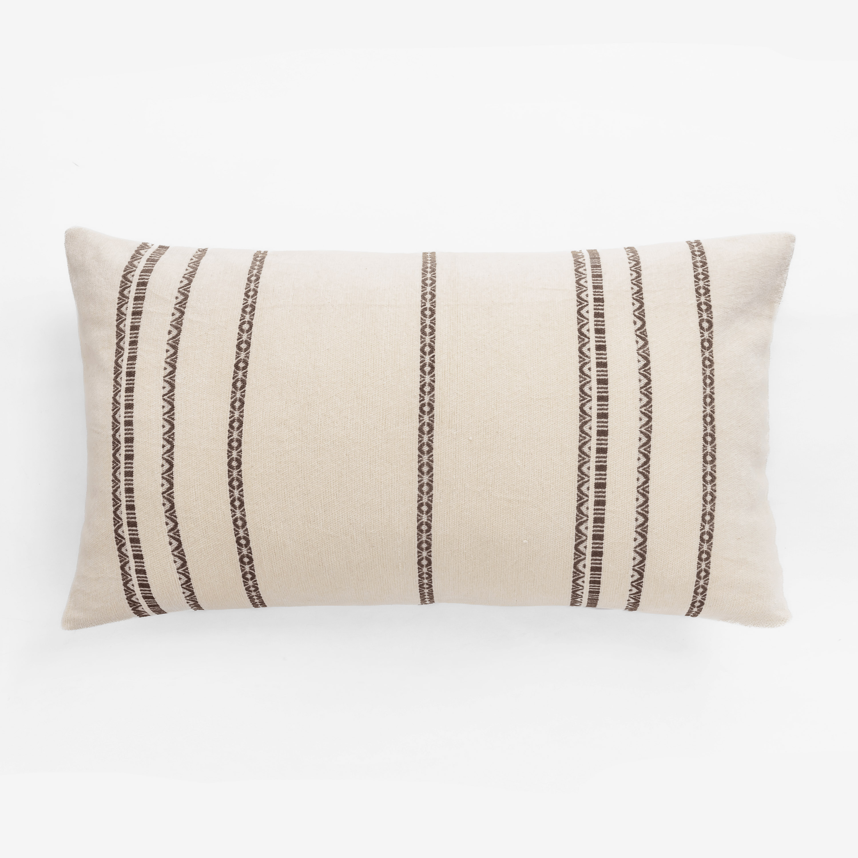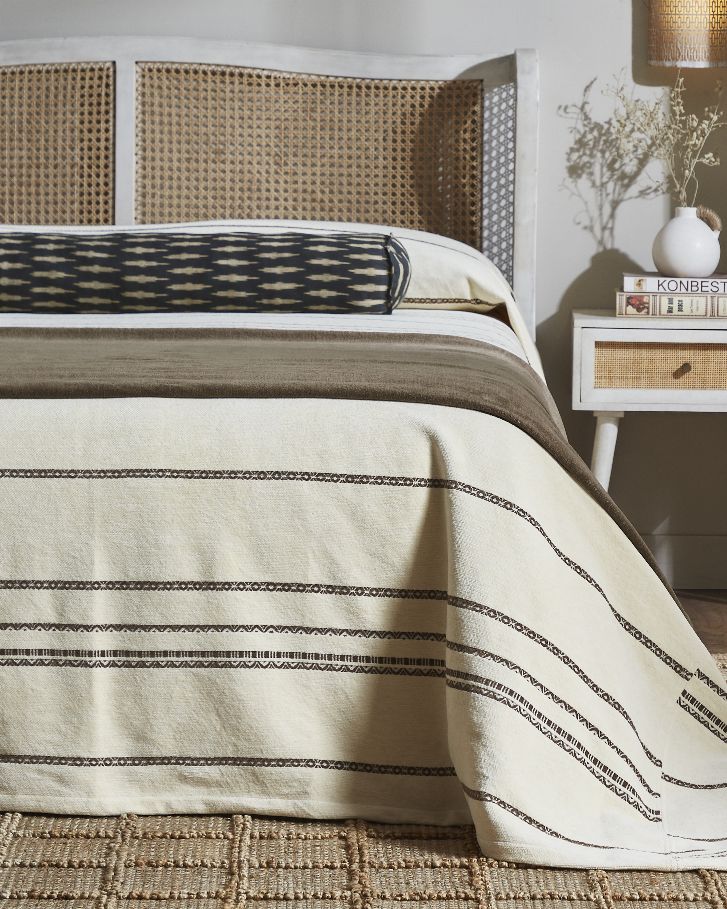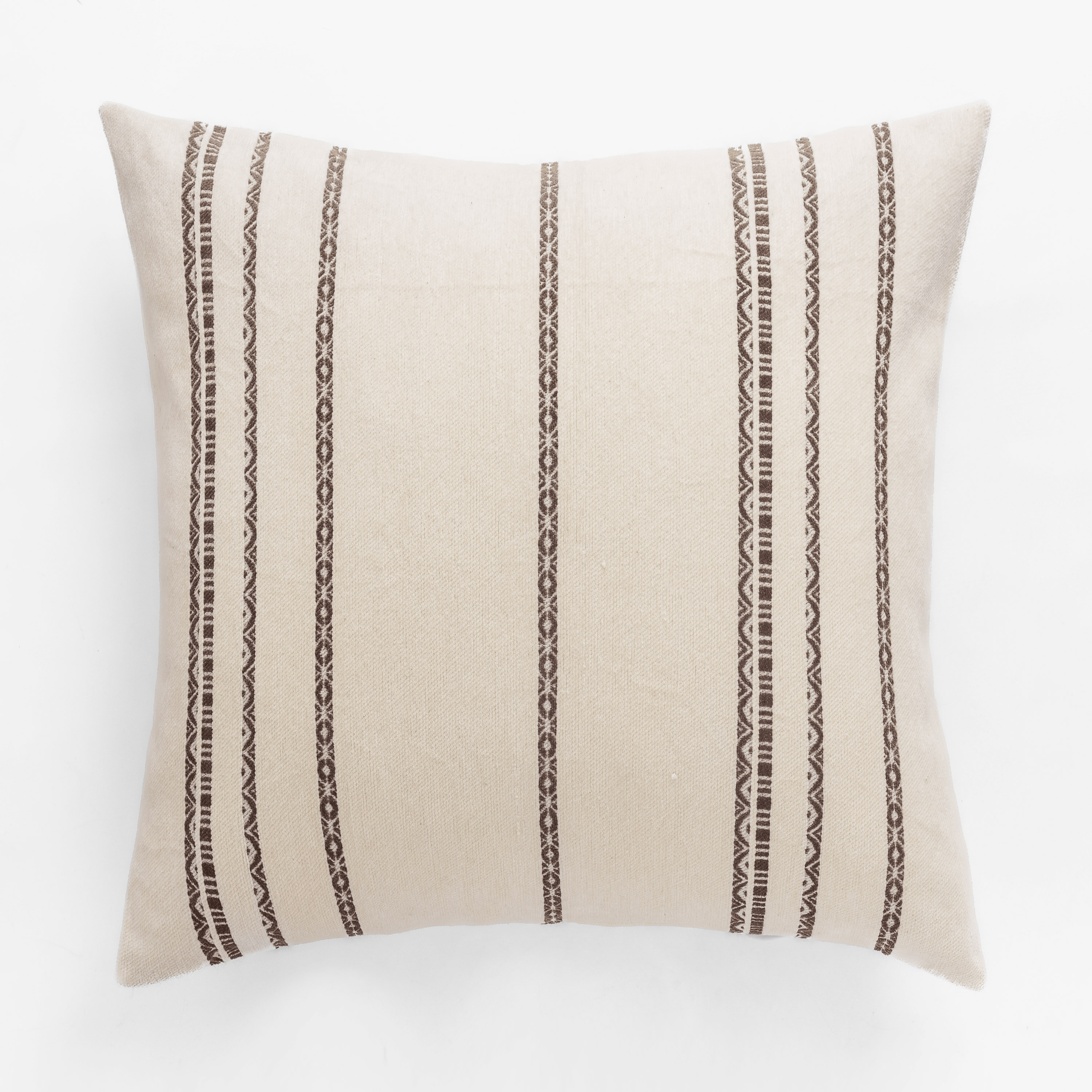 Larkin is crafted from 100% cotton chenille, giving it a soft, textured hand-feel and a subtle, cozy depth. It features inset woven stripes arranged in a clean, evenly spaced layout. Each stripe accented with an interesting geometric motif, adding a refined, artisanal touch. The overall look is warm, natural, and quietly detailed; perfect for layering in both modern and traditional spaced.Â