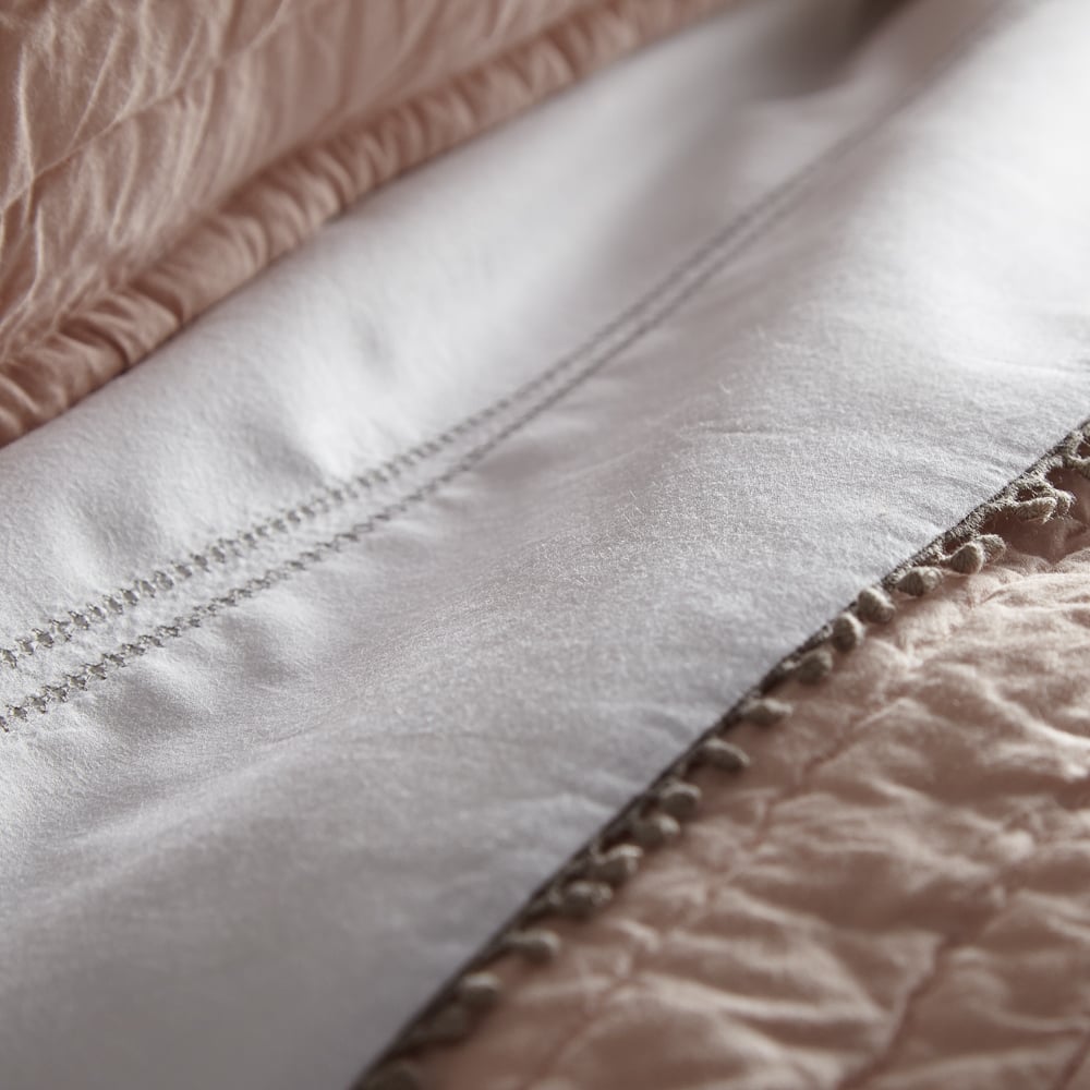 Crisp cotton percale finished with a contrasting hem stitch and delicate tatted trim.