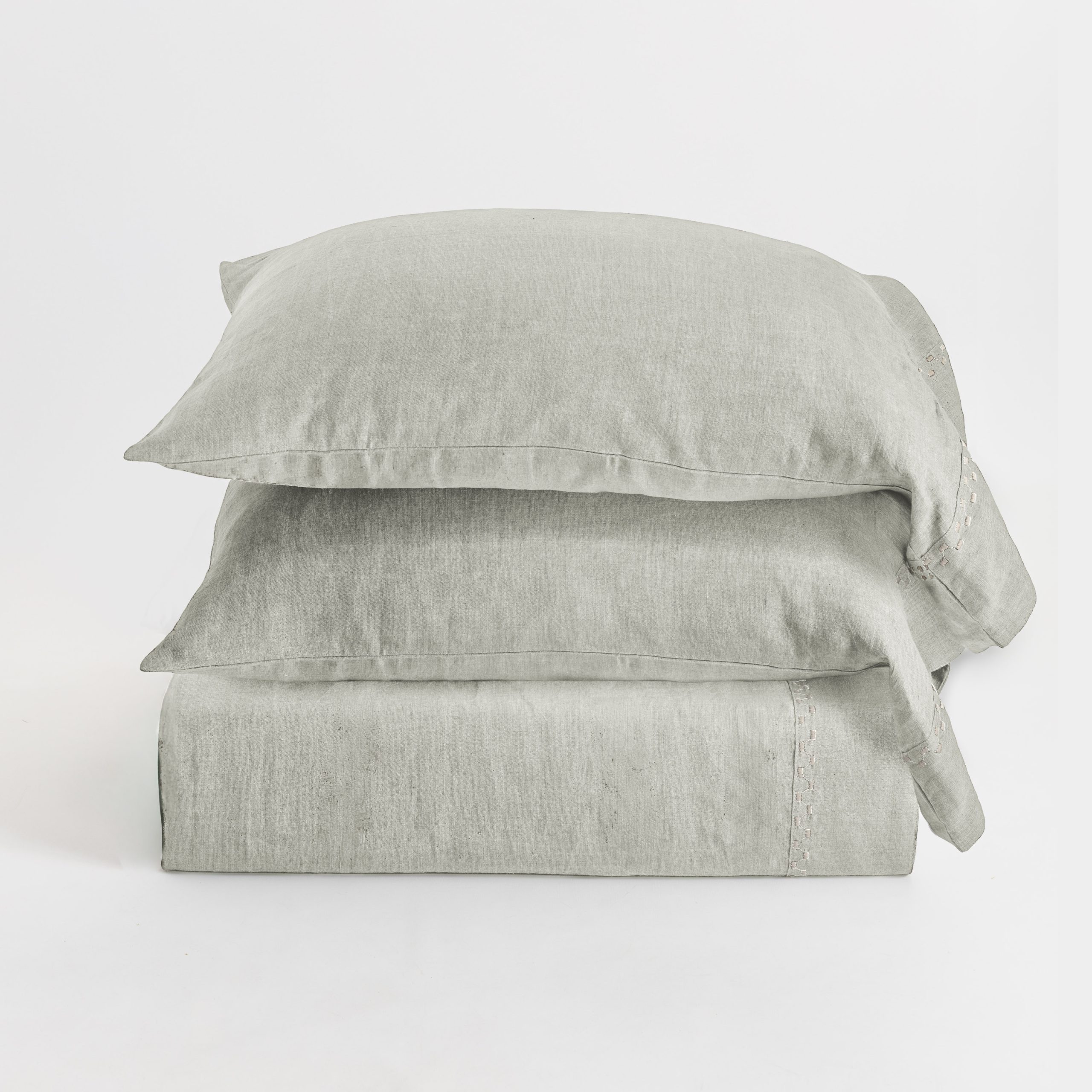 Lois is a linen sheet set featuring a sophisticated stair-step style embroidered trim for understated elegance.