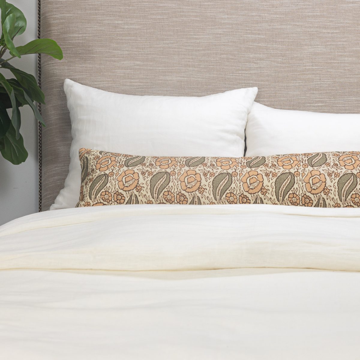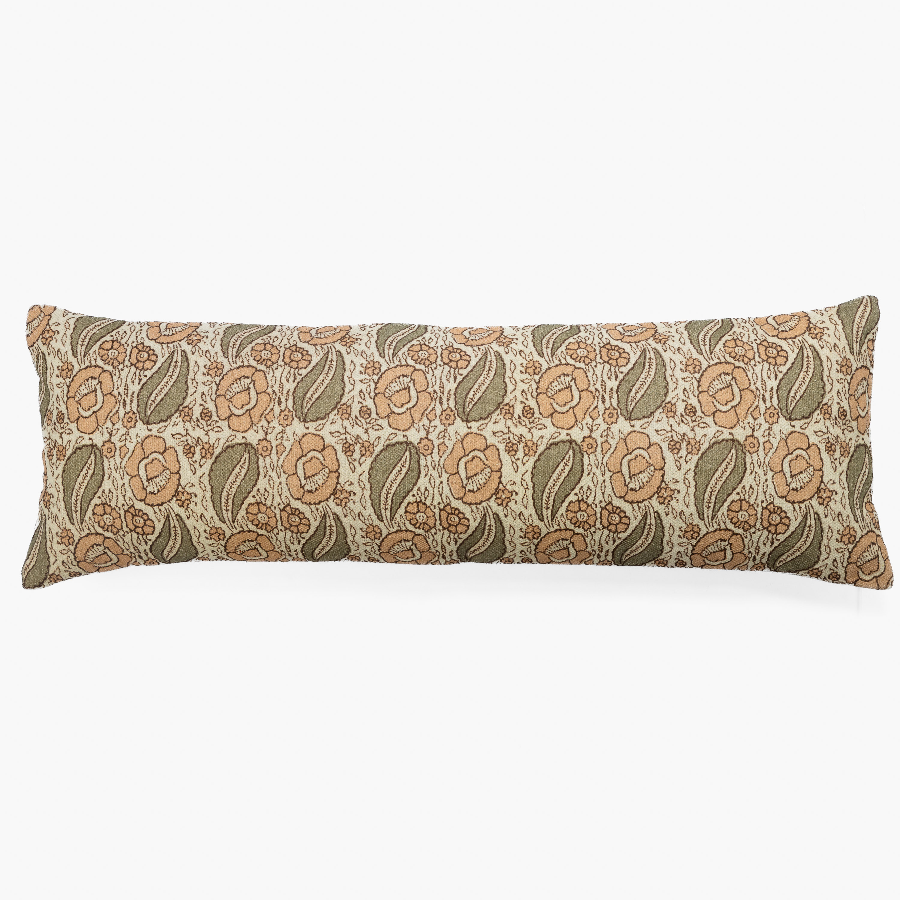 A vintage-inspired statement piece, this extra-long bolster features an intricate floral jacquard in muted peach and olive tones — adding warmth, charm, and timeless elegance to any bedscape.