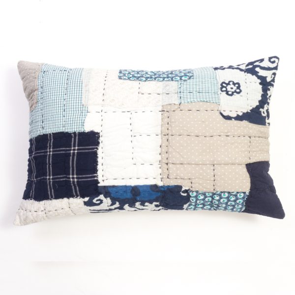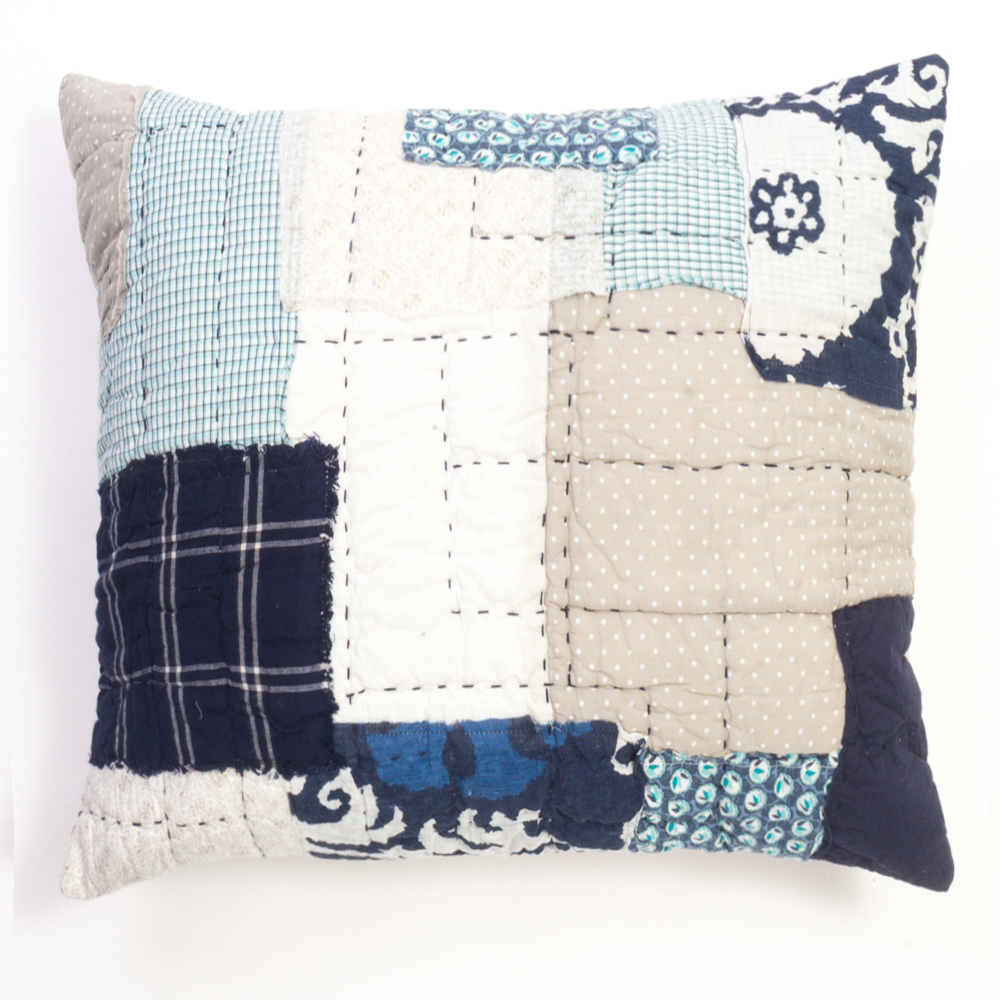 Macey is inspired by traditional utilitarian patchwork quilts in which instead of piecing squares, patches are layered upon one another in an improvisational way resulting in a raw and dynamic effect. Then the piece is hand quilted in an elongated kantha style stitch in an irregular pattern. This quilt is finished with a raw edged binding.
