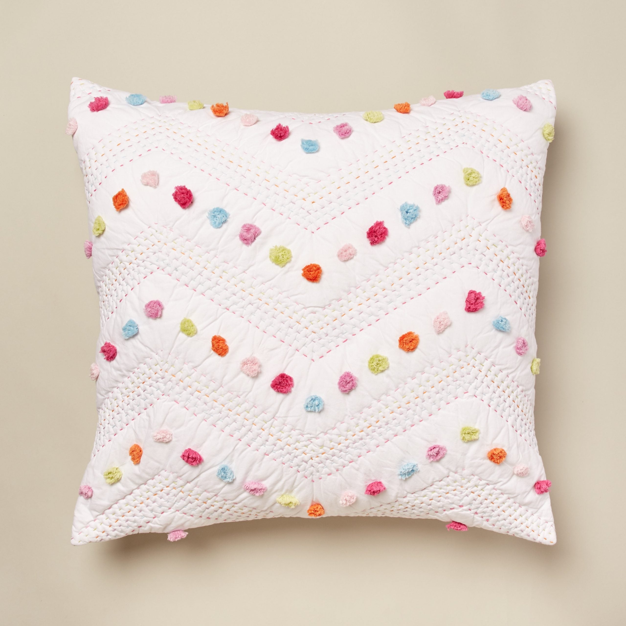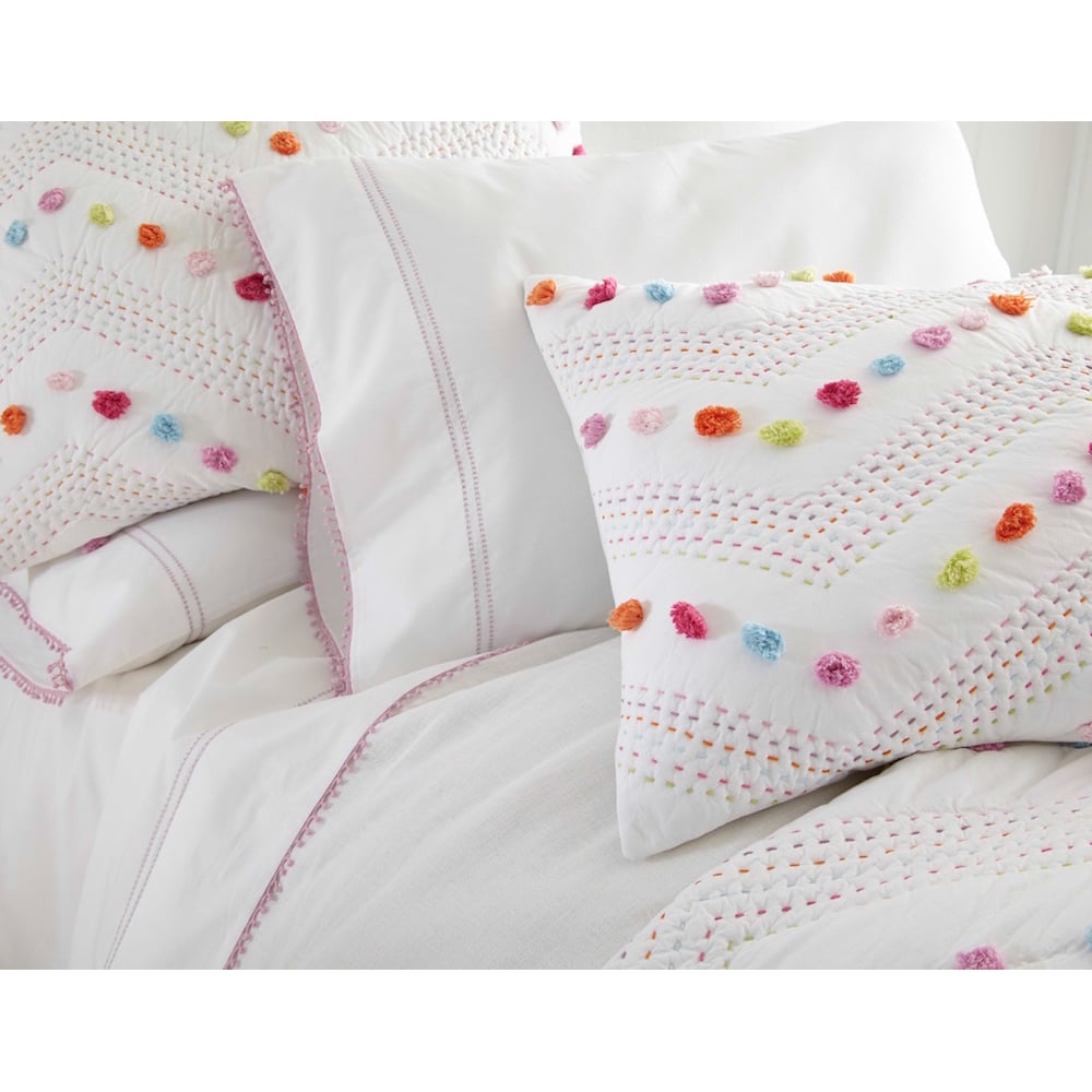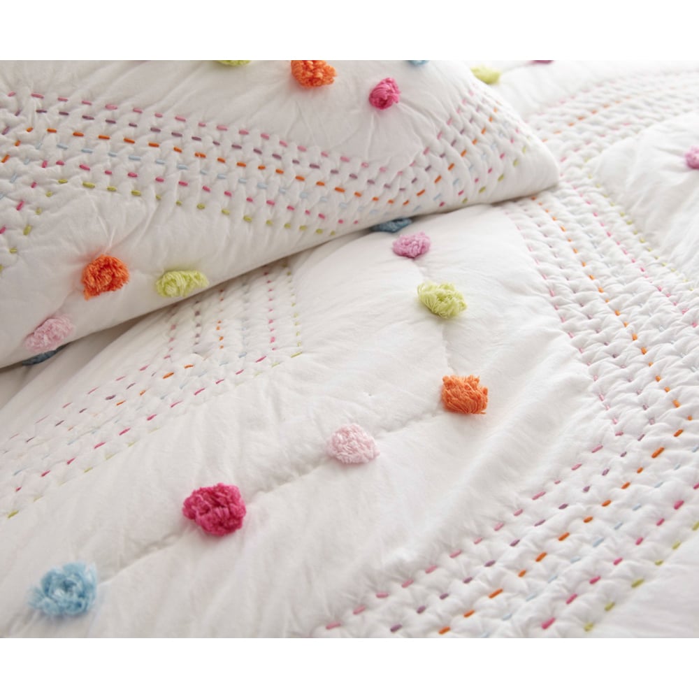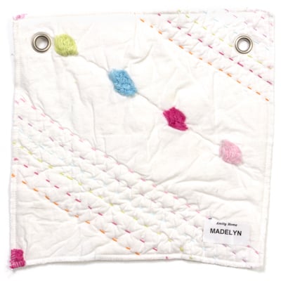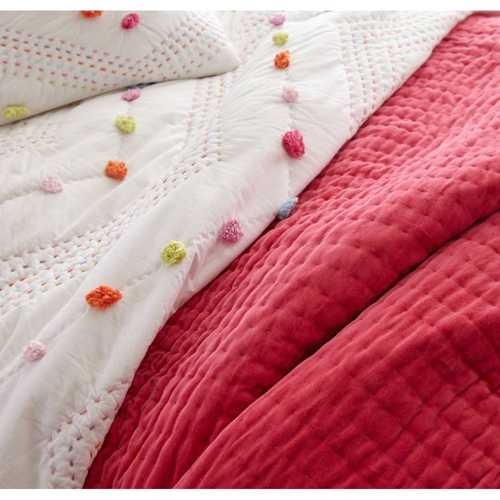 Our Madelyn quilt is bright and cheerful, with rainbow colored Kathana stitching and pom-pom accents in an alternating chevron pattern. Pair it with one of our bright Ethan velvet quilts for an ensemble full of bold colors and soft textures. Madelyn is constructed of supremely soft white cotton voile and adorned with vibrant tufts of cotton and hand quilting.