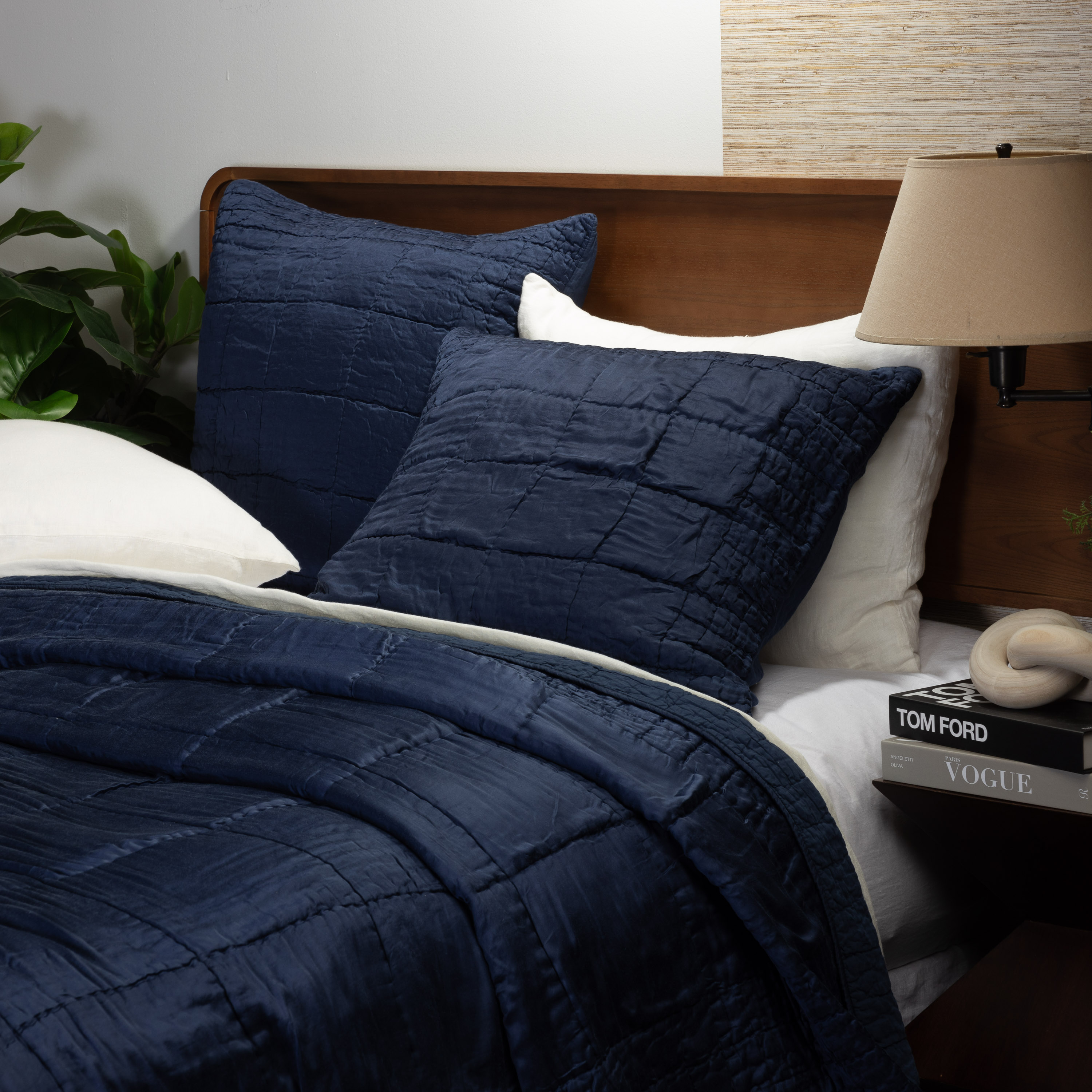 The Madison quilt is constructed of silky viscose backed with soft cotton voile and hand quilted in a gridded block pattern with a quarter scale border. This collection has an air of modern elegance when dressed up and can easily lend itself to a more bohemian flair depending on application.
