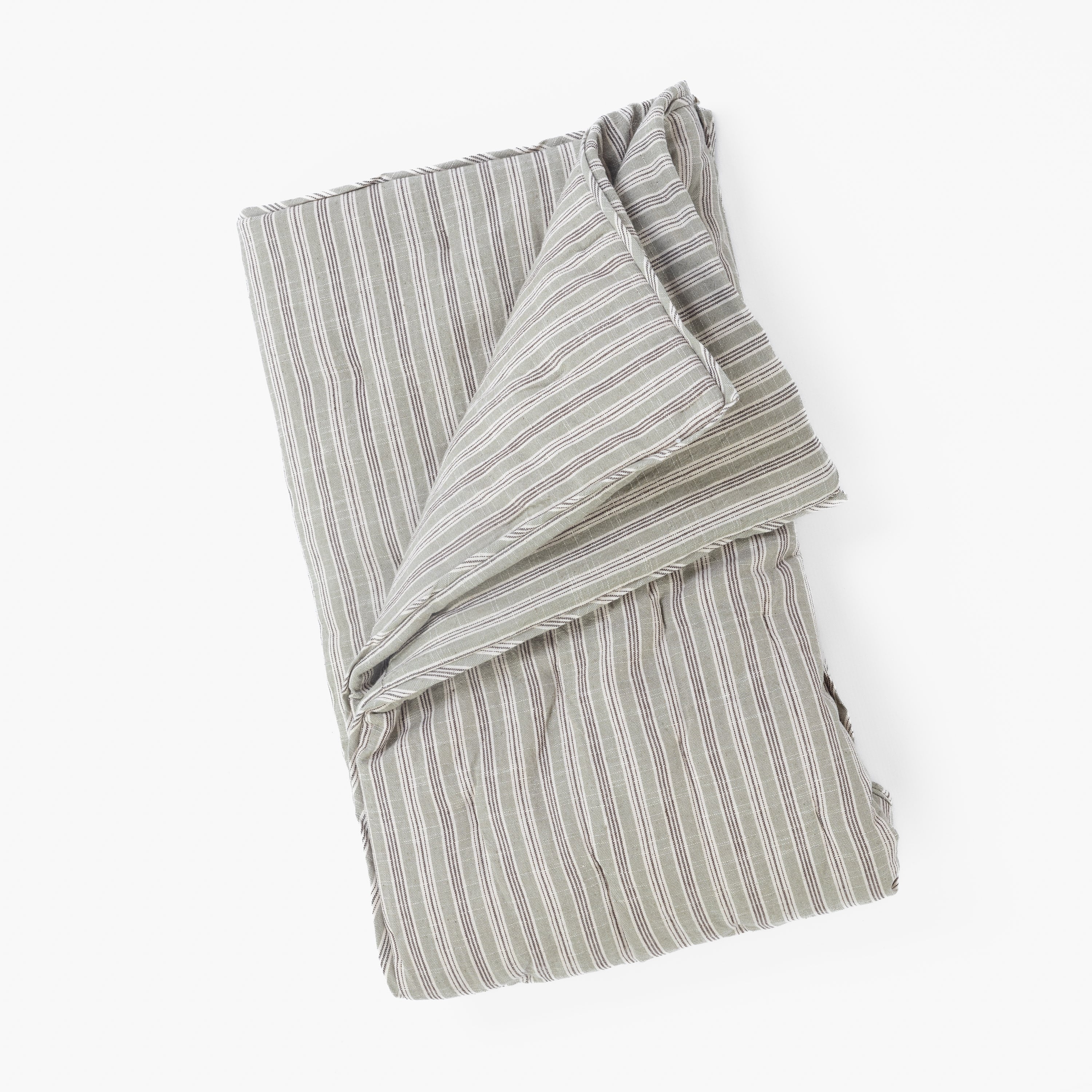 This charming quilt showcases a lovely, timeless design that combines modern comfort with classic aesthetics. Crafted from 100% cotton cloth, it features a delightful slubby texture that adds depth and character to its appearance. The quilt is inspired by the traditional ticking stripe pattern, giving it a nostalgic yet sophisticated feel. With a lofty fill, this collection promises warmth and coziness. The quilt is beautifully finished with a bias-cut flange, adding a refined touch to its overall design and effortlessly blending style and comfort.