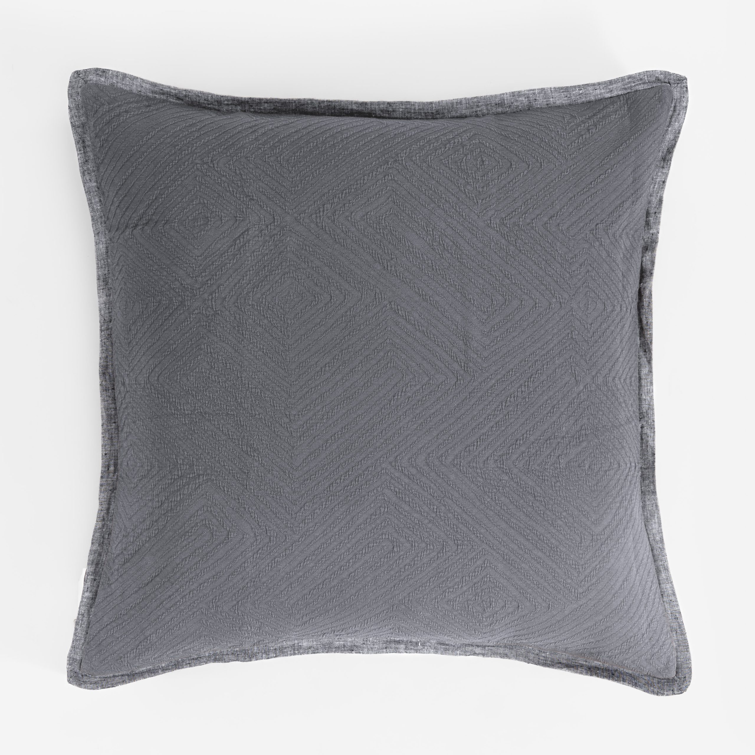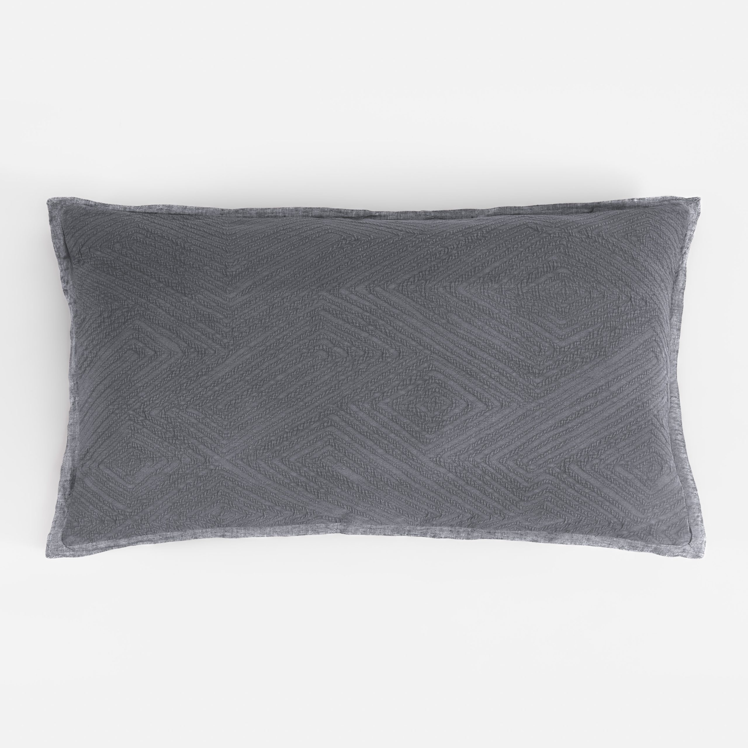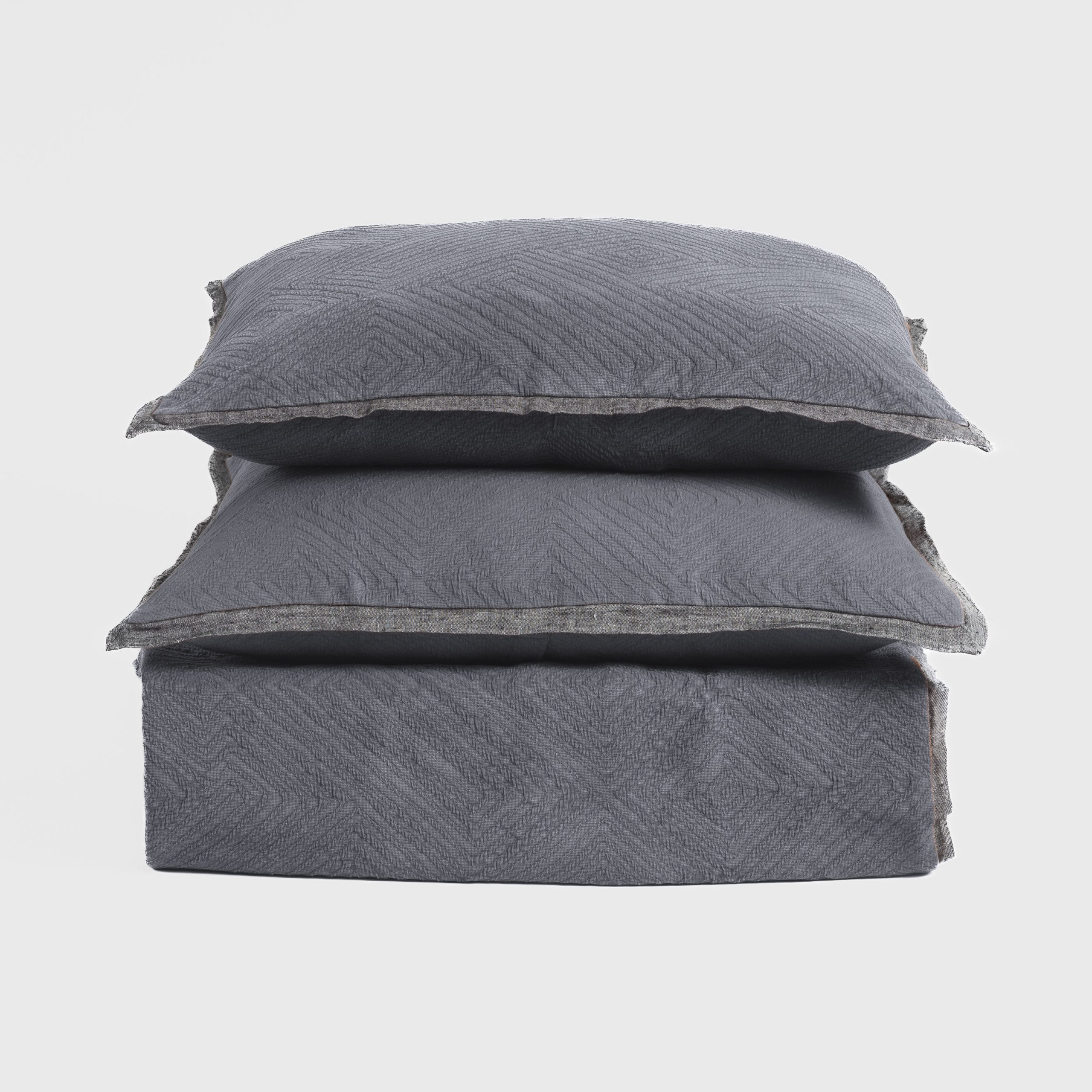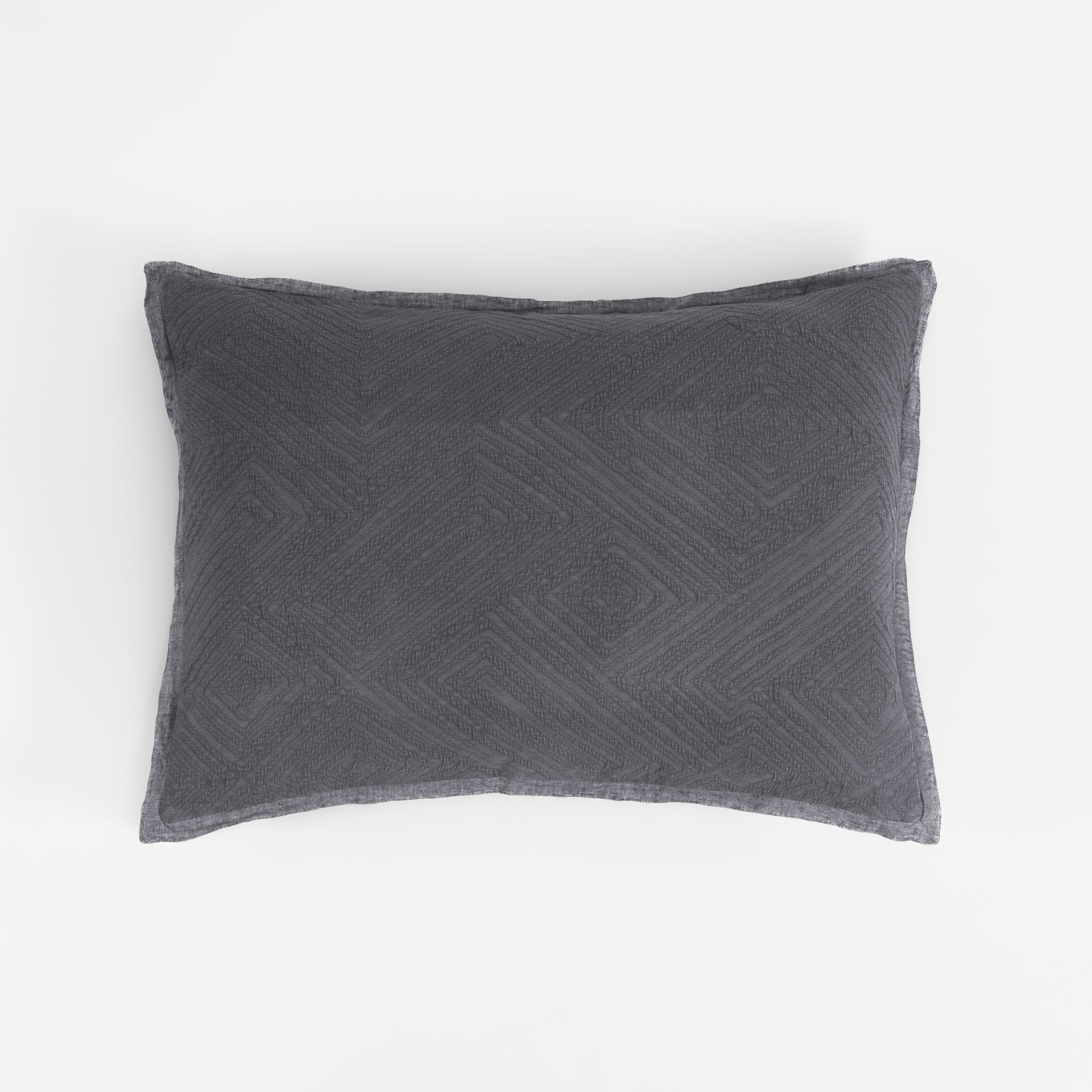 This striking coverlet is woven on a jacquard loom to create a three-dimensional raised design. The angular pattern is paired with a fine linen flange in a contrasting asphalt chambray both of which lends a modern flair to this collection.