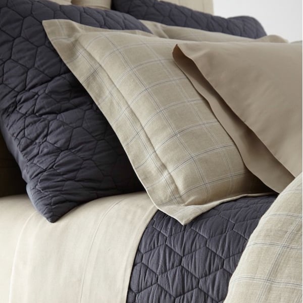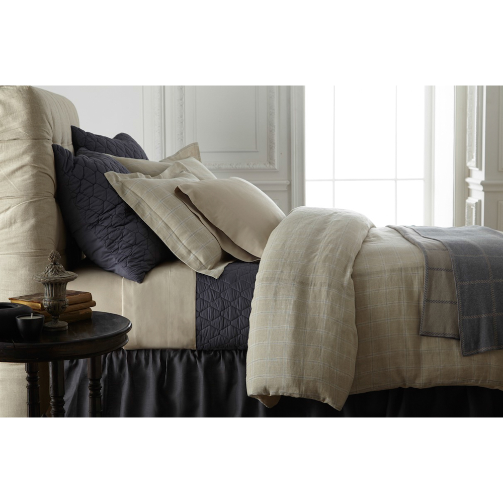 Mossett in Steel Blue pulls out the deepest yarn in Zach, a yarn dyed windowpane plaid duvet cover. The Luxx Modal sheet set in Pebble maintains the warm palette.