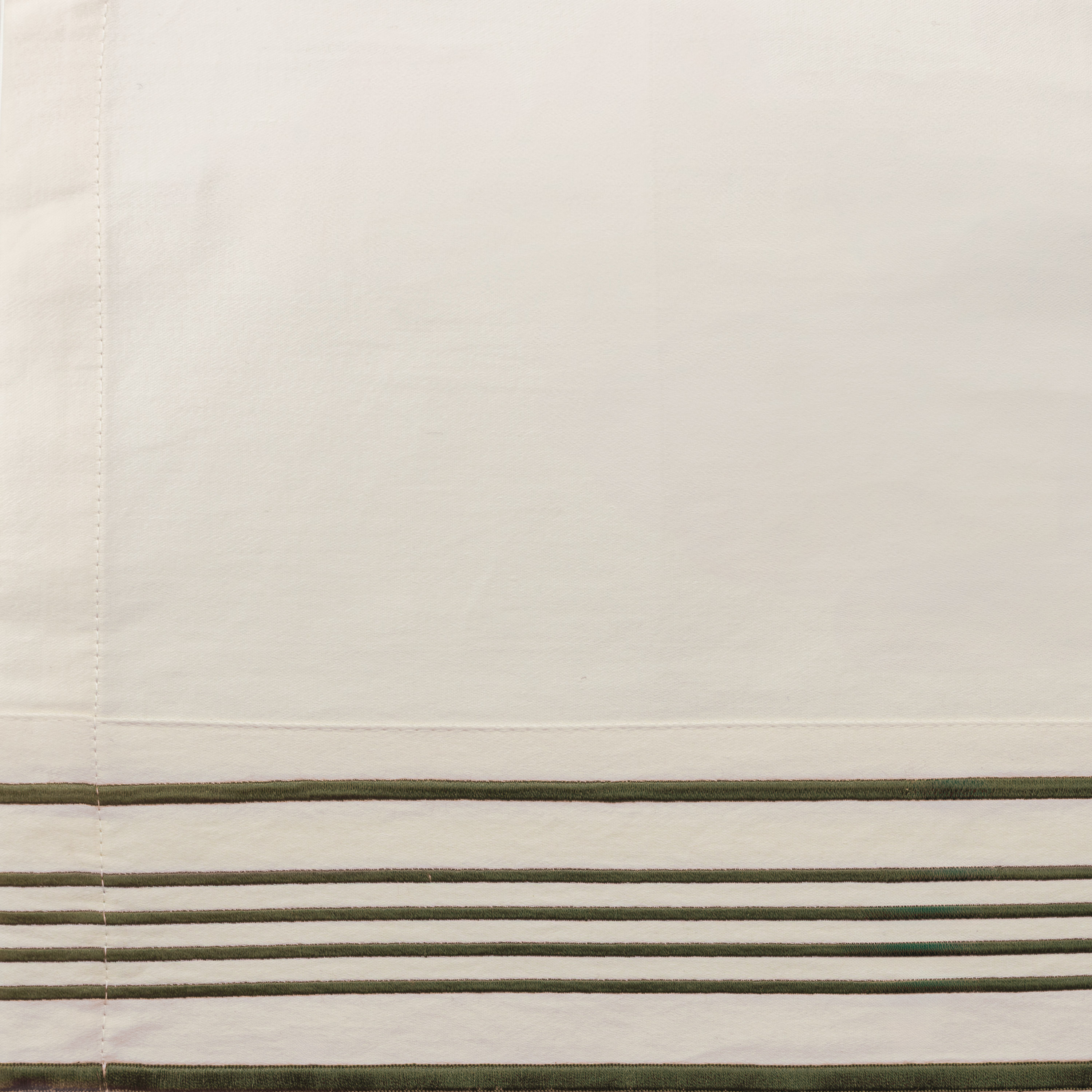 Crisp 400 thread count cotton sateen sheeting, in warm ivory with embroidered concentric bands. All of our sheets are sold as Sets including Flat, Fitted and Pillowcase(s). Extra Pillowcases (sold as Pairs) can also be purchased. The Nell Sheet set is ivory with available embroidery in
