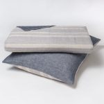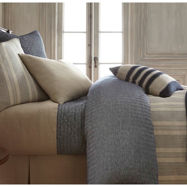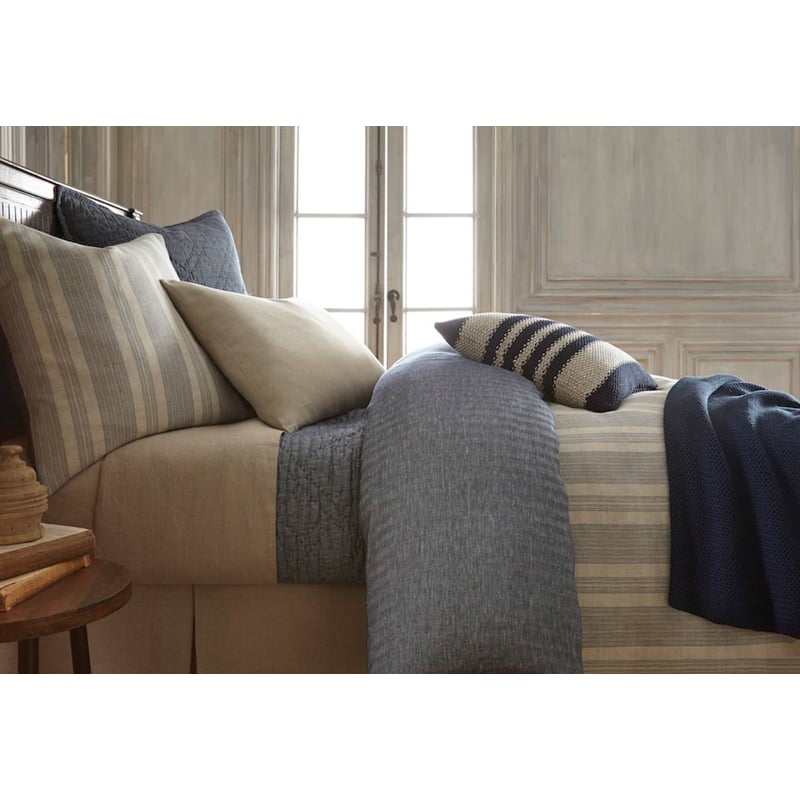 The Noah duvet cover reverses from a yarn dyed balanced stripe woven in natural linen with Indigo colored stripes to an all over herringbone pattern woven of linen dyed to rich indigo hues.