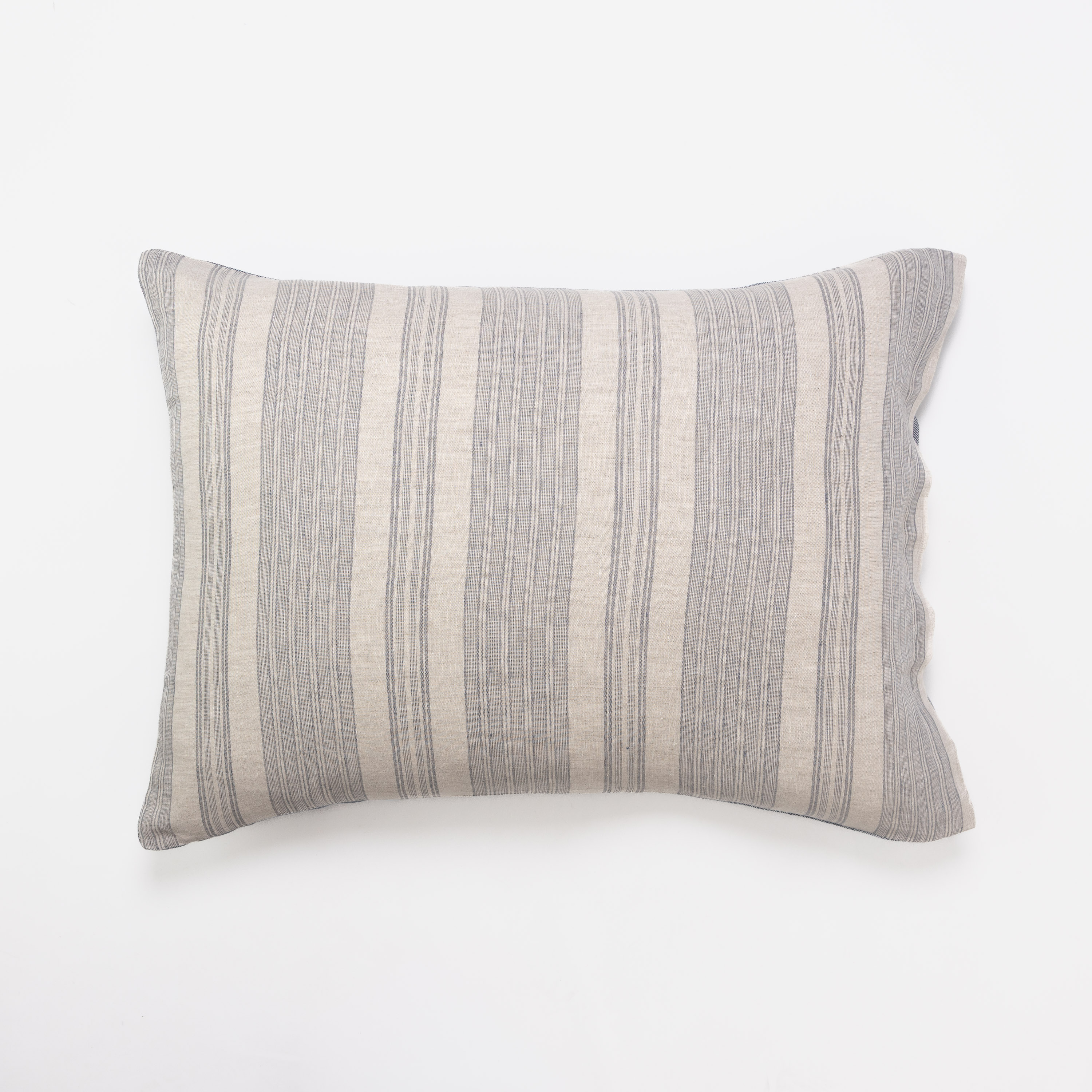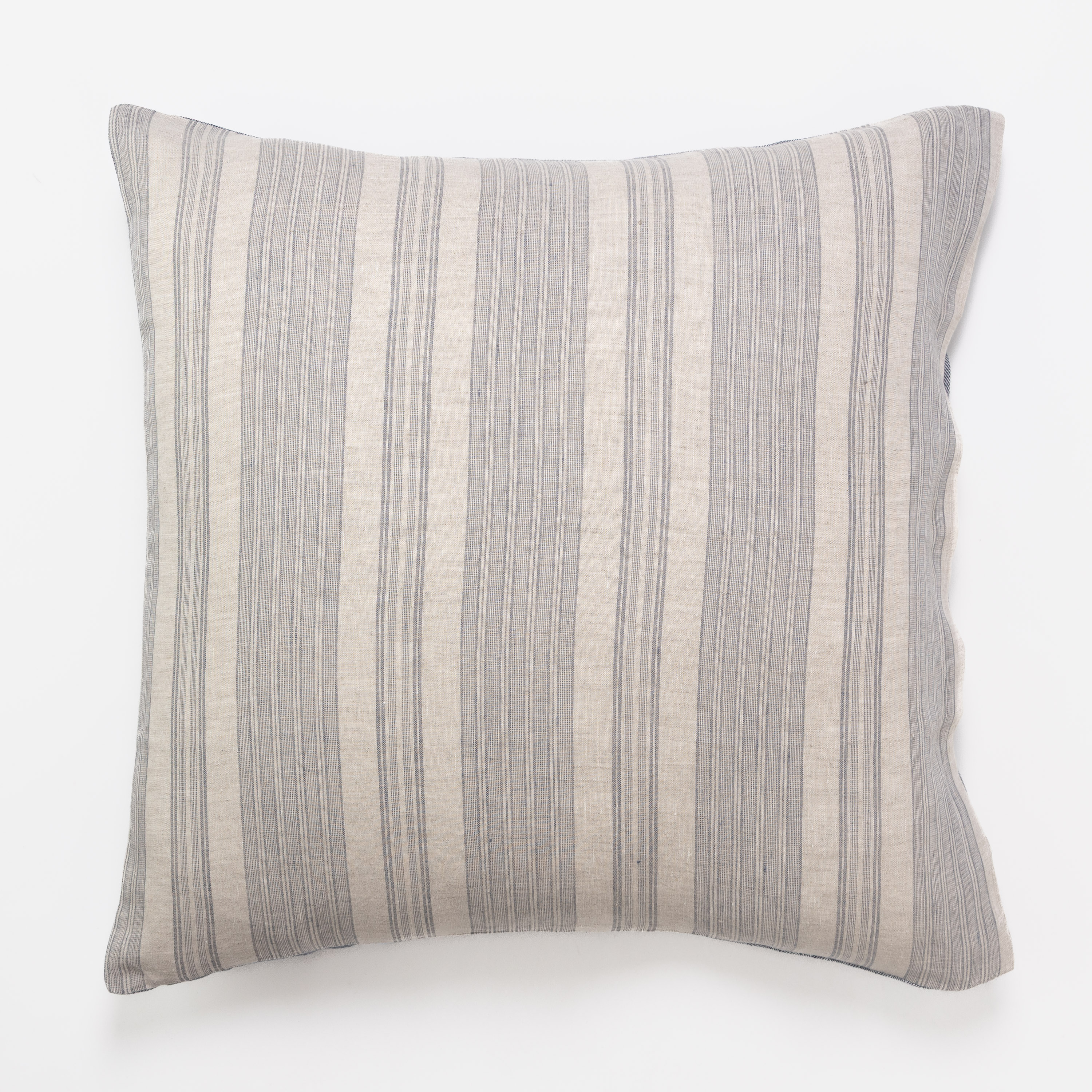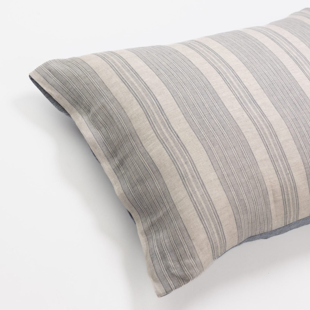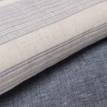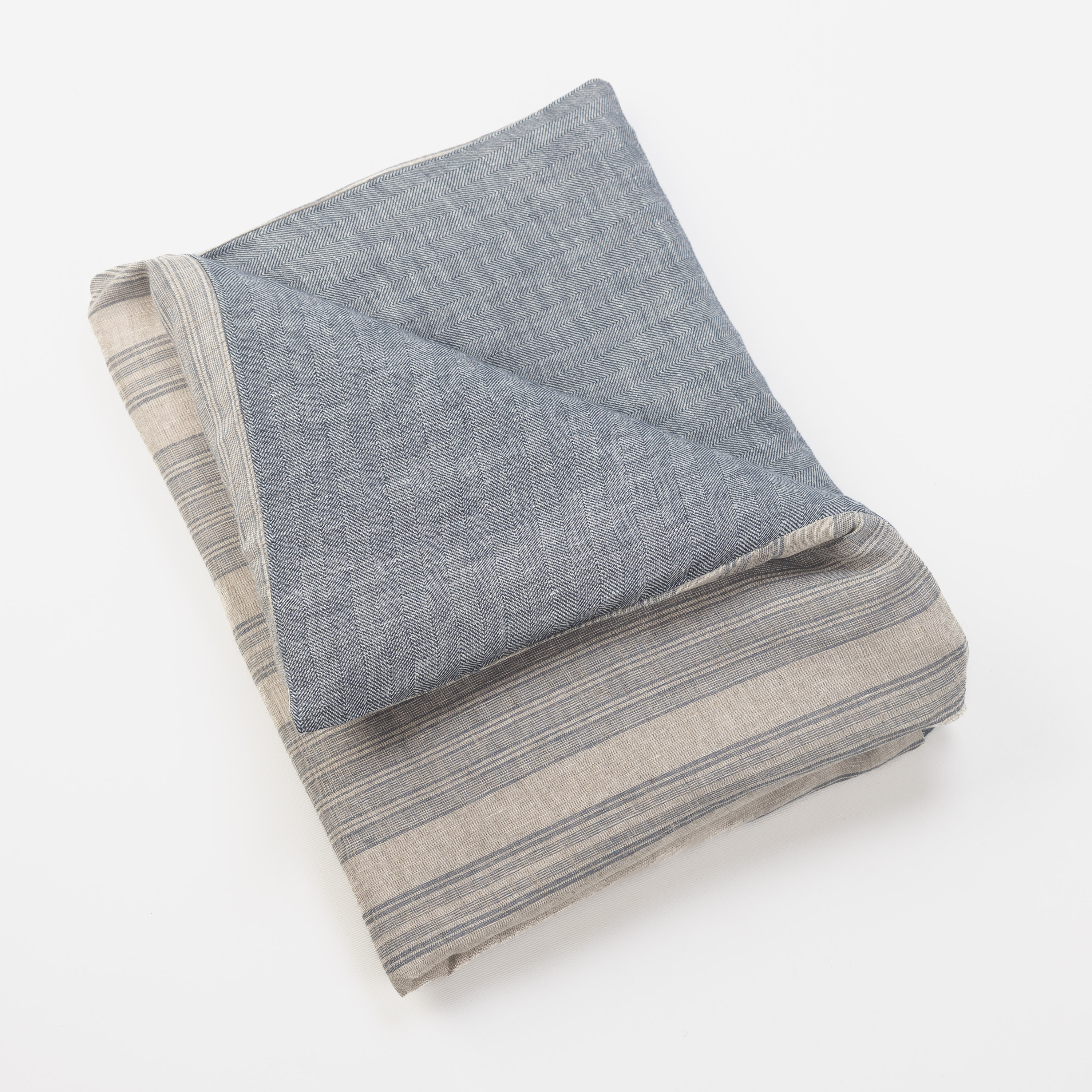 The Noah duvet cover reverses from a yarn dyed balanced stripe woven in natural linen with Indigo colored stripes to an all over herringbone pattern woven of linen dyed to rich indigo hues.