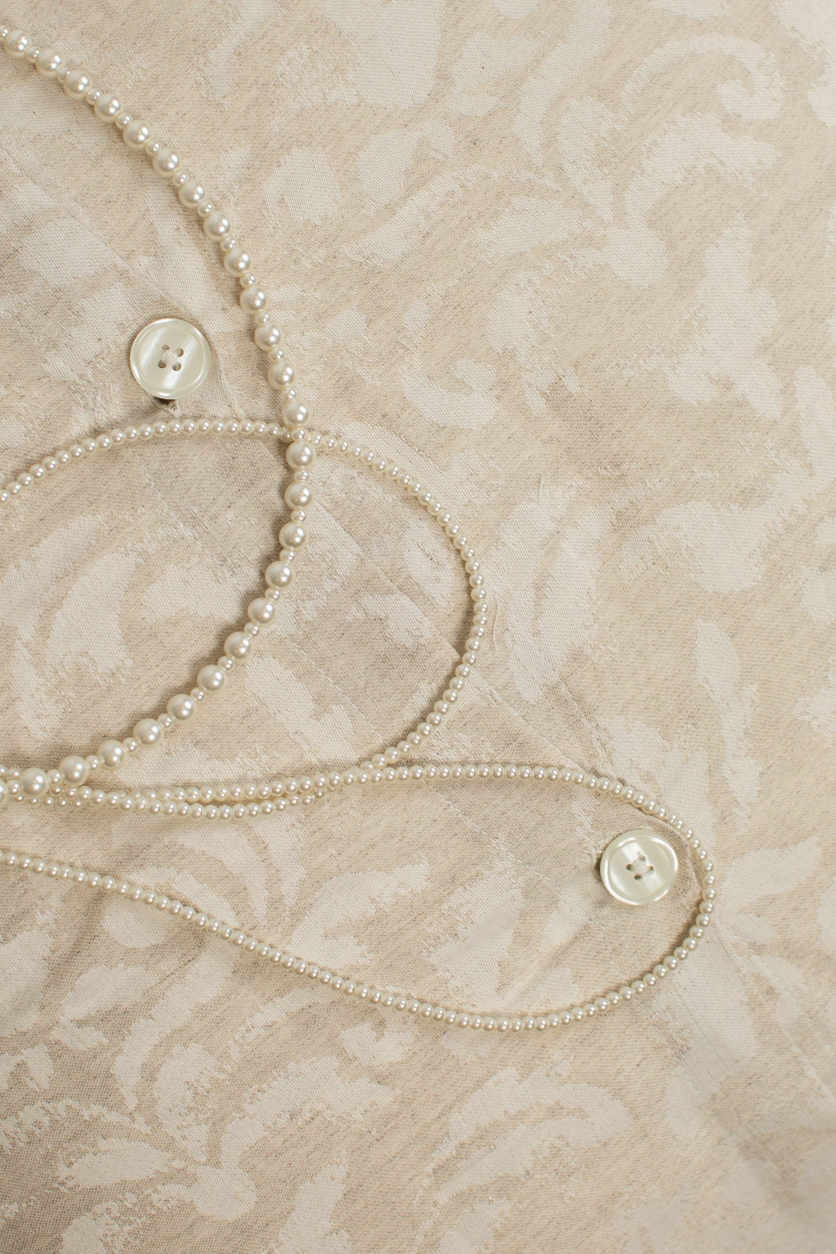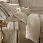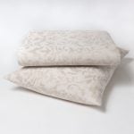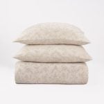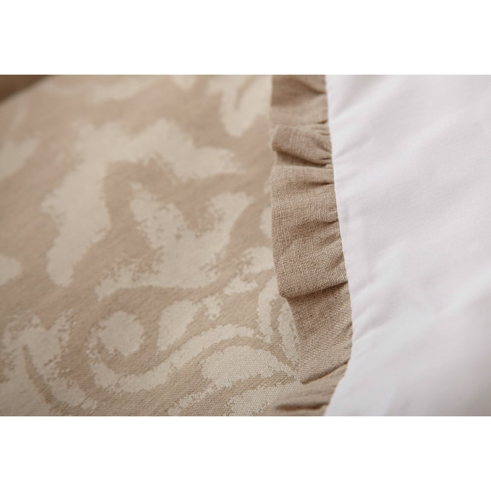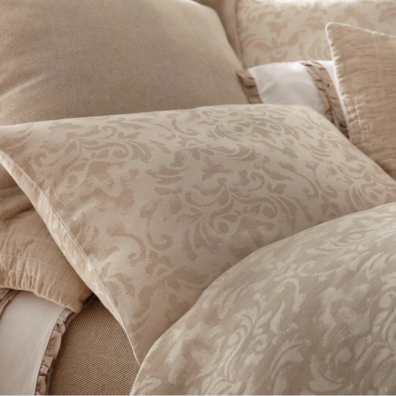 Contrast the whispering damask of Odette with a structured coverlet and skirt like Titus for a formal feel. The subtle strié of the Rocco quilt adds another layer of warmth and texture. Finished with the Petite Ruffle sheet set in natural adds a touch of flair.