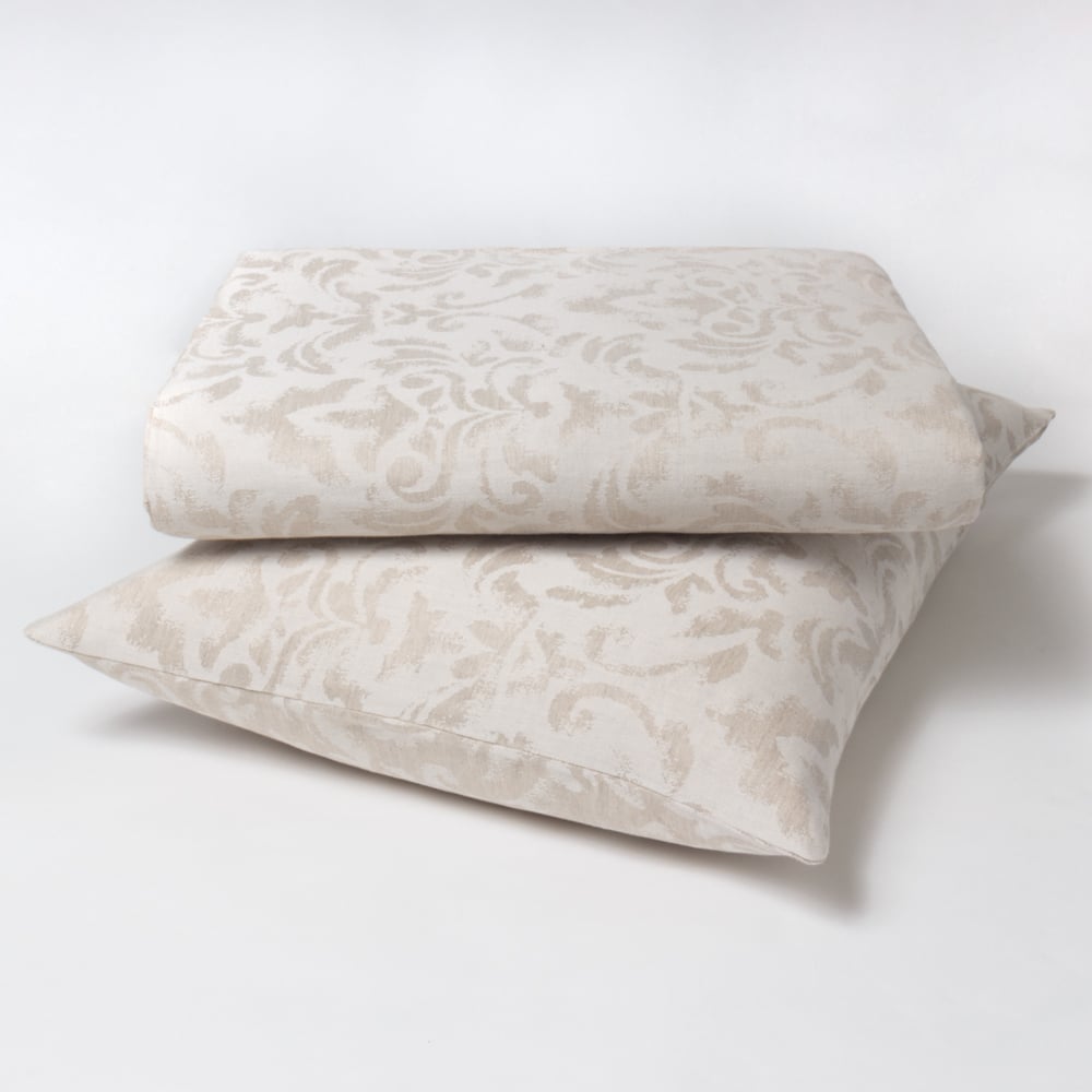 Fine linen and cotton are woven together in a classic damask pattern. Using both plain and sateen weave styles to create a dynamic finish, this pattern can be dressed up or down based on setting and companion pieces selected.