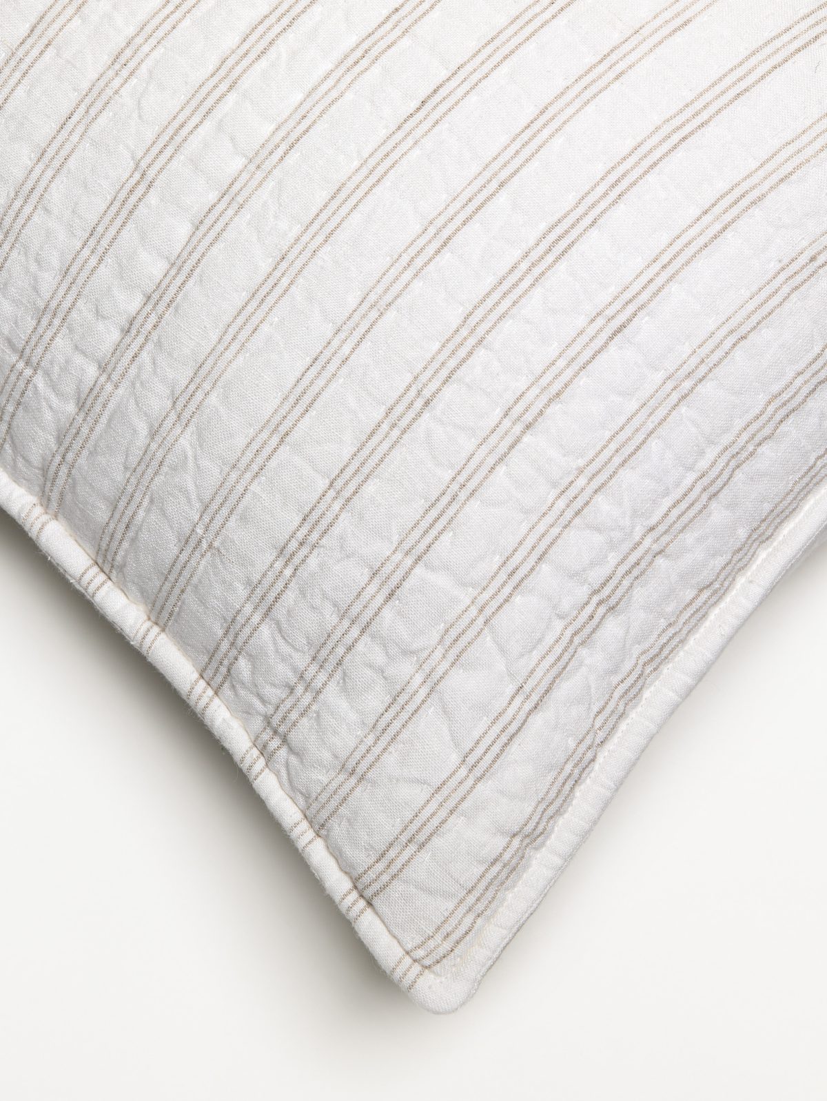 Owen is a classic yarn dyed ticking stripe woven of 100% fine linen. Hand quilting lends a vintage feel to this collection that can be used in a wide variety of styles.