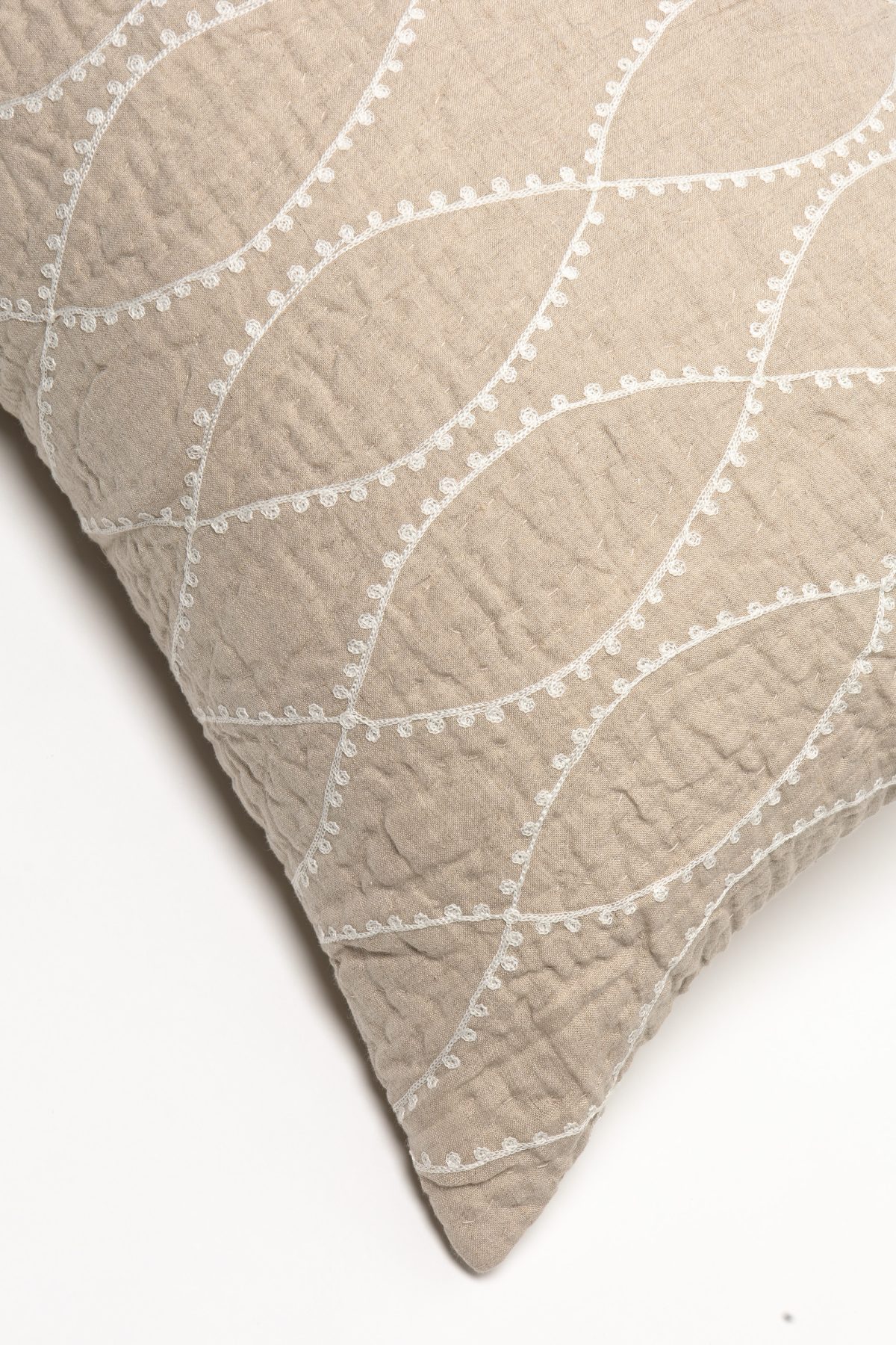 Fine natural linen is embroidered with traditional ‘Aari work’, a technique that resembles a delicate chain stitch. The simplified pattern of the embroidery was inspired by an elegant Parisian wrought iron gate for an overall look that is both graphic and graceful.