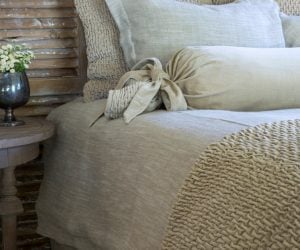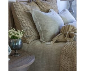 This skirt is constructed of a rich, middle-weight slub linen cloth that as been washed to create a luscious texture and a beautiful drape. It is designed with a tailored, inverted pleat and finished with an eyelash edge at the bottom. Constructed in three pieces with a 21” drop, this skirt can easily be adjusted on site to any height up to 21” simply by placement. The Ranier bed skirt is available in