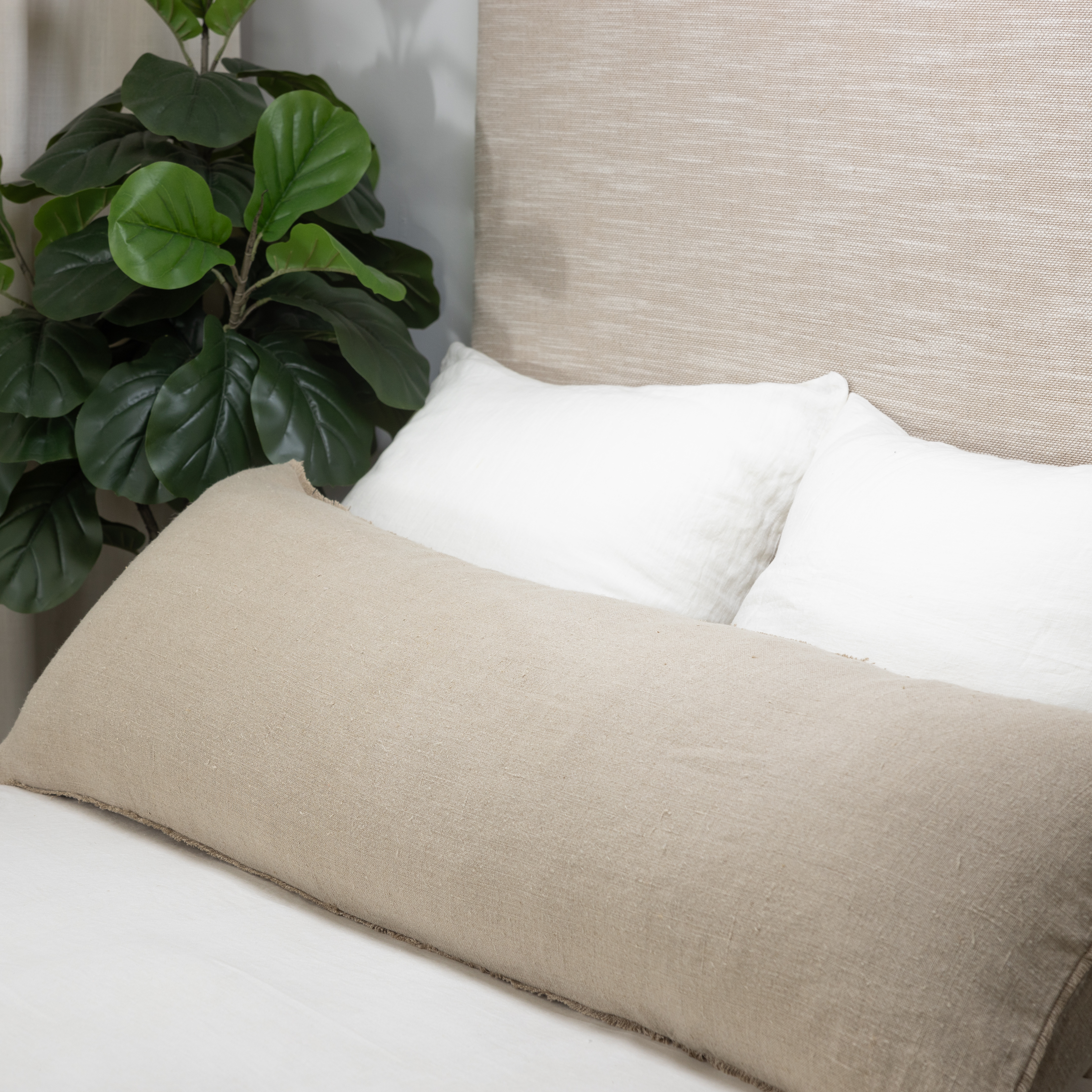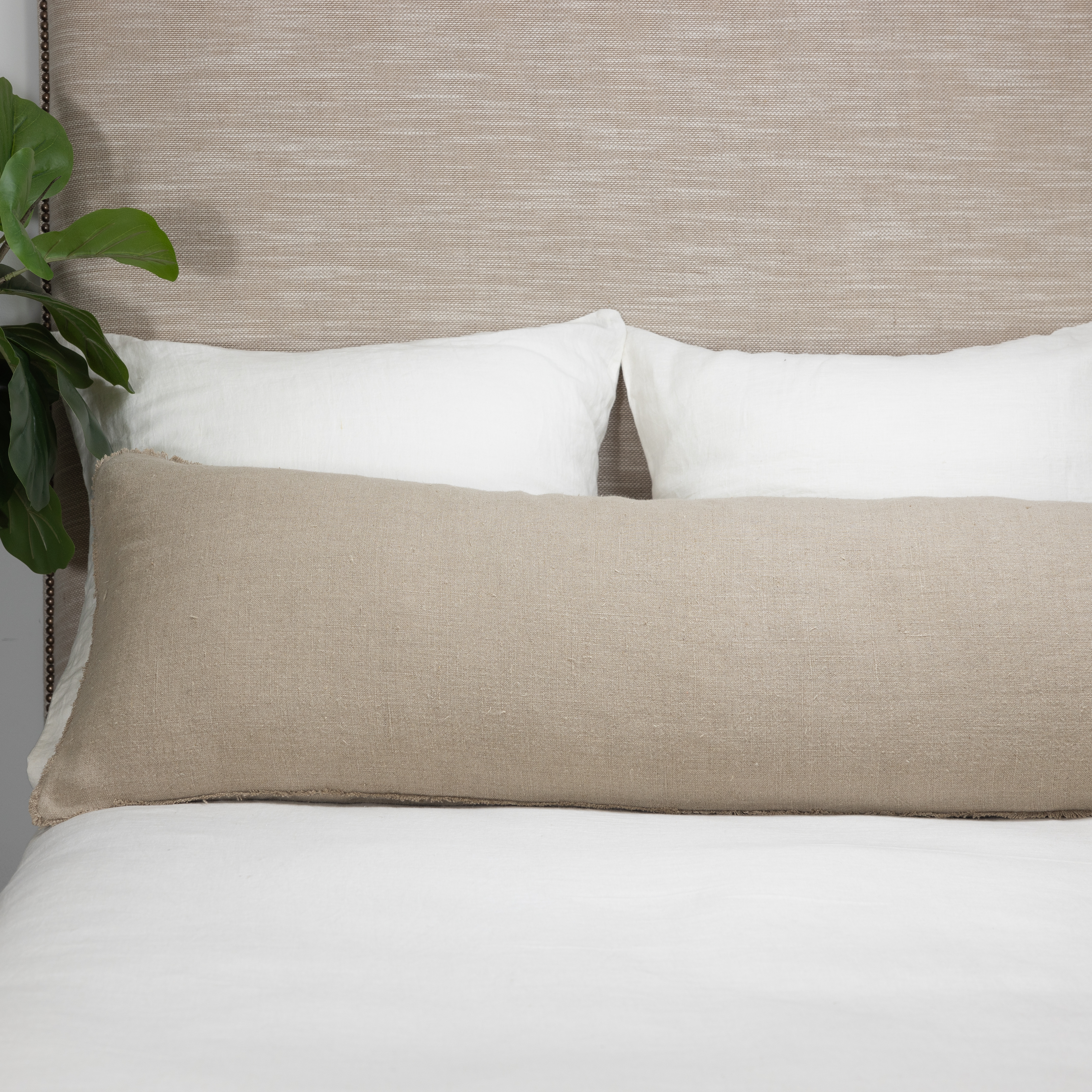 A rich middle weight slub linen cloth that as been washed to create loft in the fibers and a supremely soft hand and pleasant drape. Finished with an eyelash edge flange this Body PIllow offers sophistication and freshness.