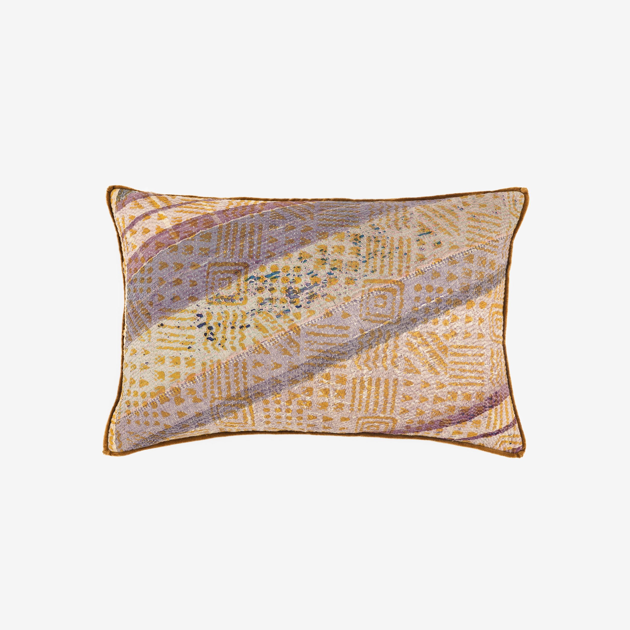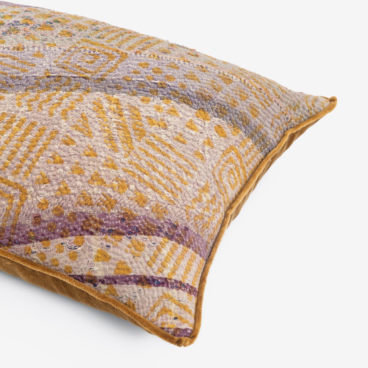 Ravi features hand-selected vintage kantha quilts, making each pillow truly one of a kind in a limited edition of four or nine. Every pillow carries its own story and is finished with a contrasting cotton velvet back and delicate micro flange. Kantha quilts are hand-stitched from layers of repurposed vintage fabrics, each bearing the unique story and artistry of its maker. Lightweight, textured, and one-of-a-kind, they bring a timeless, handcrafted charm to any space.