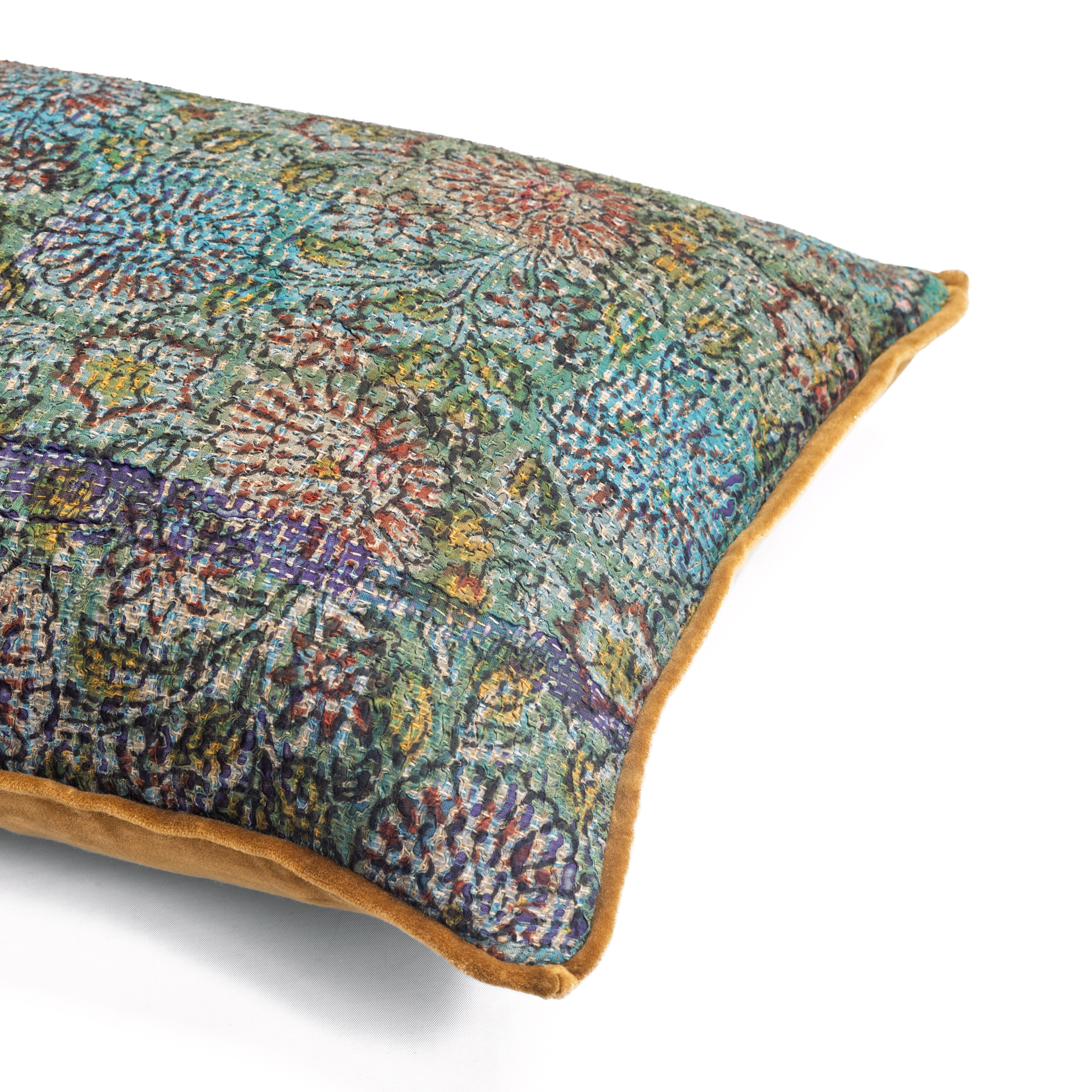 Ravi features hand-selected vintage kantha quilts, making each pillow truly one of a kind in a limited edition of four or nine. Every pillow carries its own story and is finished with a contrasting cotton velvet back and delicate micro flange. Kantha quilts are hand-stitched from layers of repurposed vintage fabrics, each bearing the unique story and artistry of its maker. Lightweight, textured, and one-of-a-kind, they bring a timeless, handcrafted charm to any space.