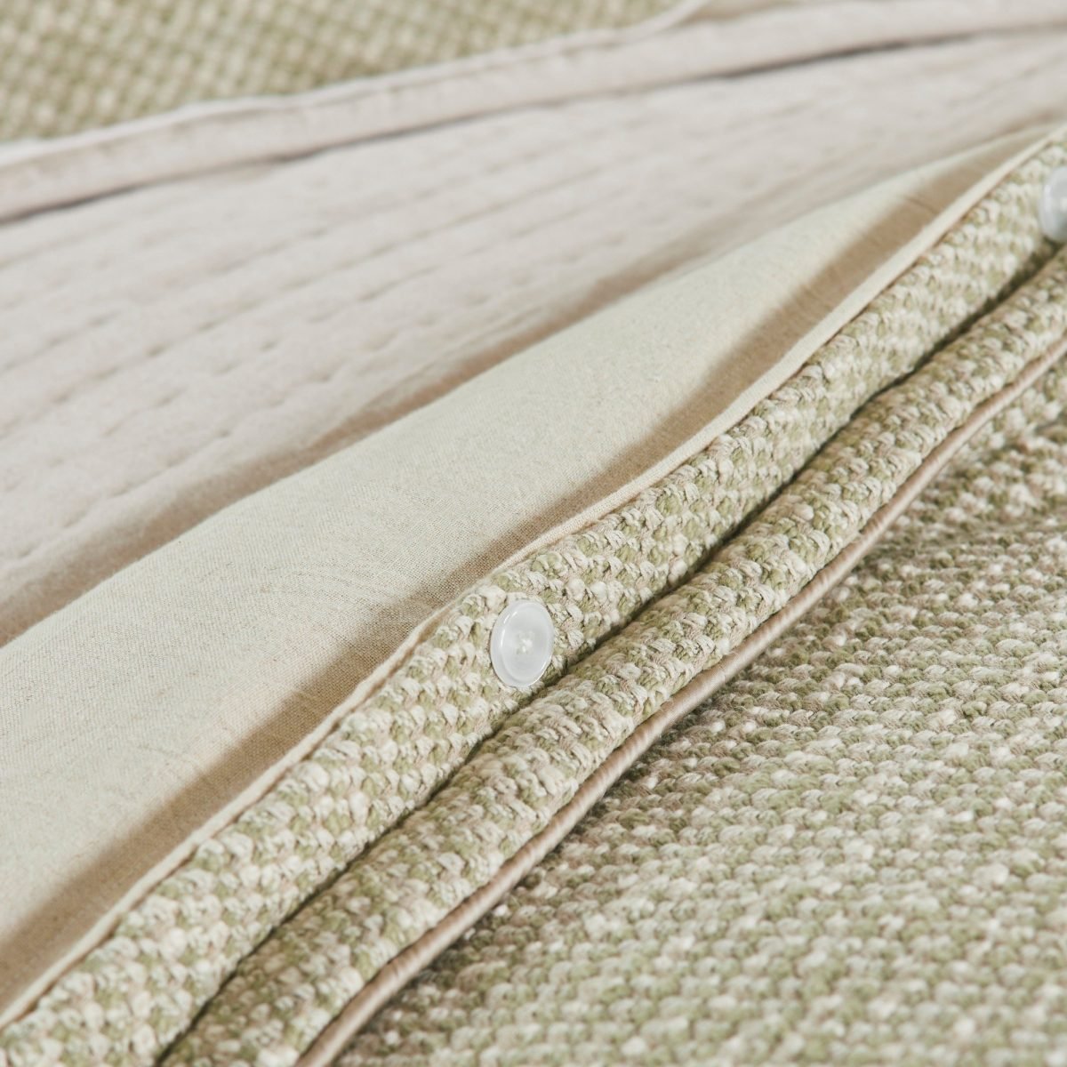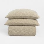 The Renzo duvet cover offers soft subtle color with dramatic texture as plush cotton yards are woven together with Ivory and Taupe. This duvet is finished with a sateen pipe in oyster and backed with a finely woven cotton/flax blend. Shams are self-backed with button closure.