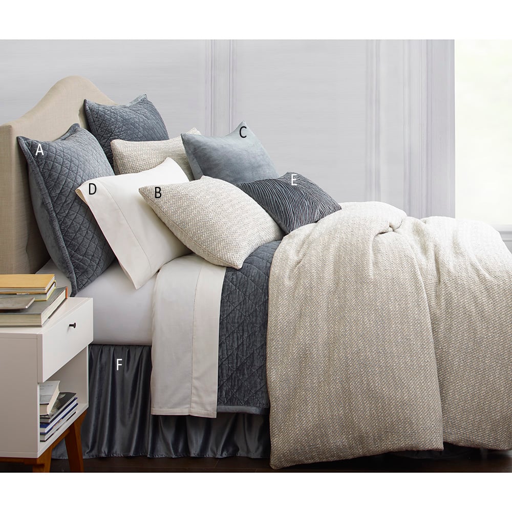 A versatile collection, the textured Renzo Limestone duvet cover is paired here with the lustrous Simona velvet quilt and Lia velvet skirt both in Steel Blue for a rich, upscale ensemble. The Murano Ivory sheet set maintains the elevated air of this setting with detailed hem stitching and offers crispness without being stark. A sleek Lia sham acts as accent companion to the pin tucked Beatrix bolster.