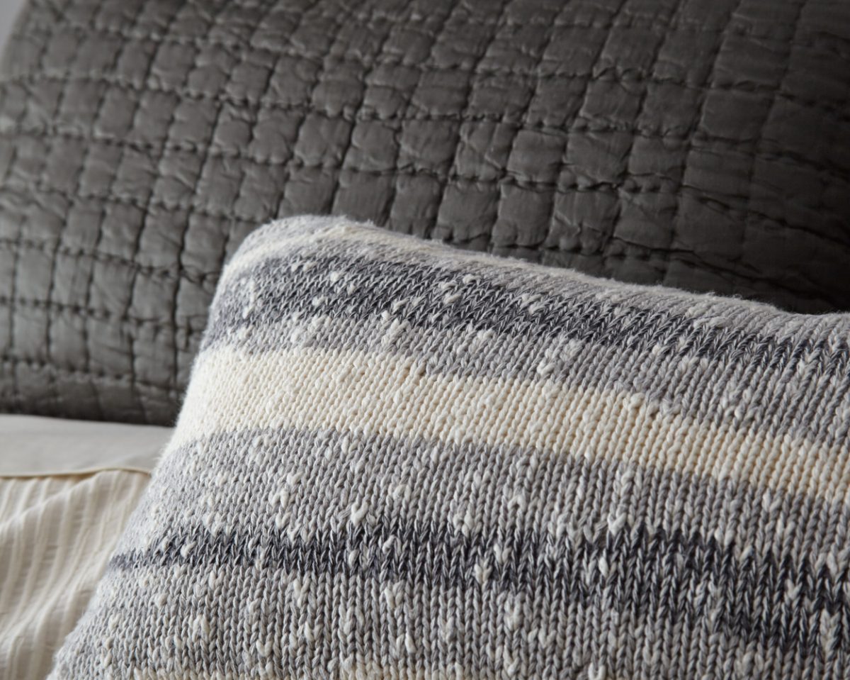 Bold stitches make a remarkably cozy statement on our Roswell top throw and pillow. Knitted with smooth cotton yarn these pieces work in harmony with lot of our bedding collections.