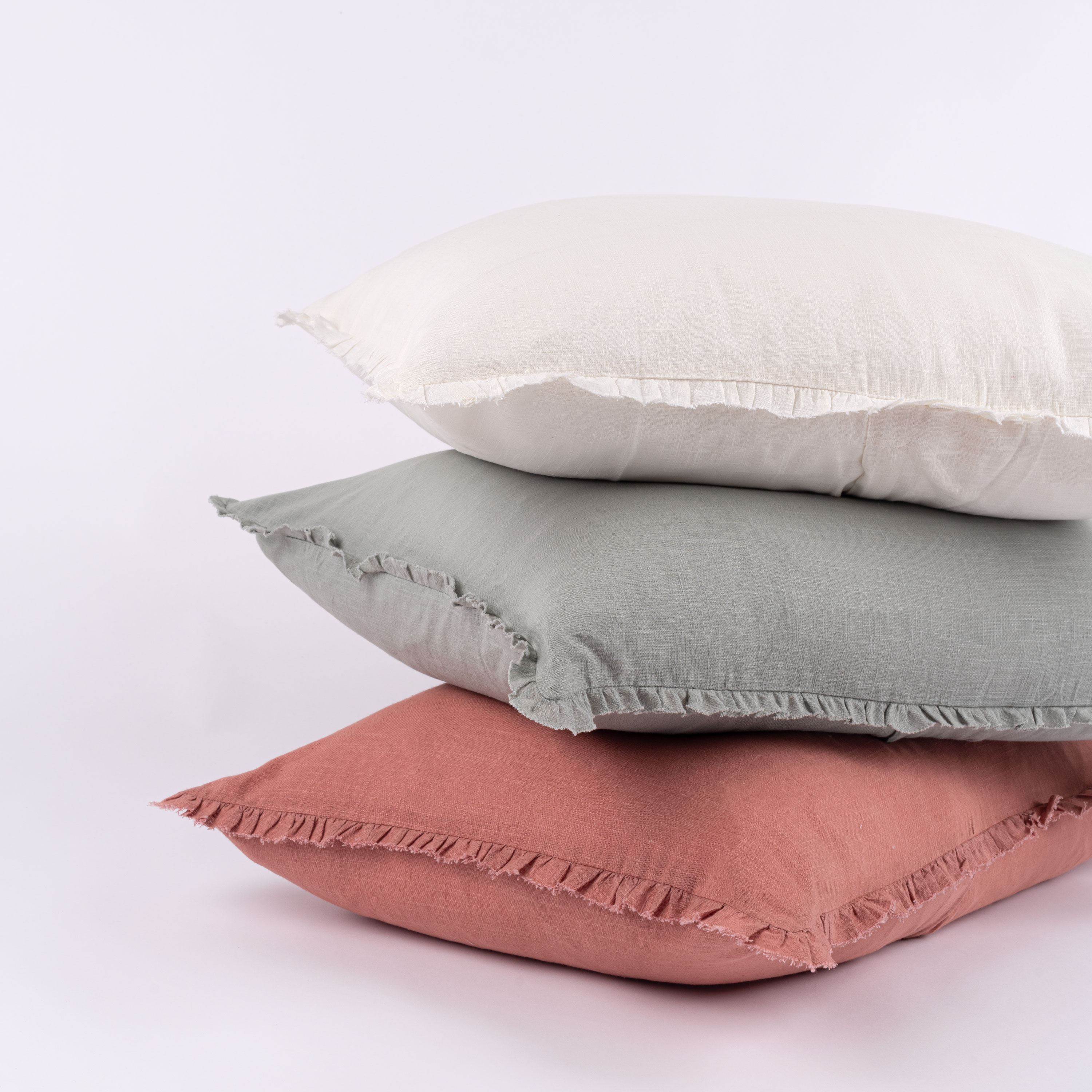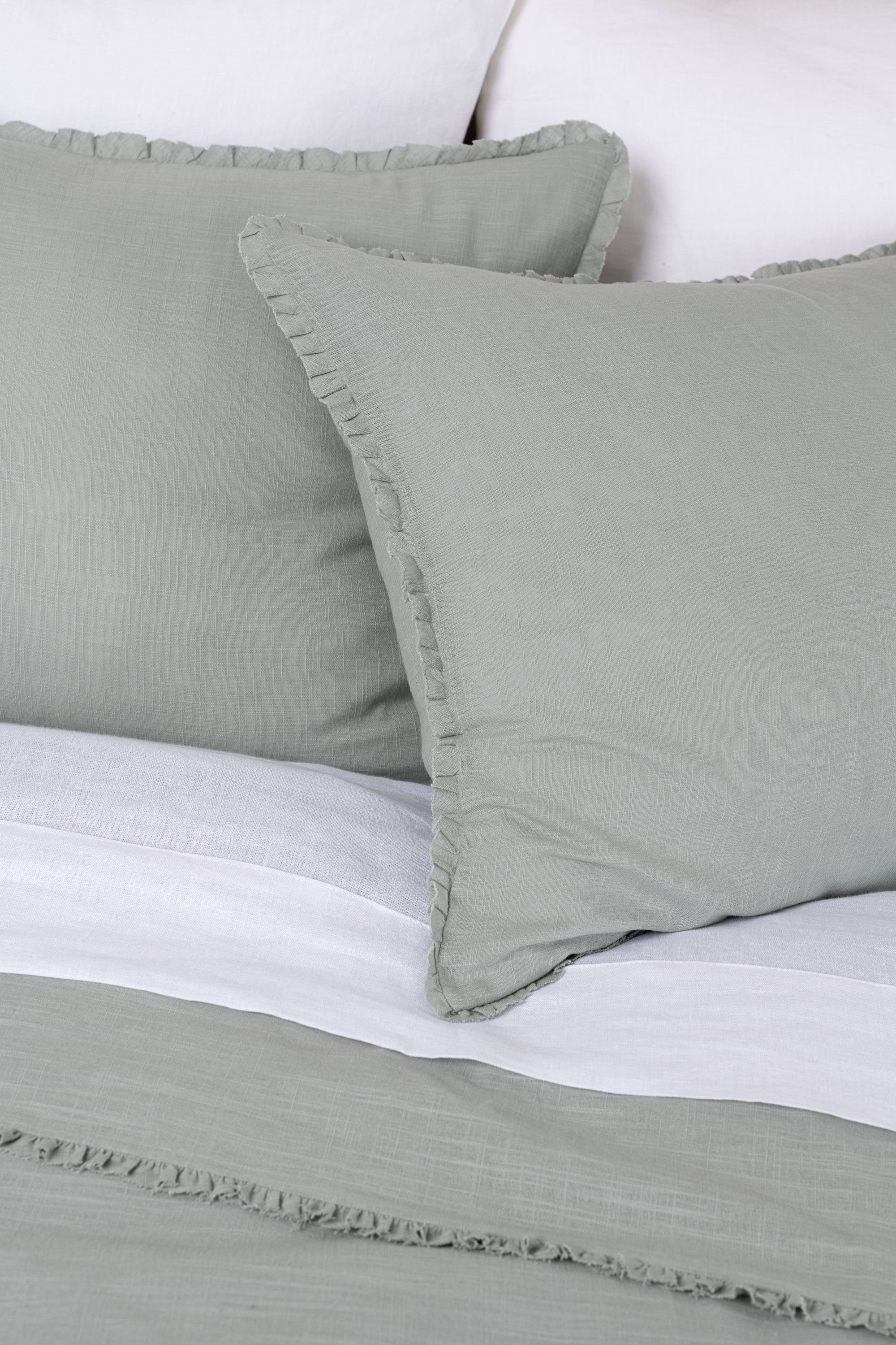 The Sadie duvet cover adds a slight feminine flare with a mini bias cut unfinished ruffled edge. Constructed of 100% cotton, with a delicate slub this collection presents the look of luxurious linen with a moderate price tag. The duvet cover and shams are finished with a ¾” unfinished bias cut ruffle. The duvet has a button enclosure, 4″ flap inside the opening to hide the filler and ties on all 4 sides to keep the comforter from moving. Shams have a button closure centered on the back.