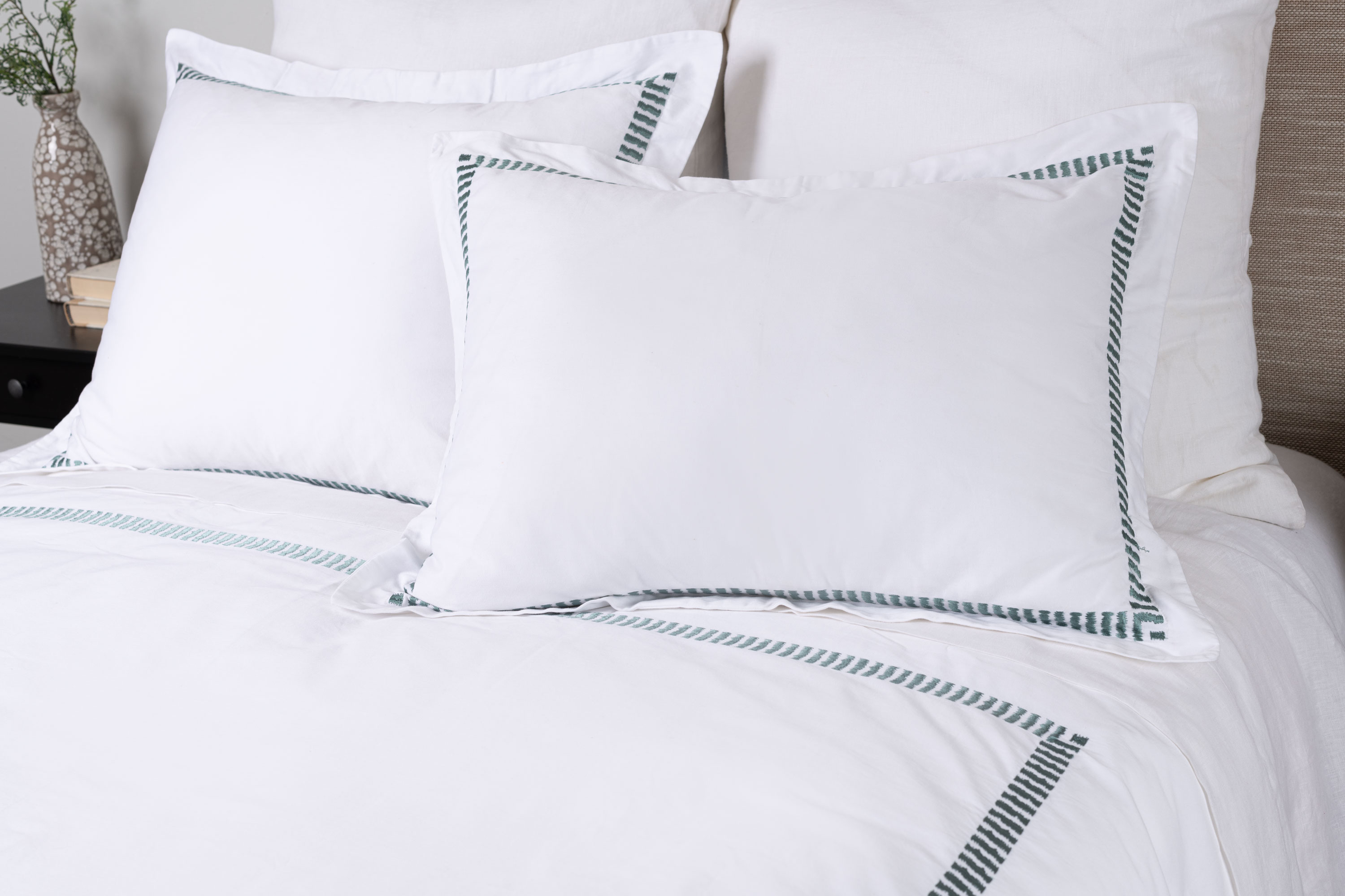 Savona Duvet is simply luxurious, this crisp Cotton Sateen, with a knife edge and embroidered design. The Duvets have button enclosure, 4″ flap inside the opening to hide the filler and ties on all 4 sides to keep the comforter from moving. Shams have 1.5″ straight flange.